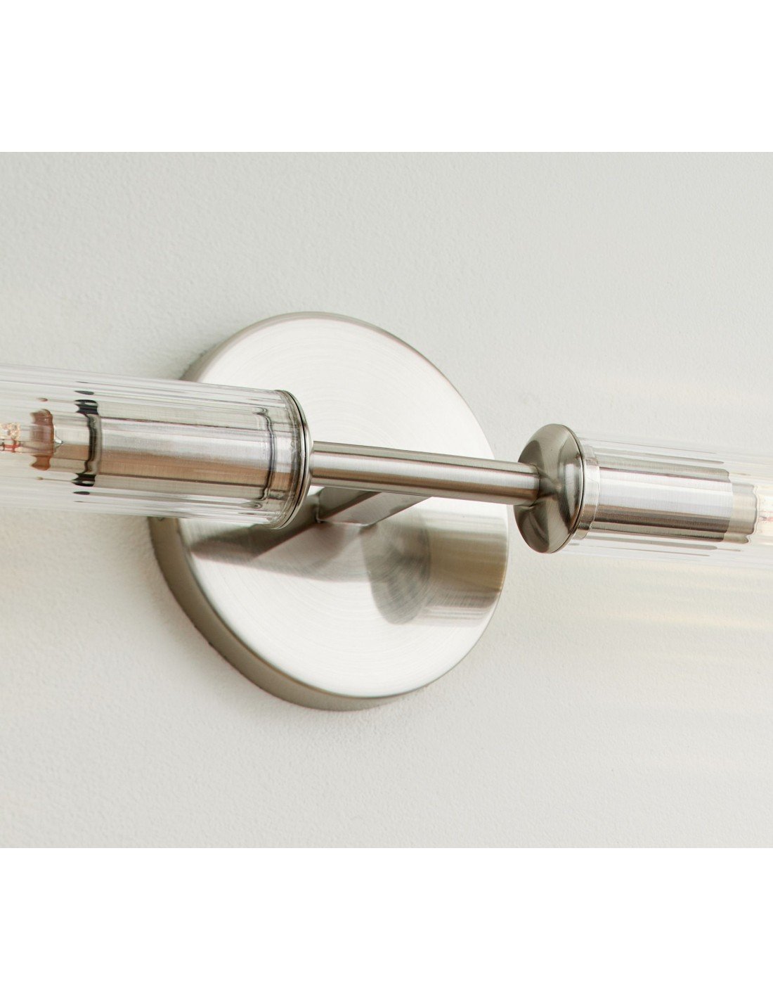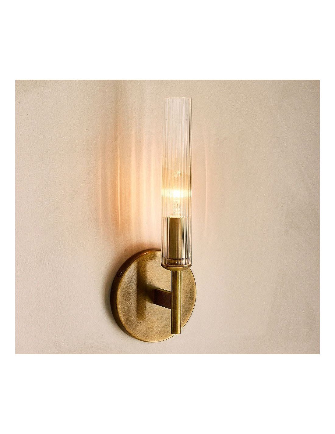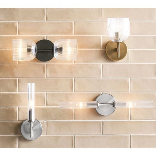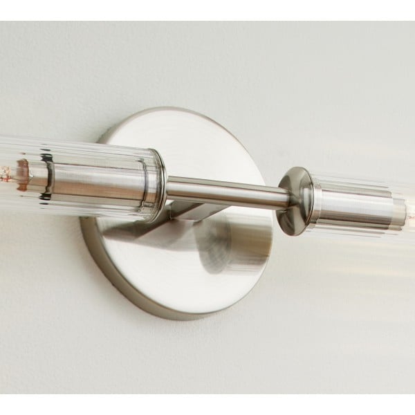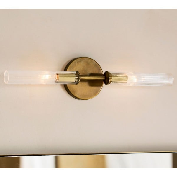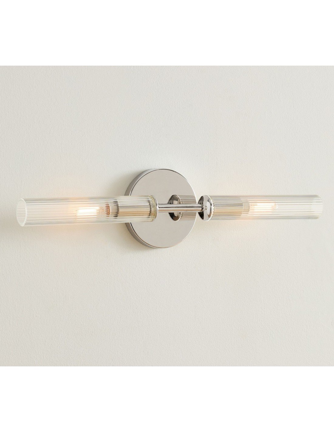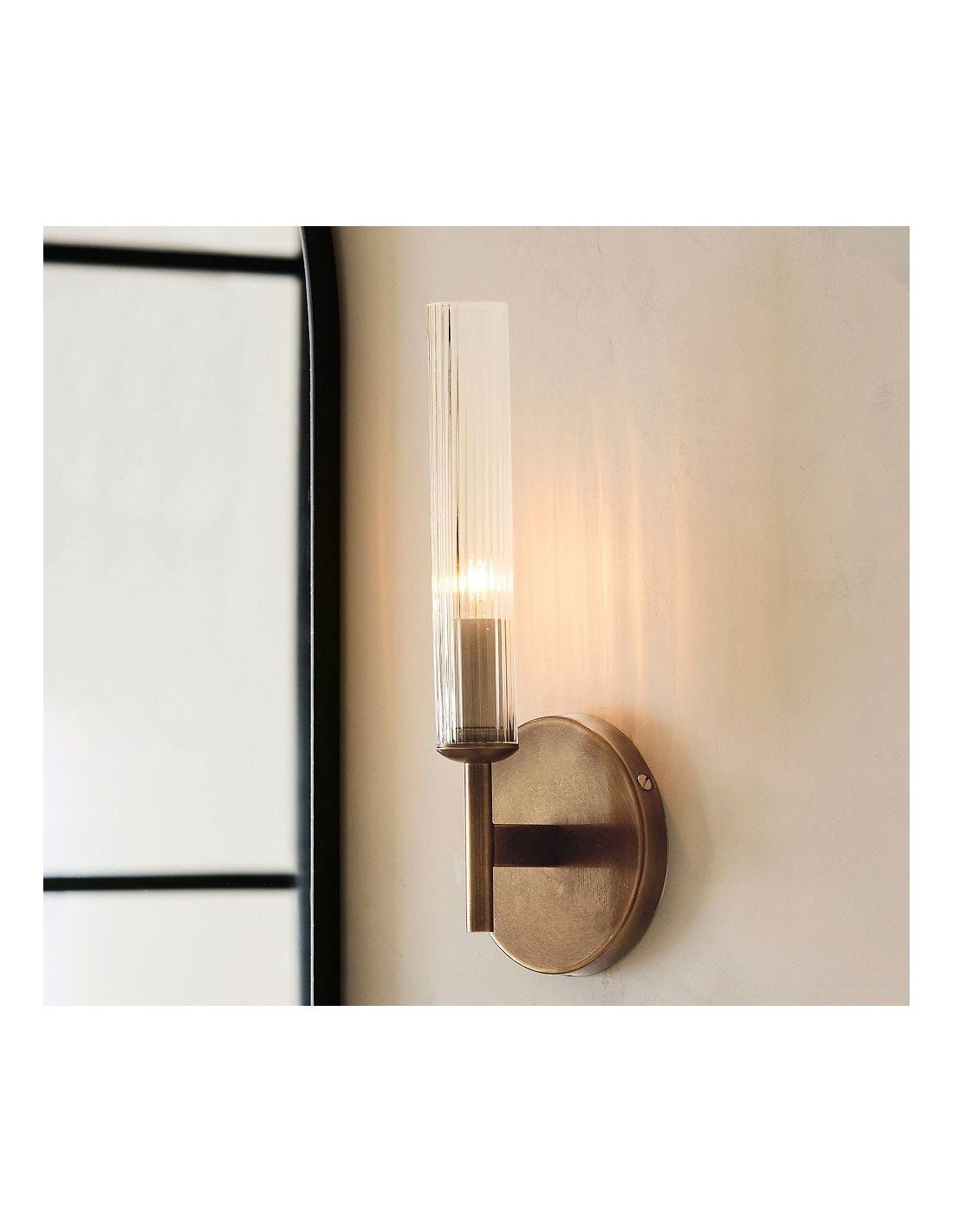 Découvrez l'applique Bravira en verre strié, disponible en tubes simples ou doubles. Fabriquées en fer et disponibles en laiton vieilli, nickel poli, nickel satiné et bronze antique, ces lampes sont dotées d'abat-jour en verre transparent soufflé bouche, parfaits pour les chambres, les couloirs ou les espaces de vie modernes.