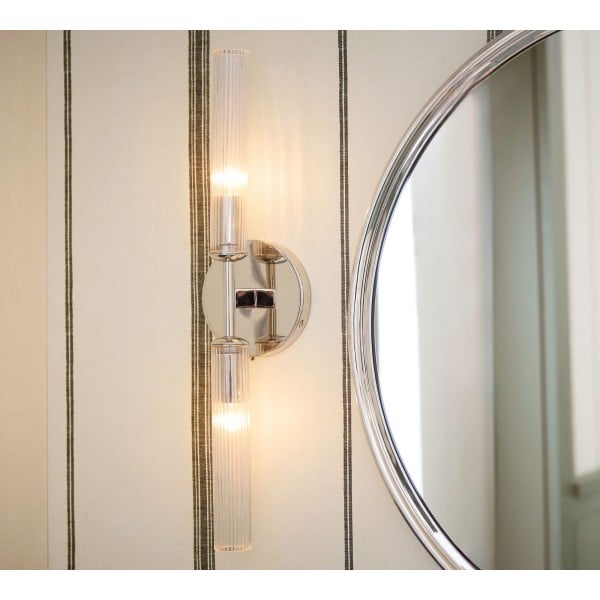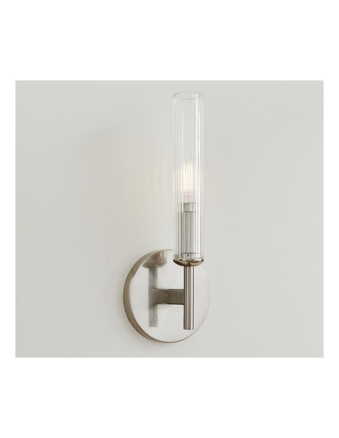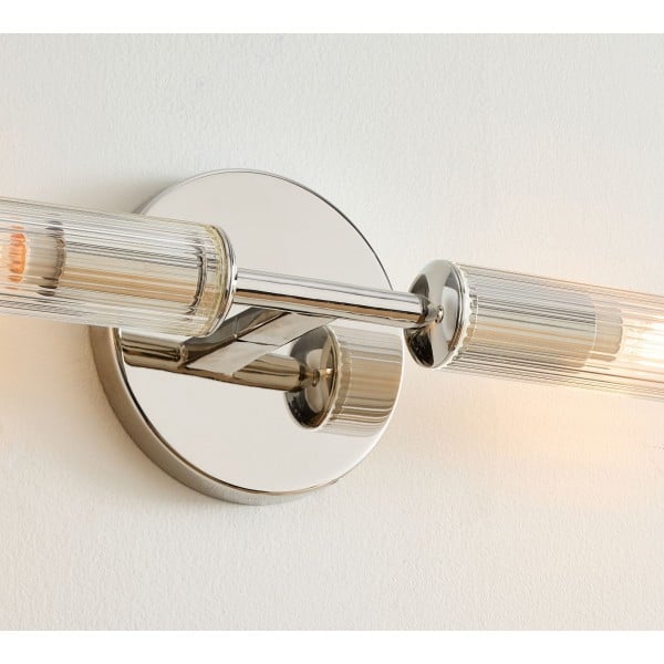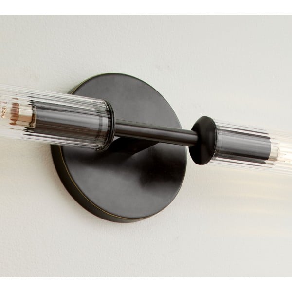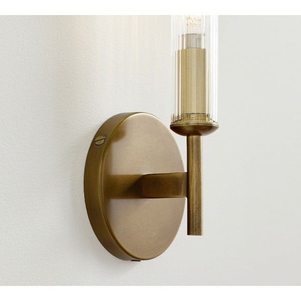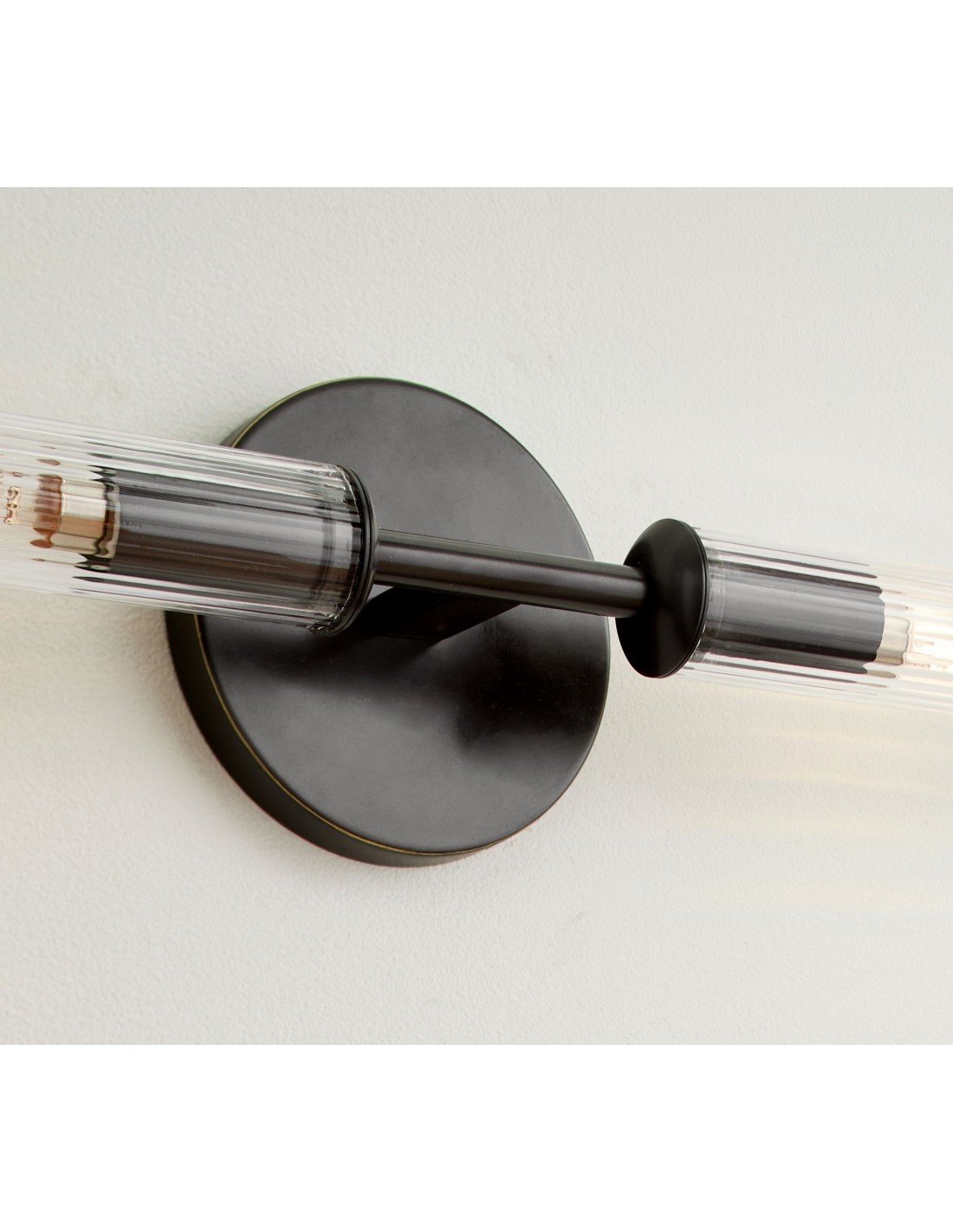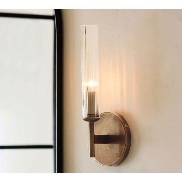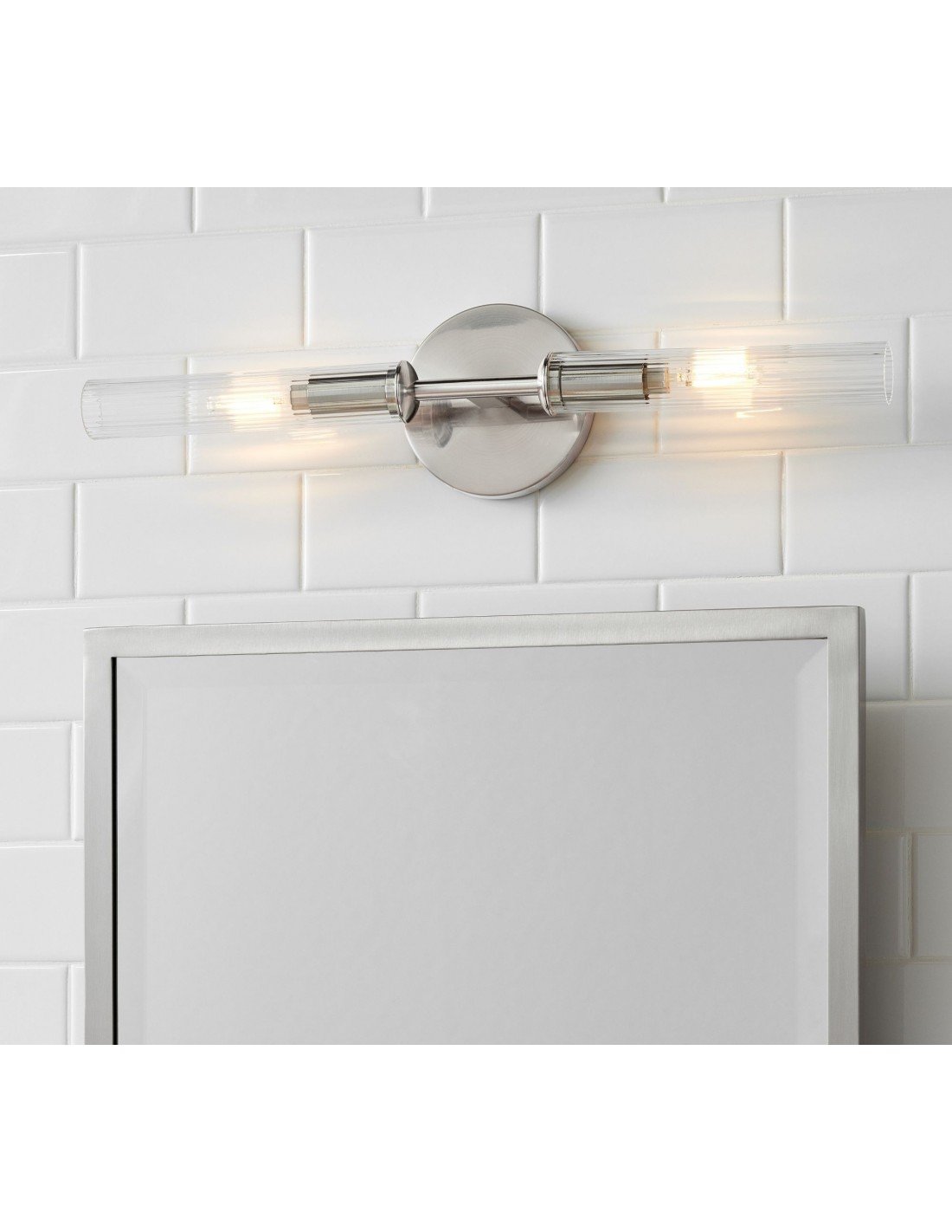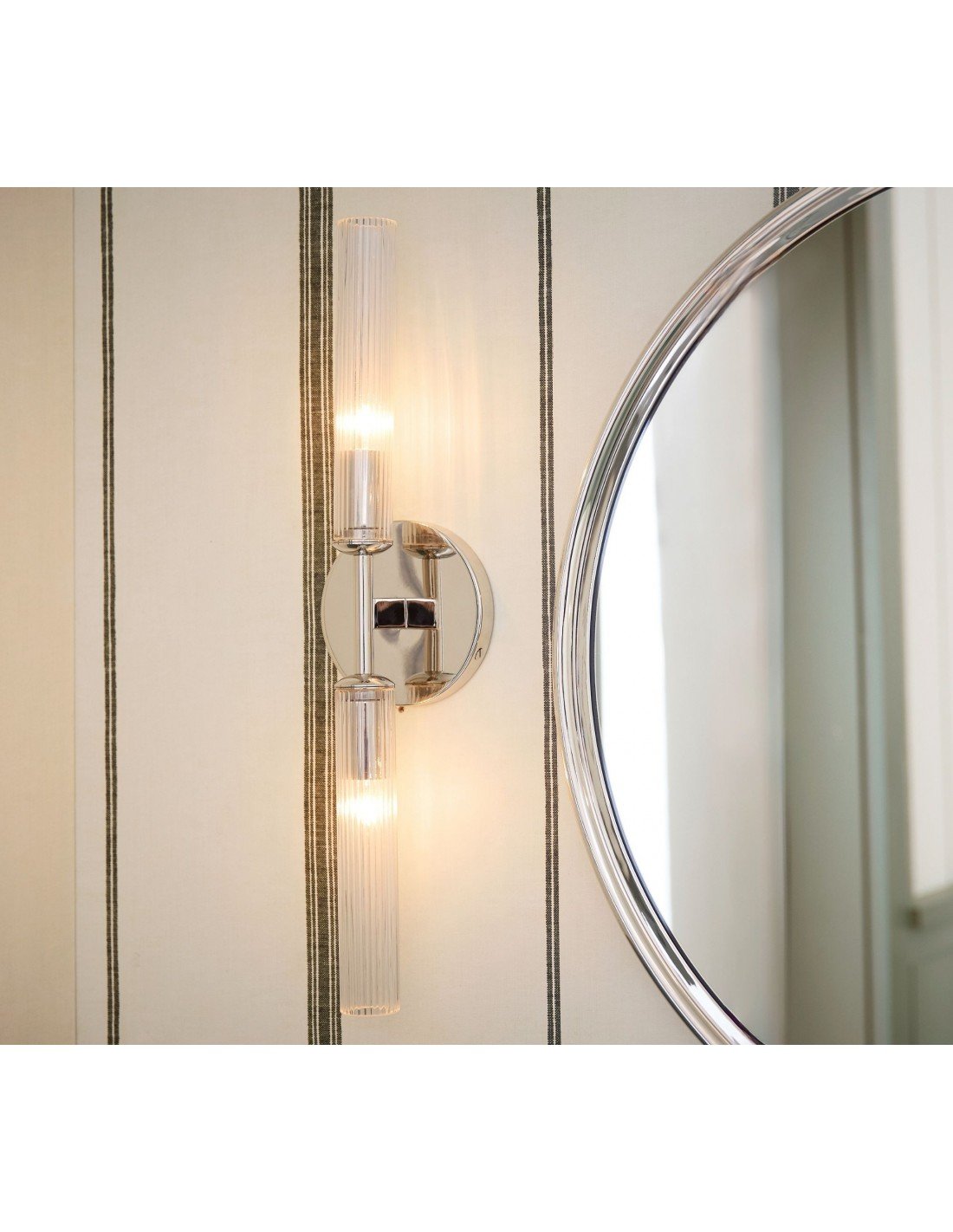 Découvrez l'applique Bravira en verre strié, disponible en tubes simples ou doubles. Fabriquées en fer et disponibles en laiton vieilli, nickel poli, nickel satiné et bronze antique, ces lampes sont dotées d'abat-jour en verre transparent soufflé bouche, parfaits pour les chambres, les couloirs ou les espaces de vie modernes.