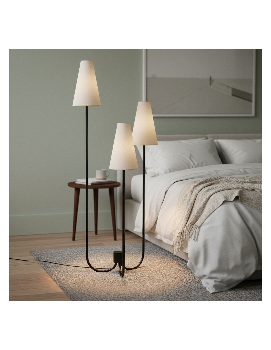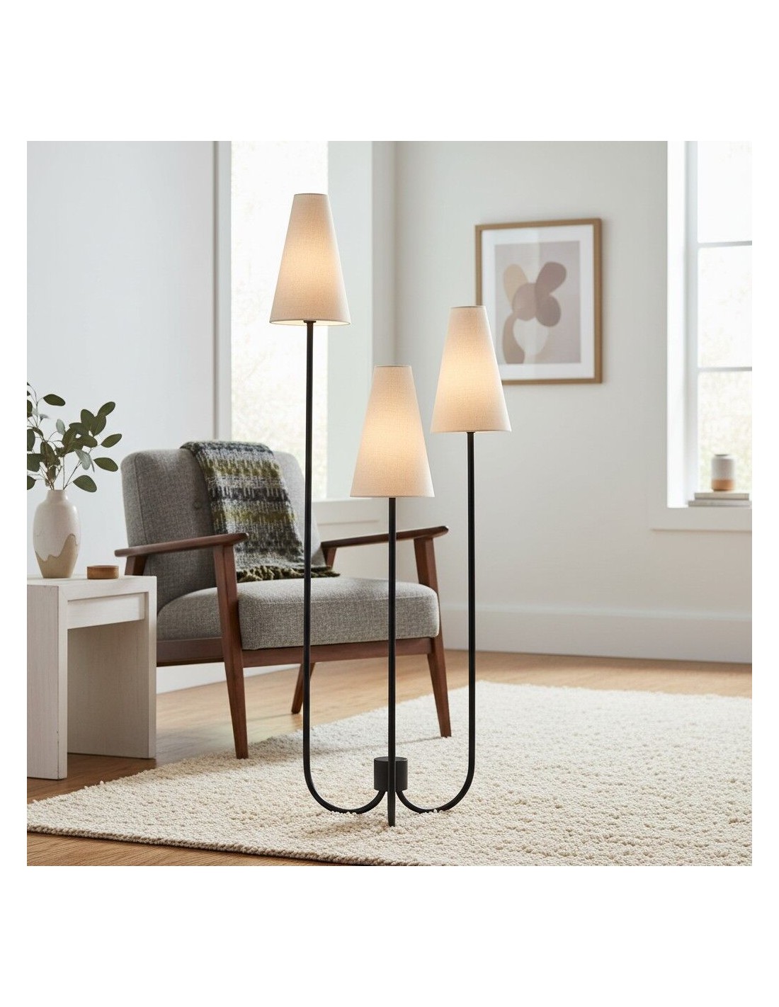 Le lampadaire Cordove à trois lumières associe une fine structure métallique à trois abat-jour coniques et élancés, formant une silhouette sculpturale qui illumine tout espace. Idéal pour les salons, les chambres ou les coins lecture, il s'intègre harmonieusement dans les intérieurs contemporains ou de style transitionnel.