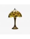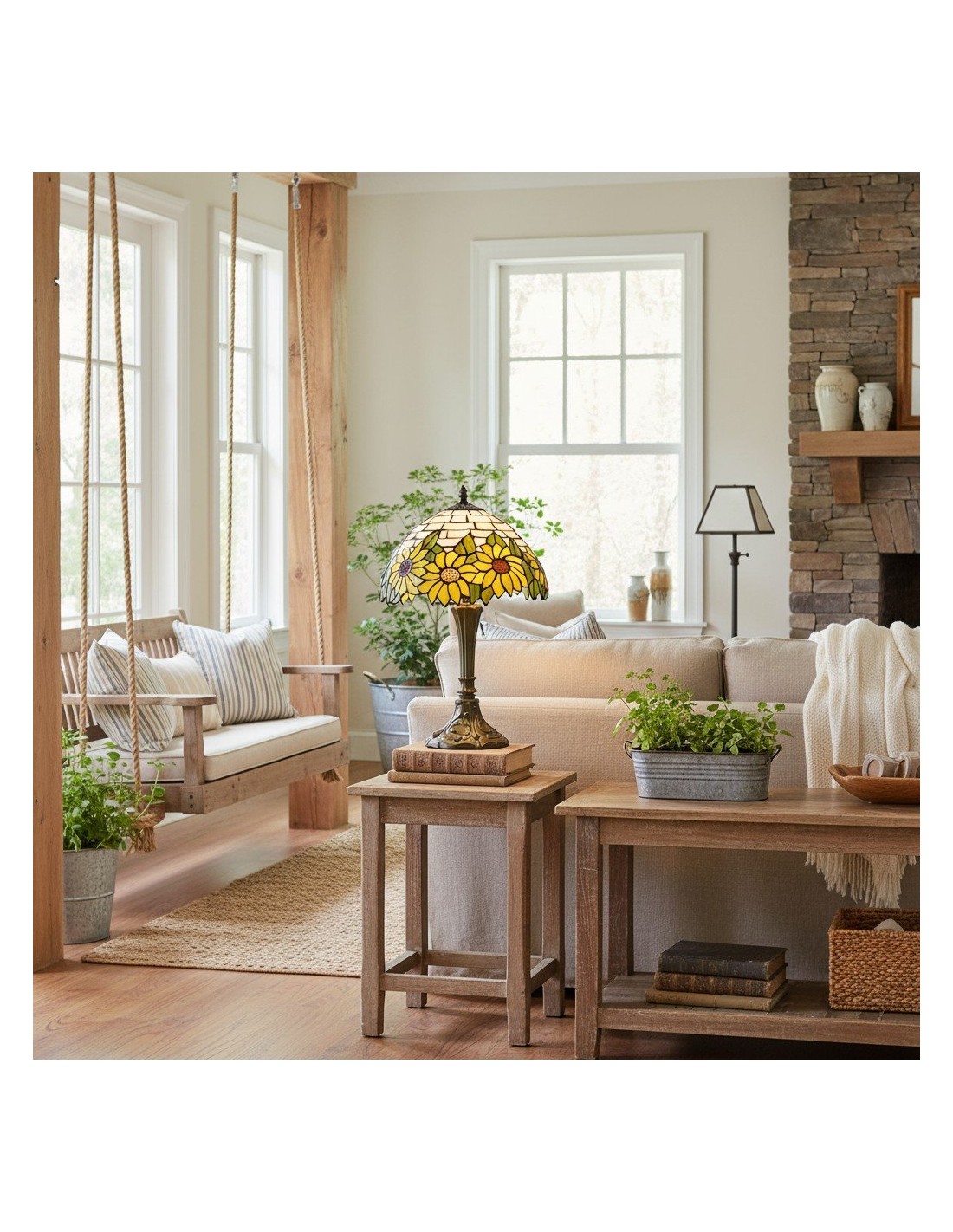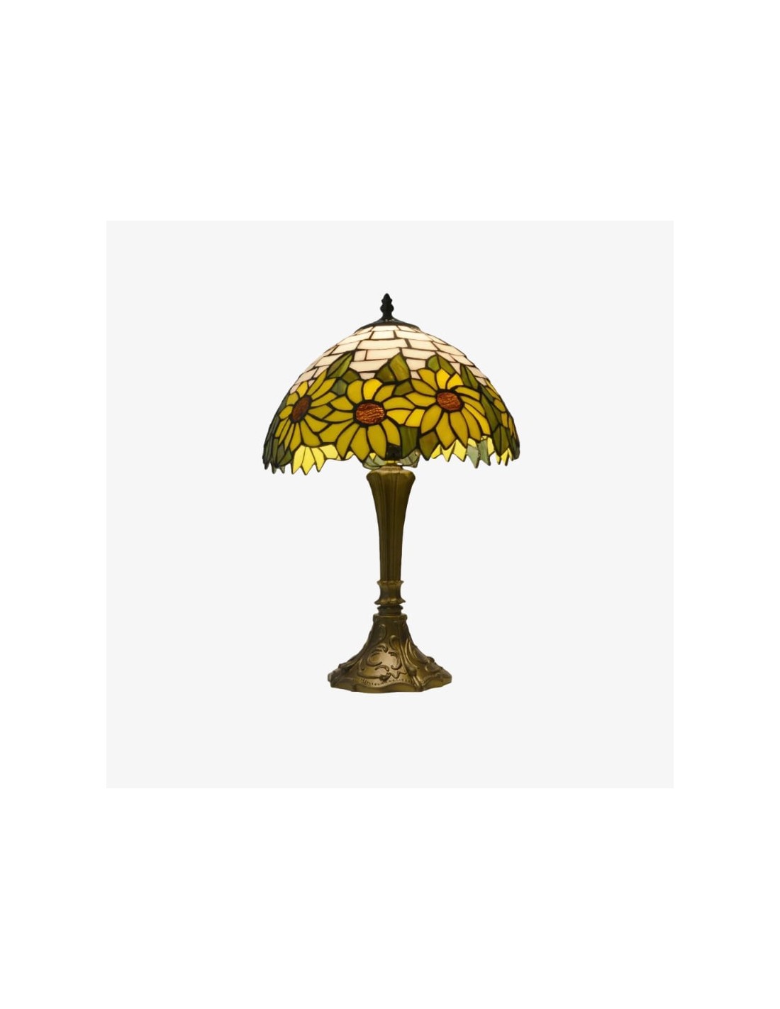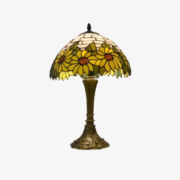 Sa lampe est dotée d'un abat-jour en vitrail aux couleurs vibrantes, inspiré d'un tournesol. Composé de morceaux de verre taillés individuellement et assemblés par une feuille de cuivre, il crée des pétales aux teintes chaudes de jaune et de vert qui s'illuminent d'une riche couleur une fois allumés. Le pied et les ferrures sont assortis au travail du verre, offrant un style à la fois classique et moderne qui s'intègre parfaitement aux intérieurs traditionnels, contemporains et éclectiques.