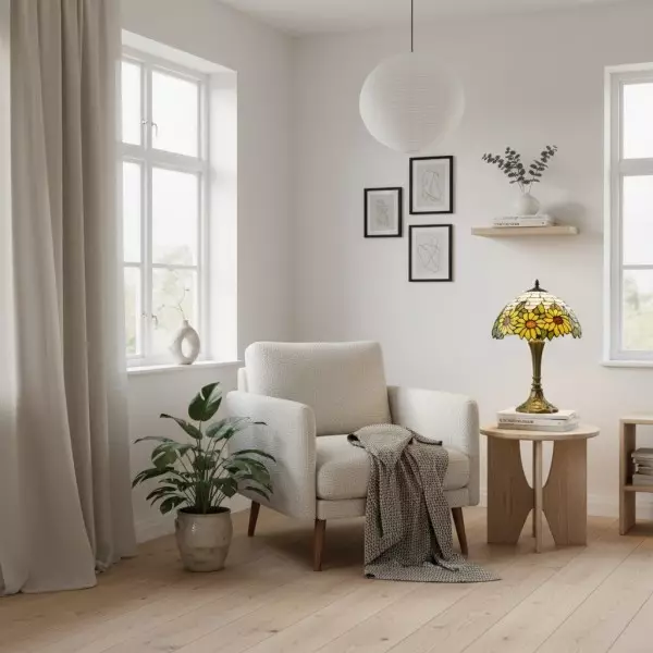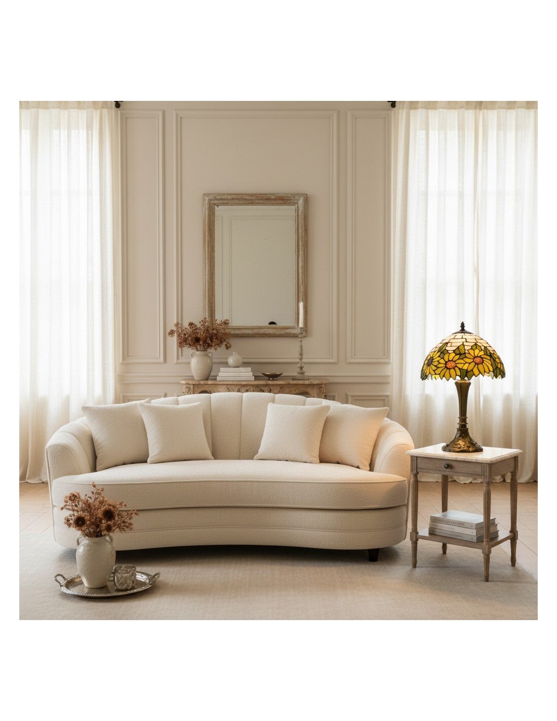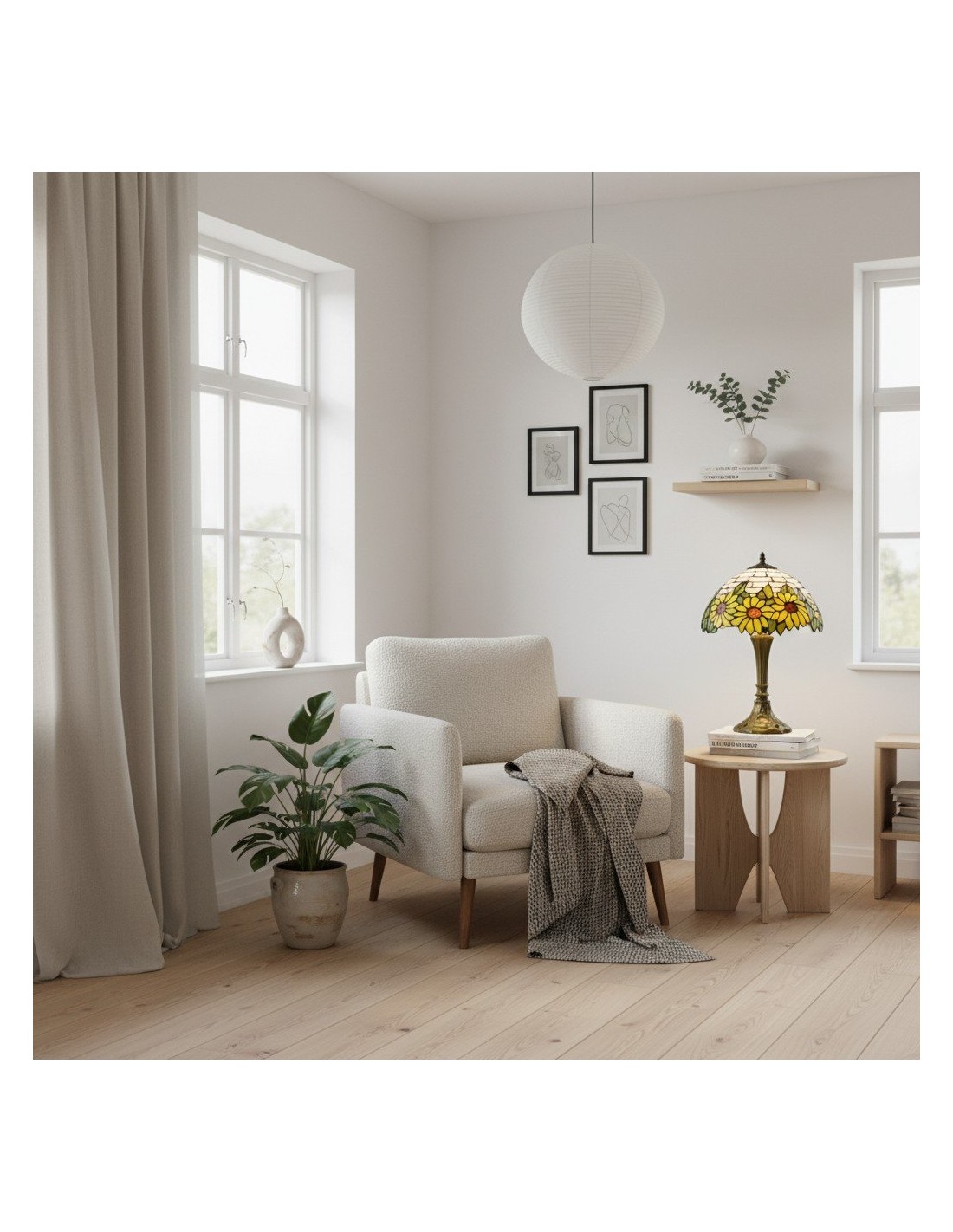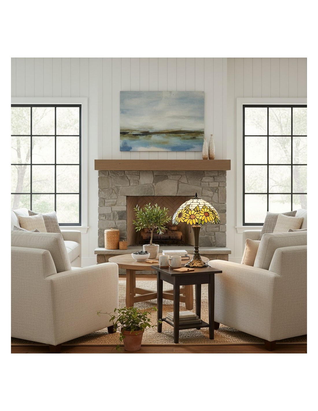 Sa lampe est dotée d'un abat-jour en vitrail aux couleurs vibrantes, inspiré d'un tournesol. Composé de morceaux de verre taillés individuellement et assemblés par une feuille de cuivre, il crée des pétales aux teintes chaudes de jaune et de vert qui s'illuminent d'une riche couleur une fois allumés. Le pied et les ferrures sont assortis au travail du verre, offrant un style à la fois classique et moderne qui s'intègre parfaitement aux intérieurs traditionnels, contemporains et éclectiques.