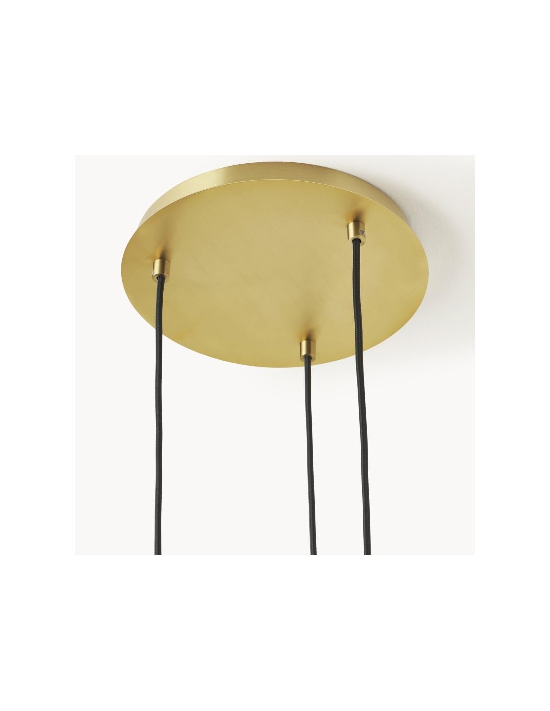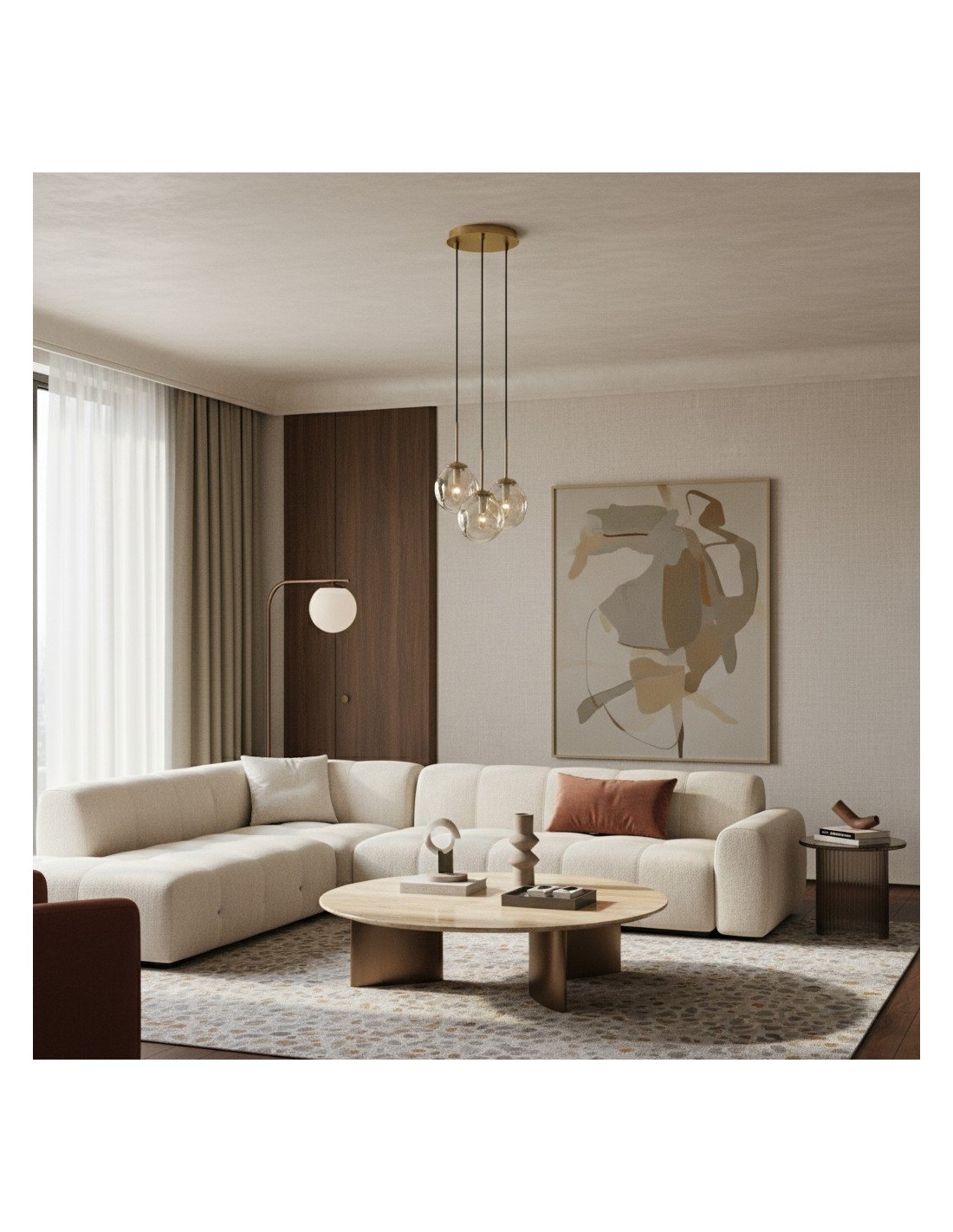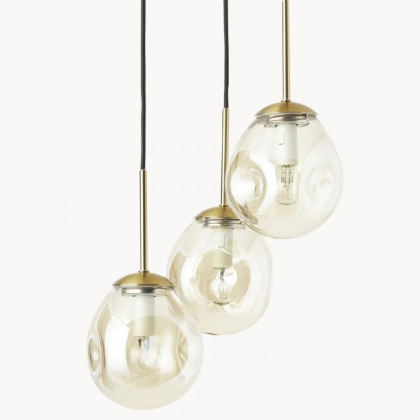 Ce luminaire suspendu dégage une élégance raffinée grâce à sa composition sculpturale de globes en verre doux et arrondis, suspendus à différentes hauteurs. Fabriqué en verre teinté champagne légèrement cabossé et associé à des fixations métalliques élégantes, ce luminaire à plusieurs abat-jour crée une lumière douce et chaleureuse qui sublime tout espace.