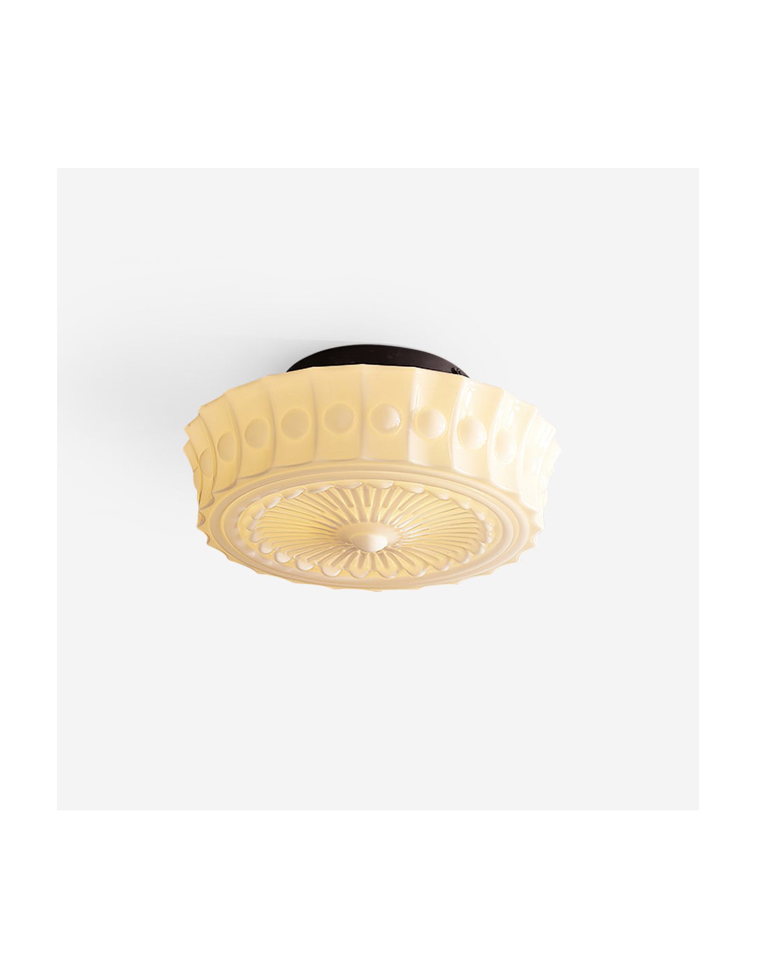Voici le plafonnier vintage en verre de style crème français, un chef-d'œuvre qui allie à merveille l'esthétique classique au design moderne. Ce plafonnier est doté d'un élégant abat-jour en céramique blanc cassé orné de détails sophistiqués et de motifs en relief qui dégagent un charme vintage. Le motif central complexe et les éléments étagés environnants créent un effet visuel époustouflant, projetant une lumière chaude et diffuse qui rehausse l'ambiance de n'importe quelle pièce.