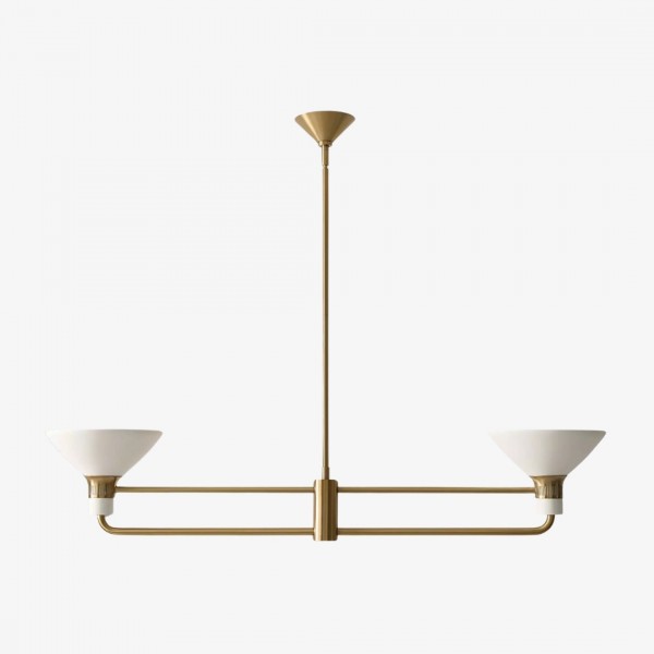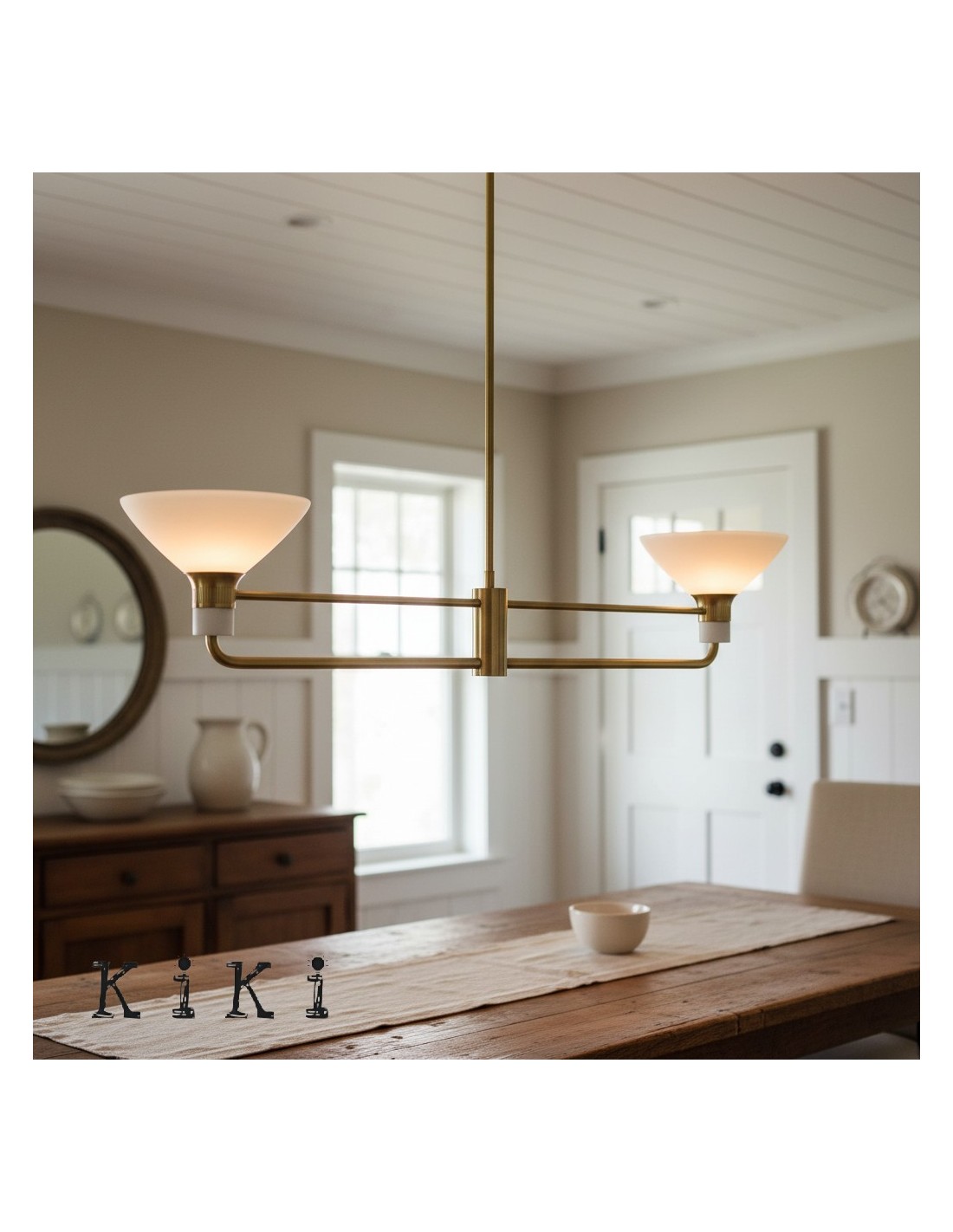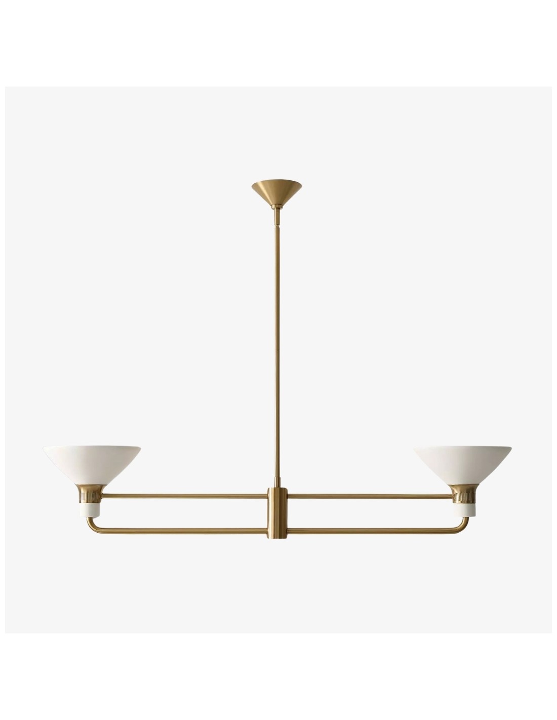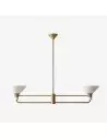 La Lustre Calvor linéaire 2 lumières est un luminaire sophistiqué, combinant des abat-jour en porcelaine ivoire à une structure en métal finition bronze champagne. Cette association de matériaux crée une esthétique à la fois moderne et raffinée, parfaitement équilibrée entre douceur céramique et élégance métallique.