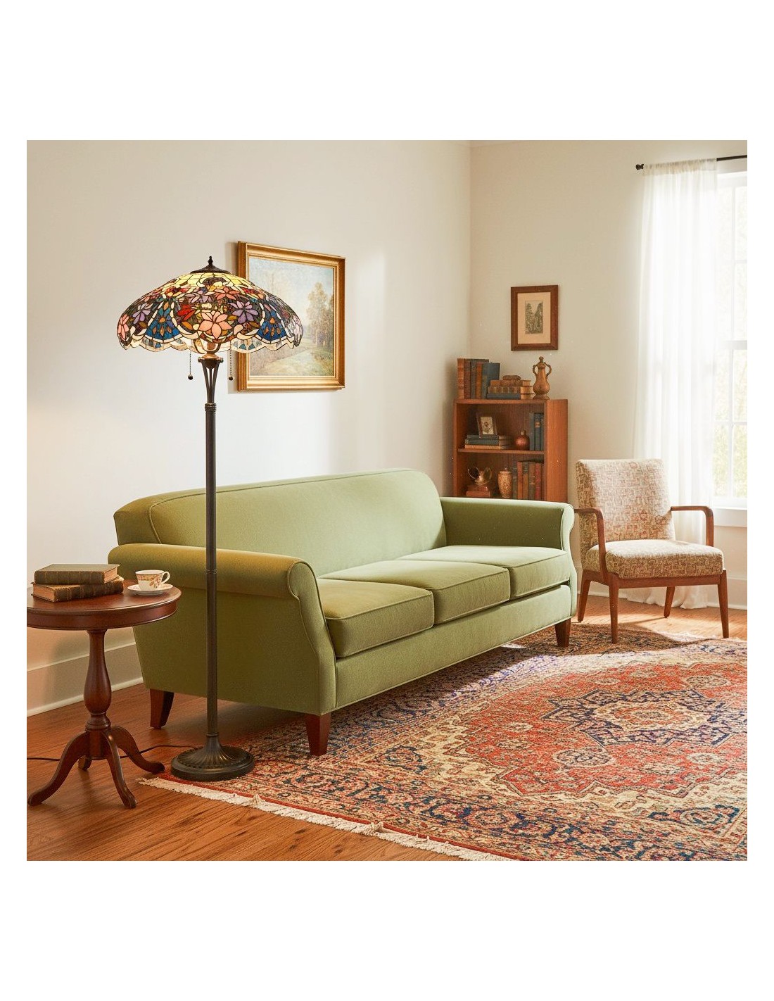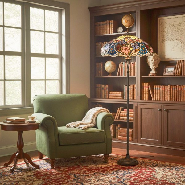 Le lampadaire Sullivan Tiffany est doté d'un abat-jour en vitrail réalisé à la main, orné d'un motif floral complexe. Il diffuse une lumière chaleureuse et peut servir de lampe de lecture raffinée ou d'élément élégant pour votre table de chevet ou votre salon.