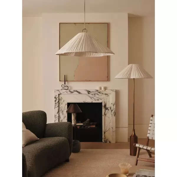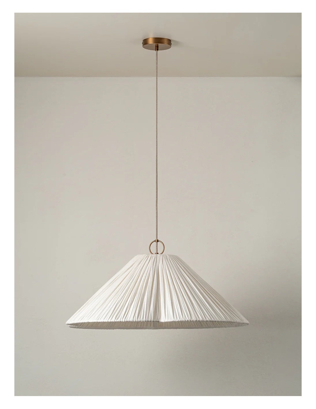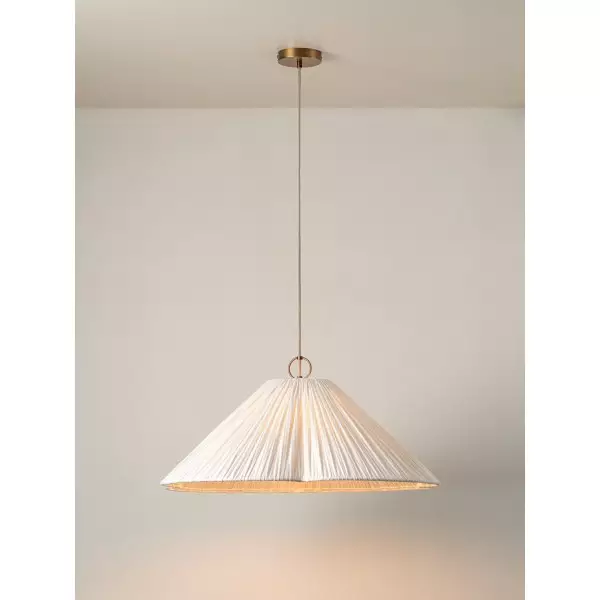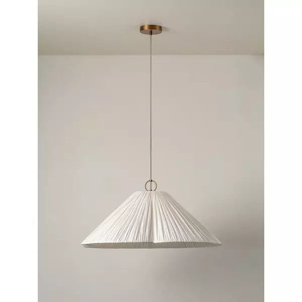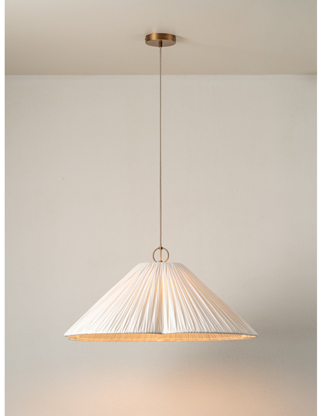 Cette suspension élégante combine style moderne et charme intemporel. Son abat-jour festonné en lin diffuse une lumière douce et chaleureuse, idéale pour créer une ambiance accueillante. La structure en métal finition laiton vieilli apporte une touche de sophistication et de raffinement à tout espace intérieur.