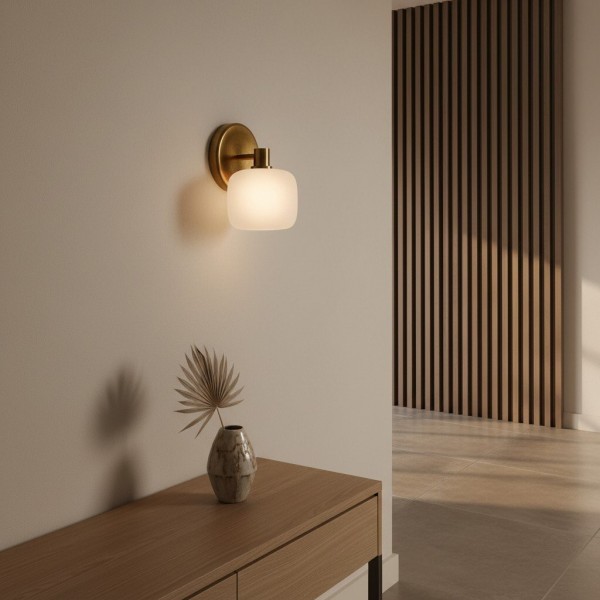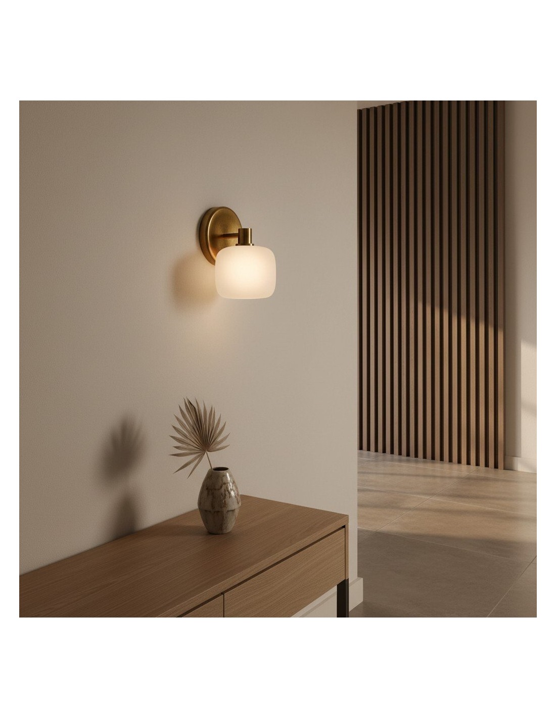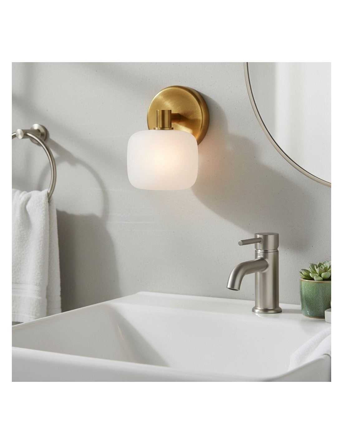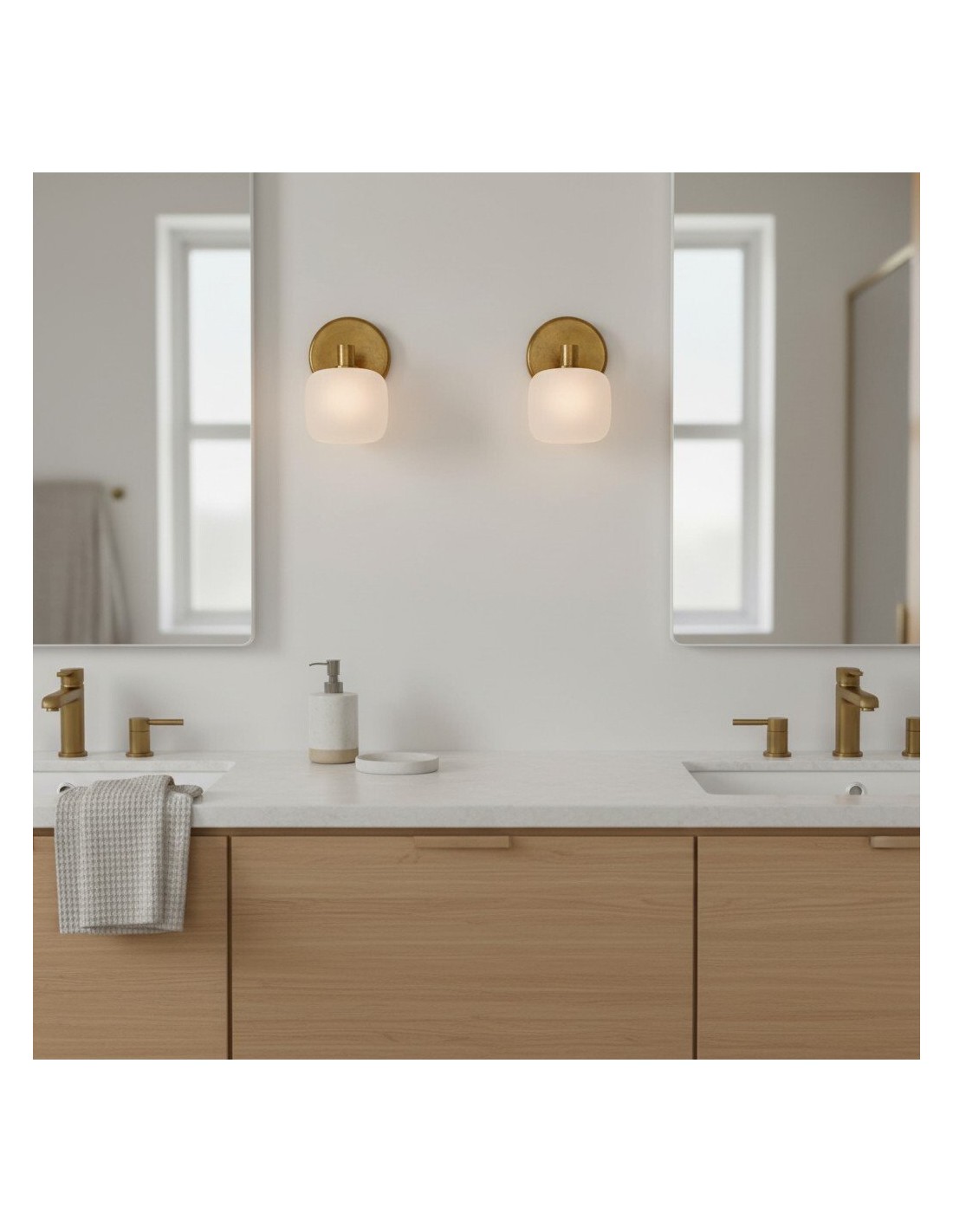 Applique murale raffinée à une seule lumière, associant un pied en laiton à un abat-jour en verre dépoli. Le verre dépoli souligne un abat-jour cylindrique lisse qui met en valeur la finition en laiton poli. Idéale pour les couloirs, les salles de bains, les chambres et les salons.
