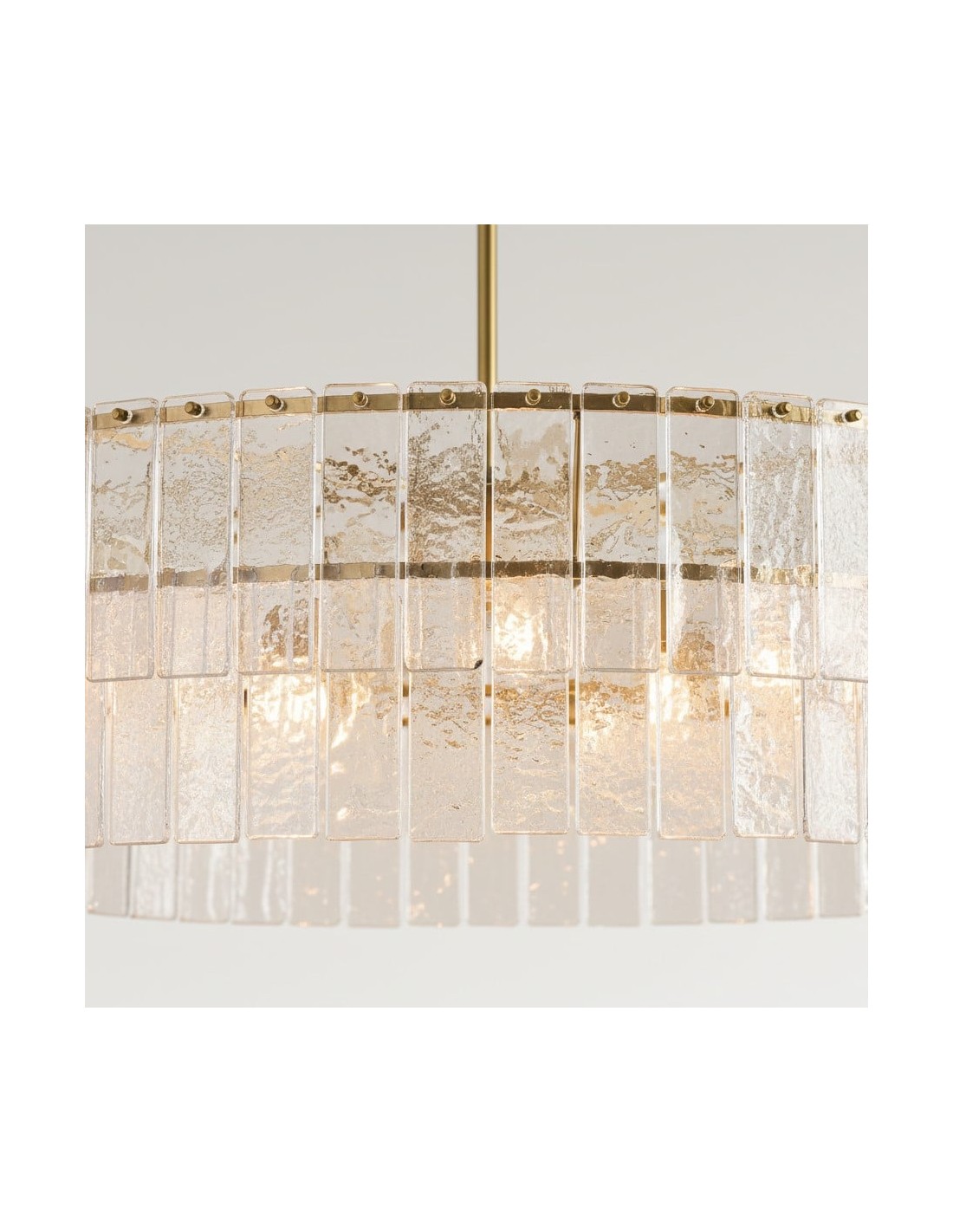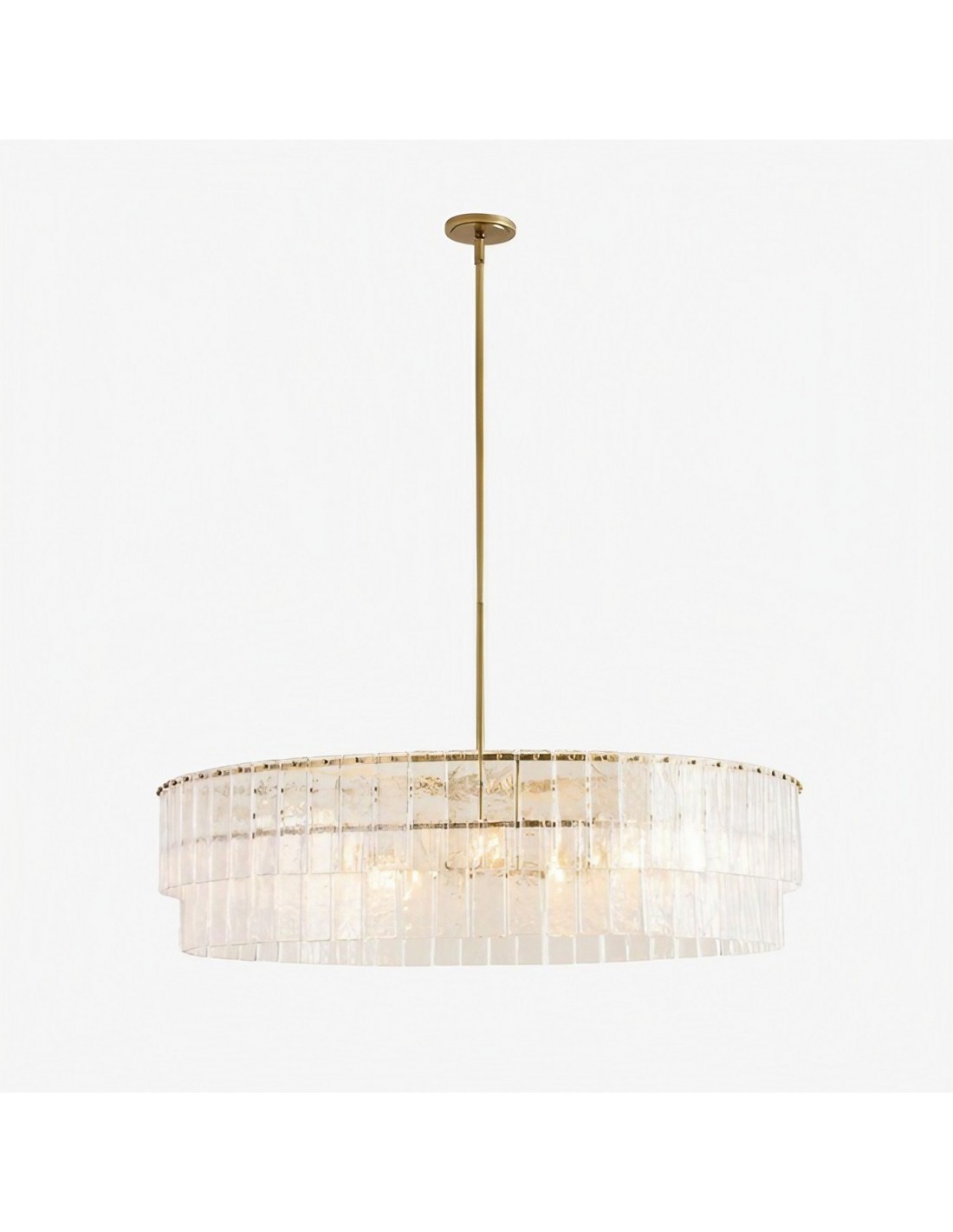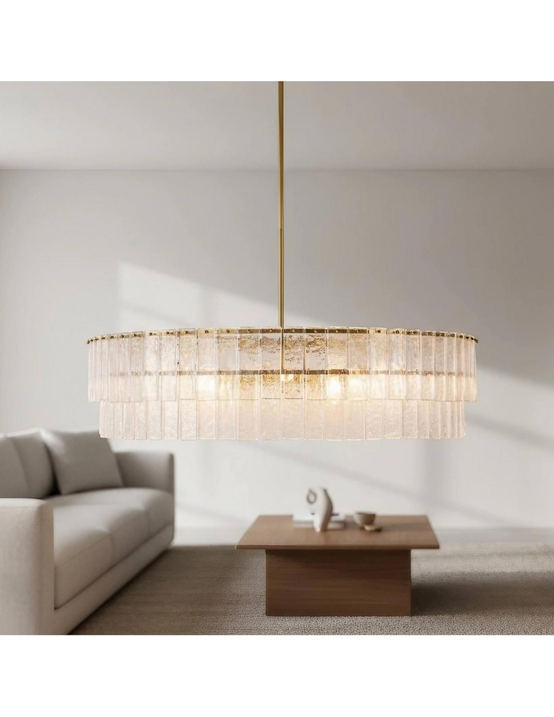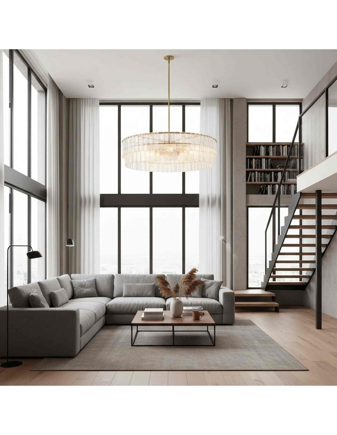 Le lustre Lumvey incarne le luxe moderne avec une touche Art déco. Sa structure ronde à plusieurs niveaux est composée de prismes en verre coulés individuellement qui réfractent la lumière, créant un effet scintillant évoquant l'eau. Soutenu par une élégante armature métallique, il apporte une touche spectaculaire aux entrées, salles à manger ou salons.