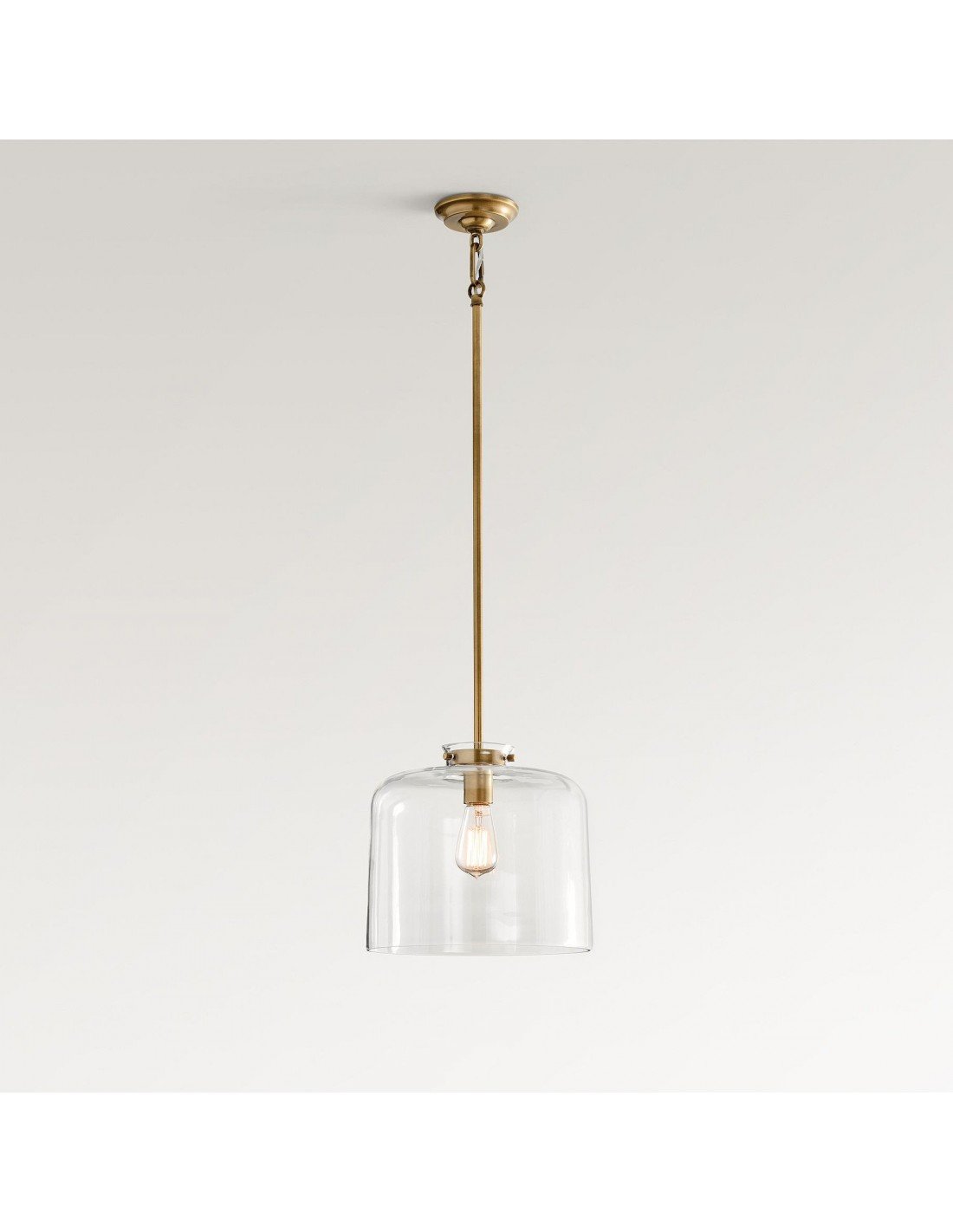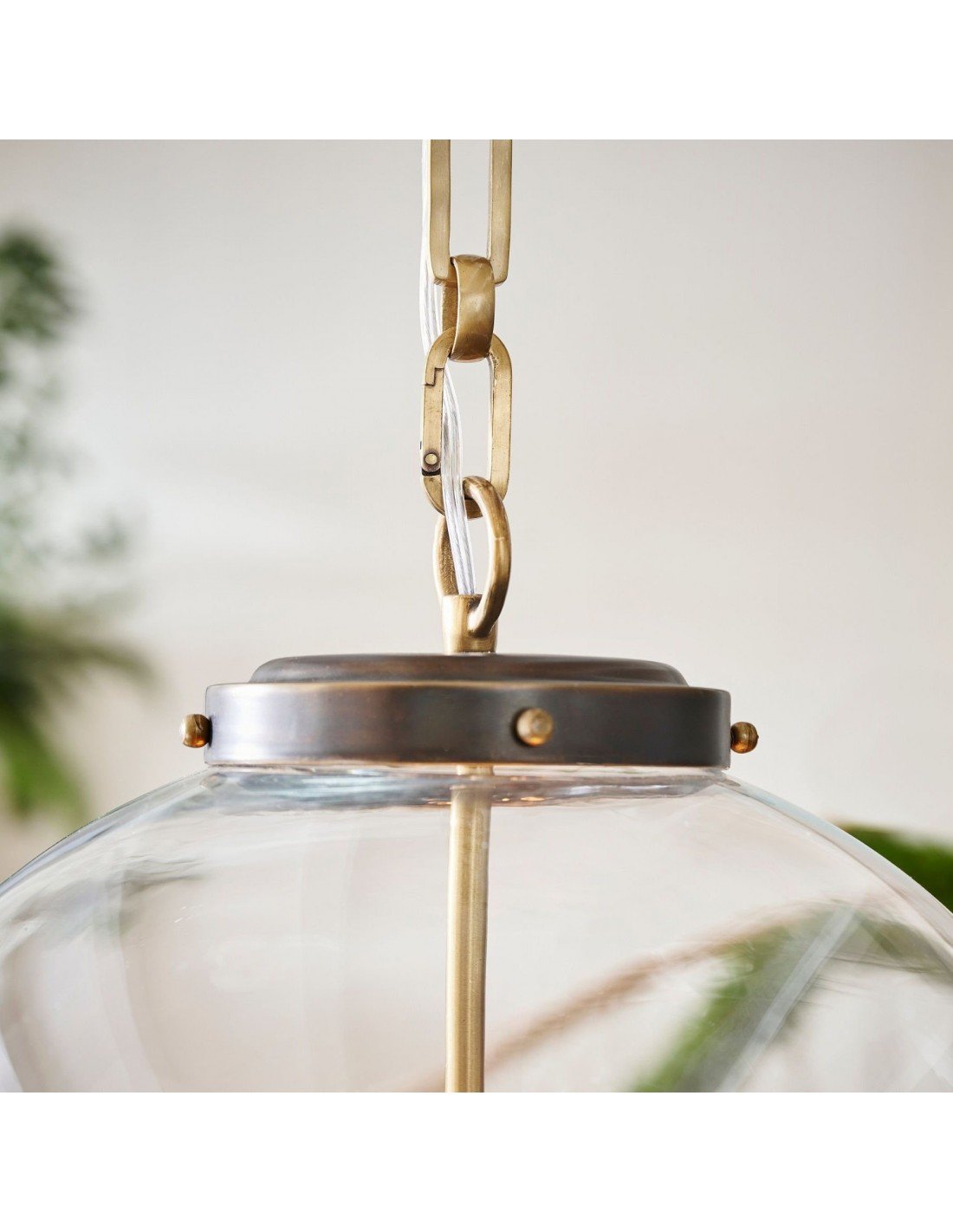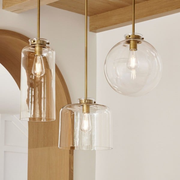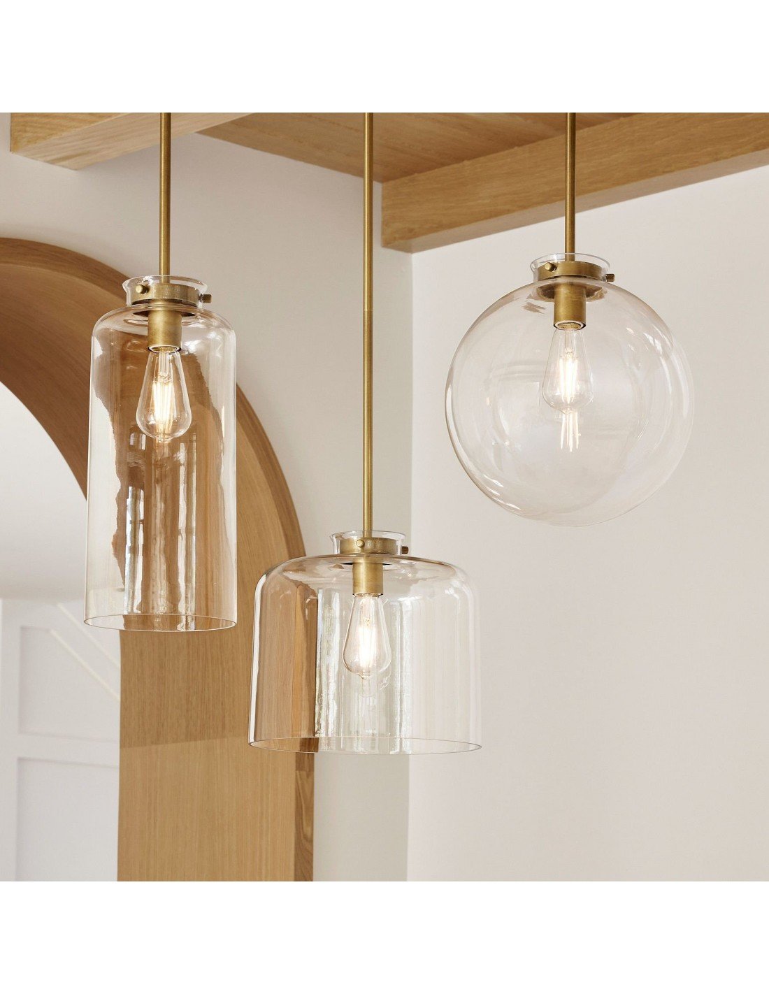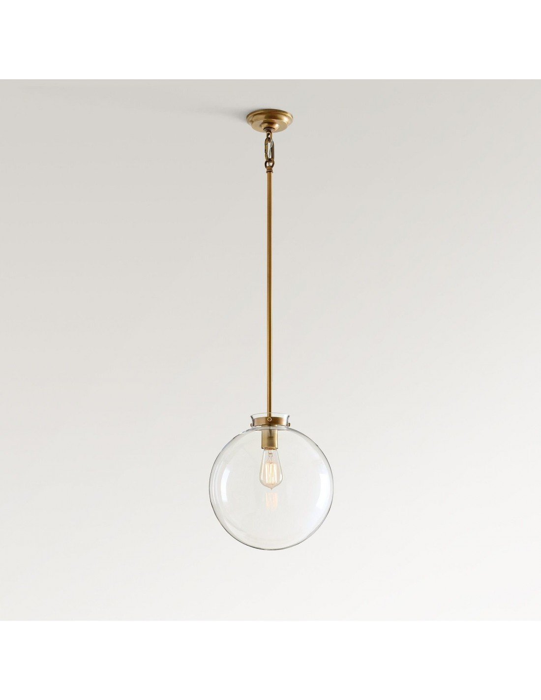 Découvrez la collection de suspensions globe en verre recyclé, comprenant des suspensions globe, dôme et cylindre en verre. Chaque suspension est fabriquée en laiton et possède des abat-jour en verre transparent soufflé bouche, avec une finition laiton vintage. Parfaites pour les intérieurs modernes, elles s'intègrent parfaitement aux cuisines, salles à manger et couloirs.