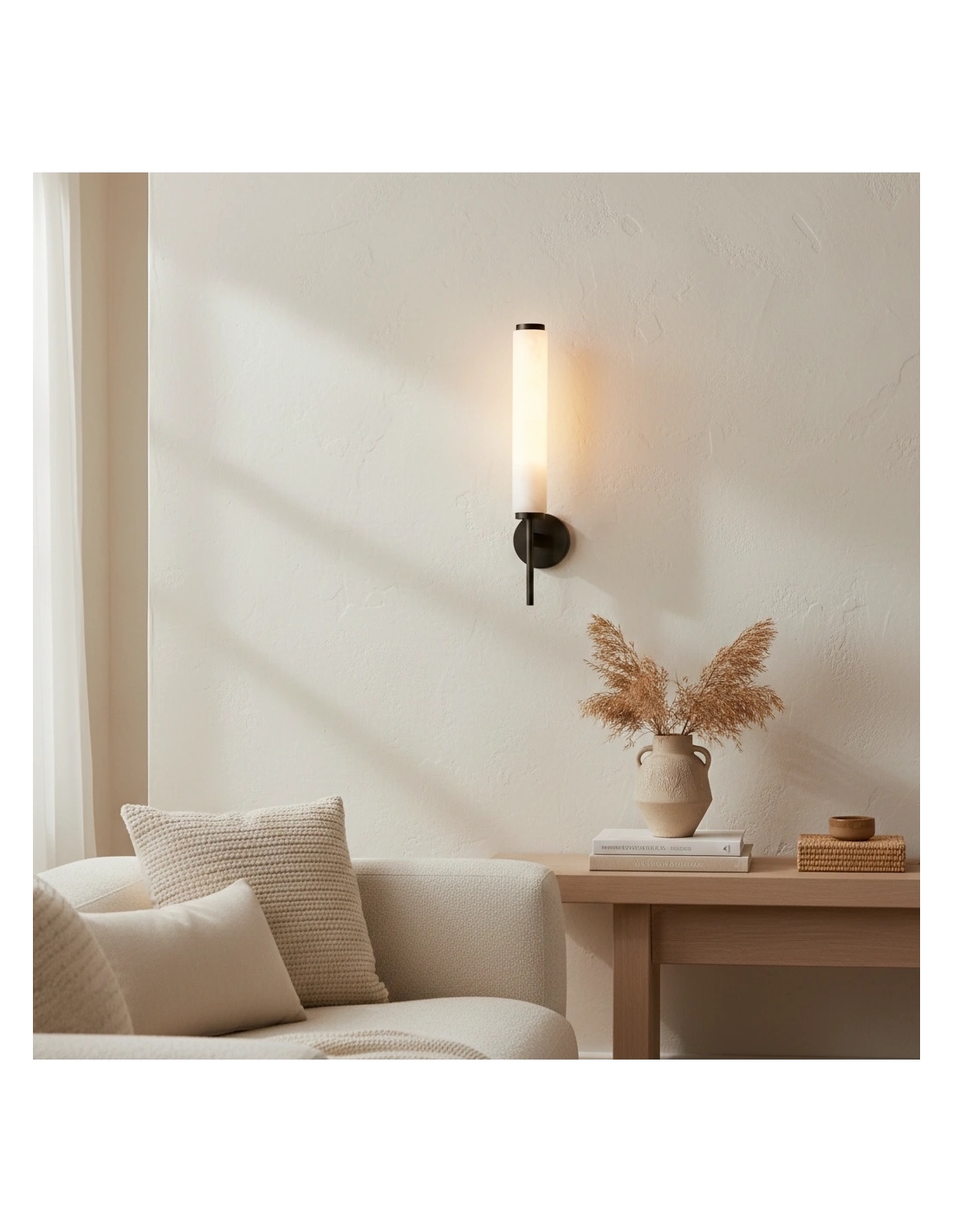 Le charme élégant de l'applique murale Solaryx réside dans son bras raffiné : un socle solidement fixé assure un support stable à l'abat-jour cylindrique fin et opaque. Cette applique minimaliste, avec son abat-jour blanc doux, diffuse une lumière chaleureuse, créant sans effort une ambiance cosy et confortable.