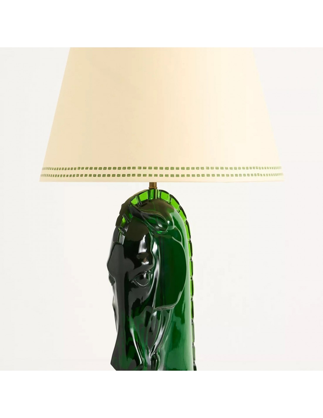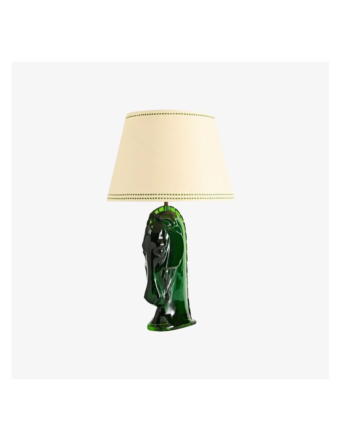 Cette lampe de table sculpturale présente un pied stylisé en forme de tête de cheval, réalisé en résine translucide et diffusant une douce lumière. Surmontée d'un abat-jour en carton teint à la main, elle apporte une touche artistique et une lumière tamisée aux salons, chambres ou espaces de travail, s'imposant comme une pièce maîtresse originale.
