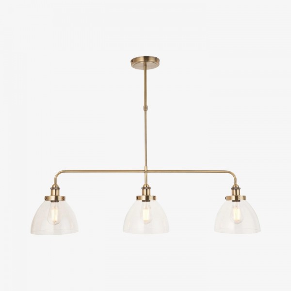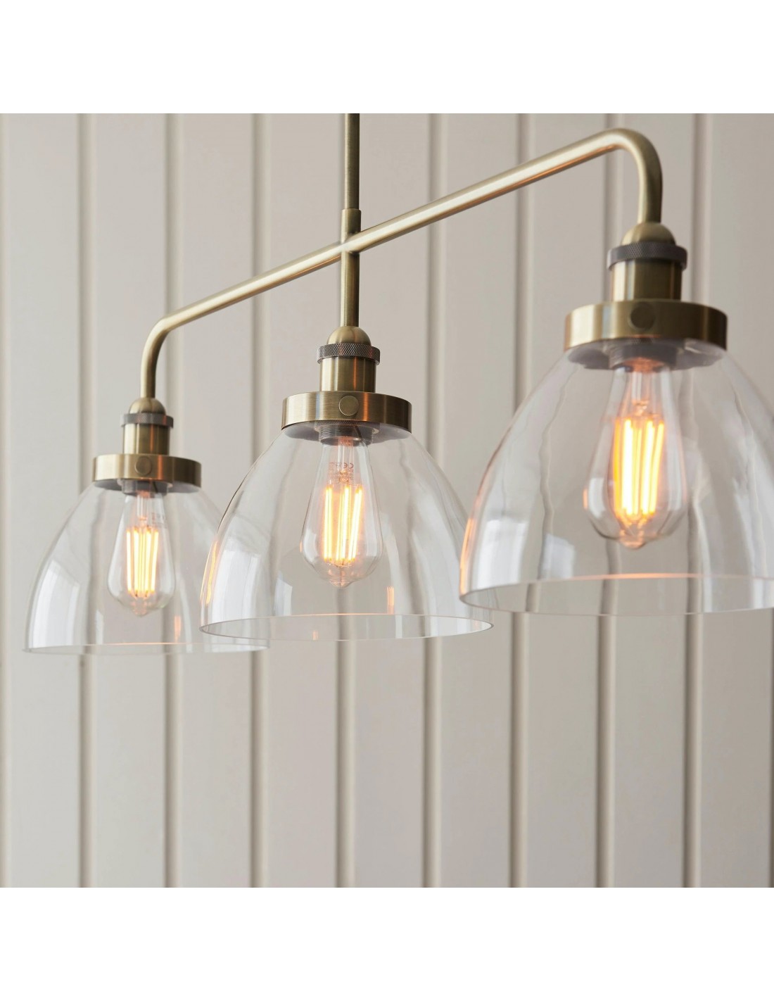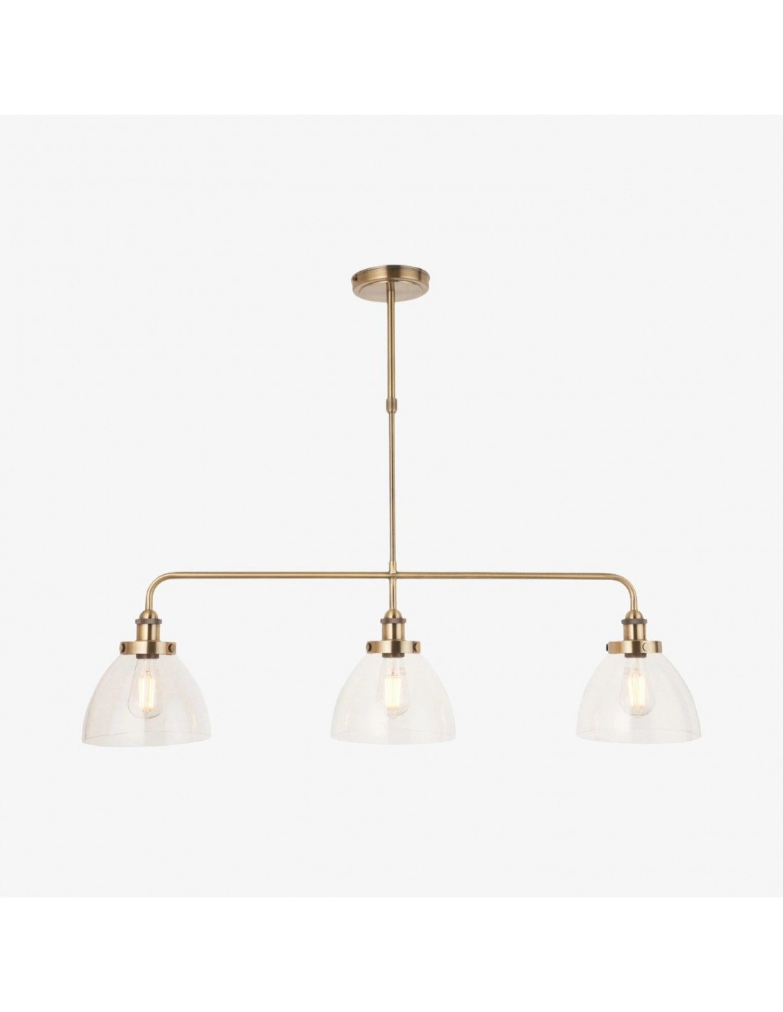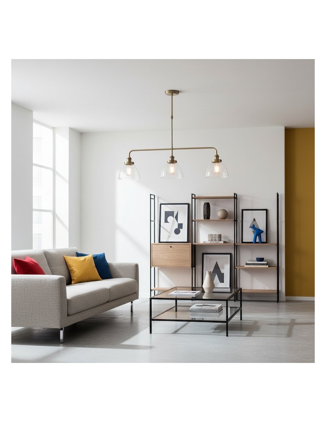 Apportez une touche d'originalité à votre cuisine ou salle à manger avec cette suspension linéaire à trois lumières de style industriel. Sa fine structure, ses détails métalliques et ses abat-jour en verre transparent laissent apparaître des ampoules à filament décoratives qui diffusent une lumière chaleureuse et pleine de caractère. Idéale au-dessus d'un îlot central, d'un bar ou d'une table à manger dans un intérieur moderne ou de type loft.