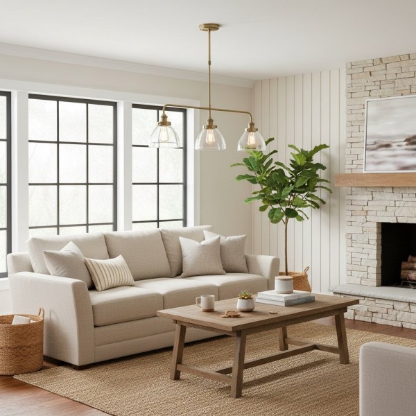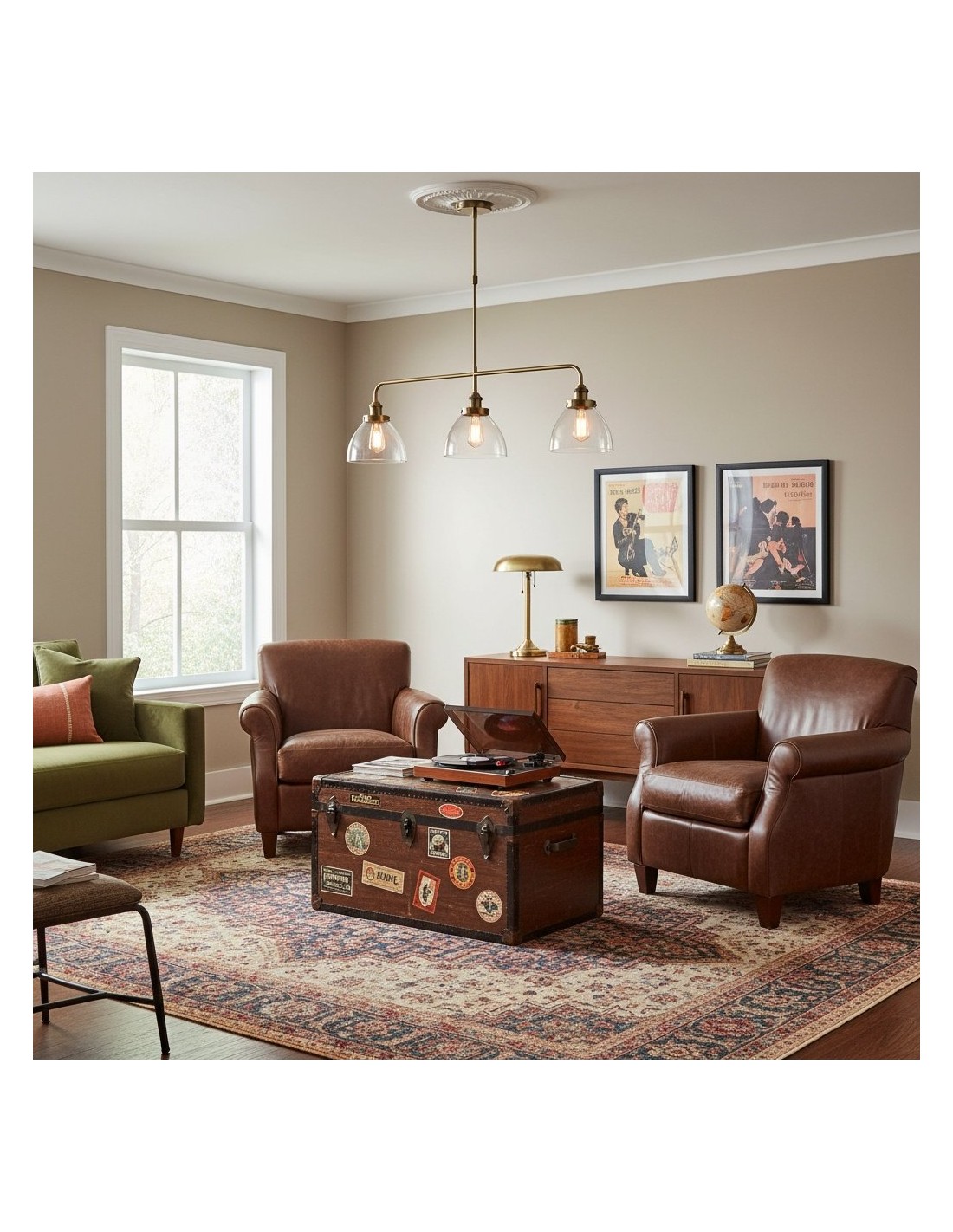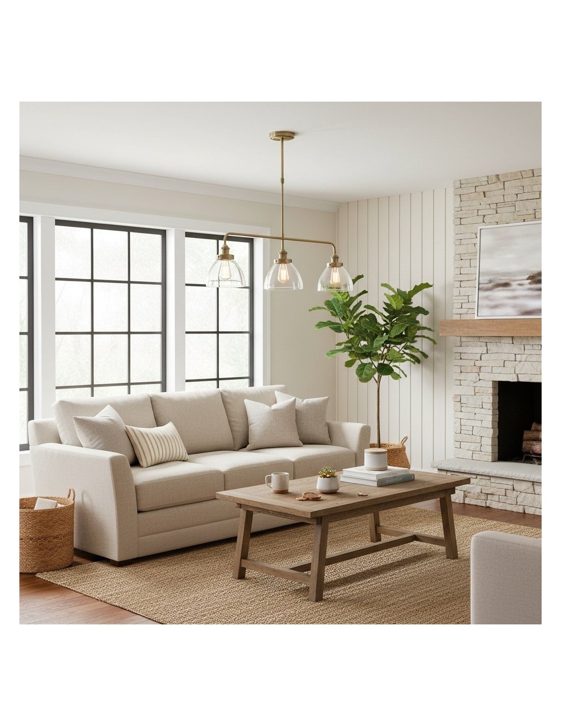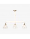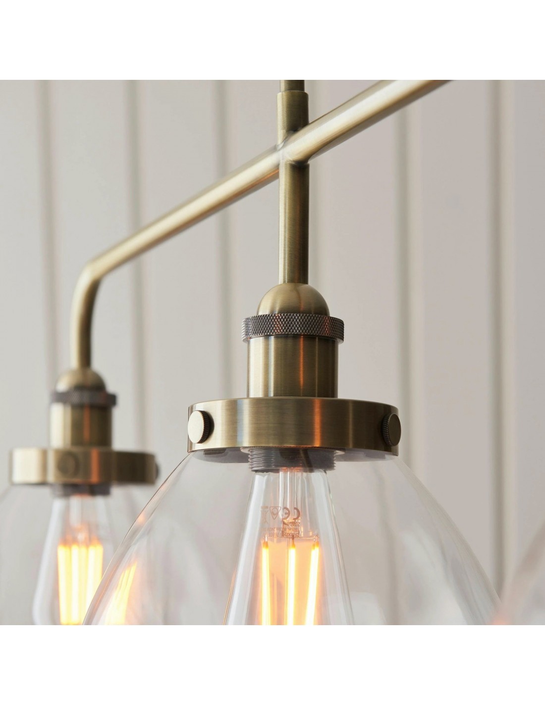 Apportez une touche d'originalité à votre cuisine ou salle à manger avec cette suspension linéaire à trois lumières de style industriel. Sa fine structure, ses détails métalliques et ses abat-jour en verre transparent laissent apparaître des ampoules à filament décoratives qui diffusent une lumière chaleureuse et pleine de caractère. Idéale au-dessus d'un îlot central, d'un bar ou d'une table à manger dans un intérieur moderne ou de type loft.