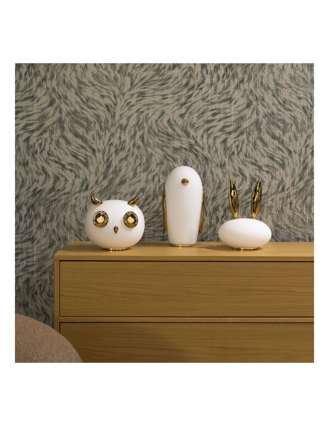 Uhuh, Purr & Noot Noot (hibou, lapin et pingouin) est une série de lampes de table avec leurs personnalités et caractéristiques bien à elles. Ronds, attachants et élégants, ils trouvent leur place dans tout type de climat intérieur et d'environnement. Leurs corps en verre dépoli, décorés de touches d'or, émettent une lueur ensoleillée et chaleureuse. Choisissez vos personnages préférés parmi un pingouin, un lapin et un hibou et profitez d'un pays des merveilles de personnages de contes de fées pleins de charme !