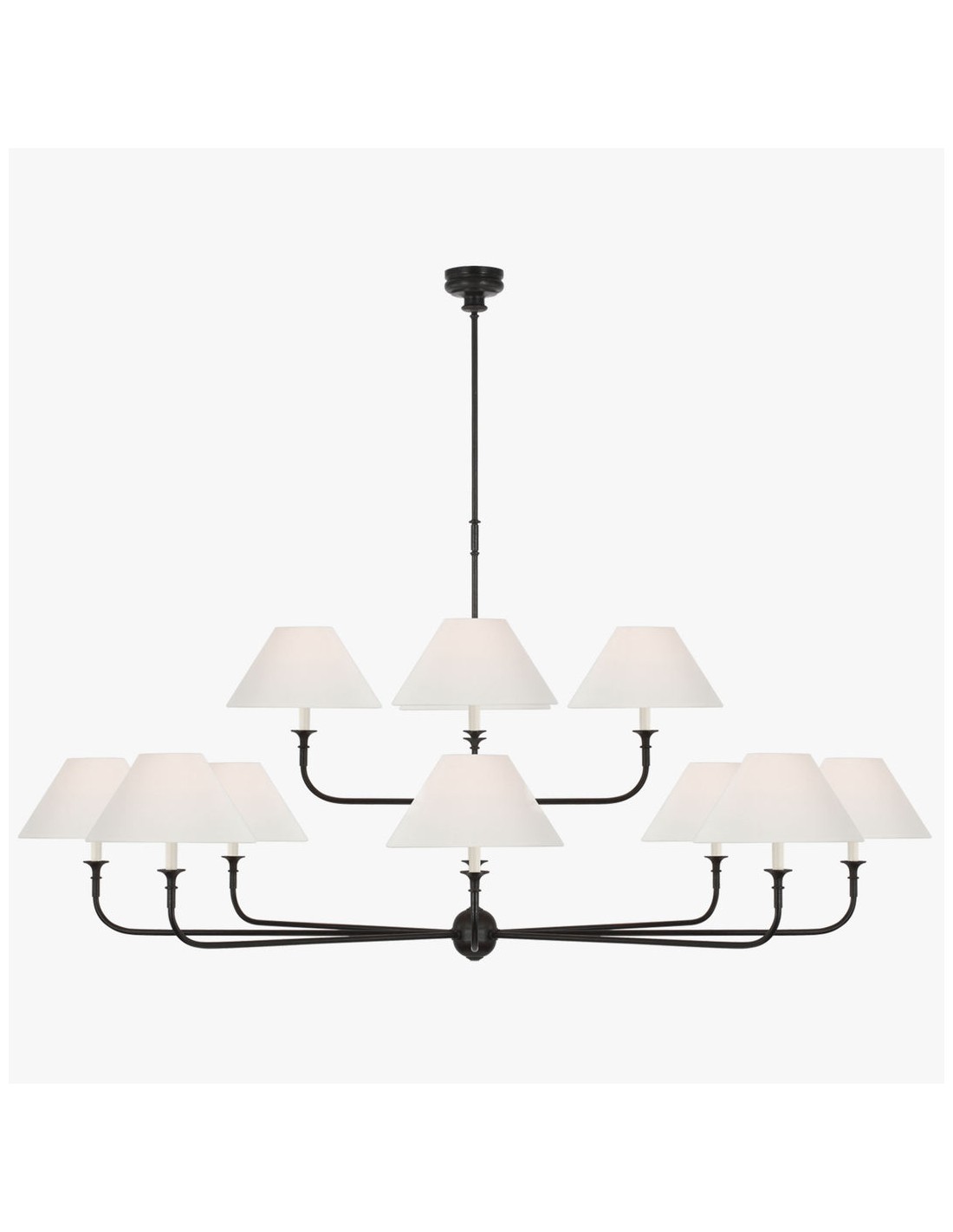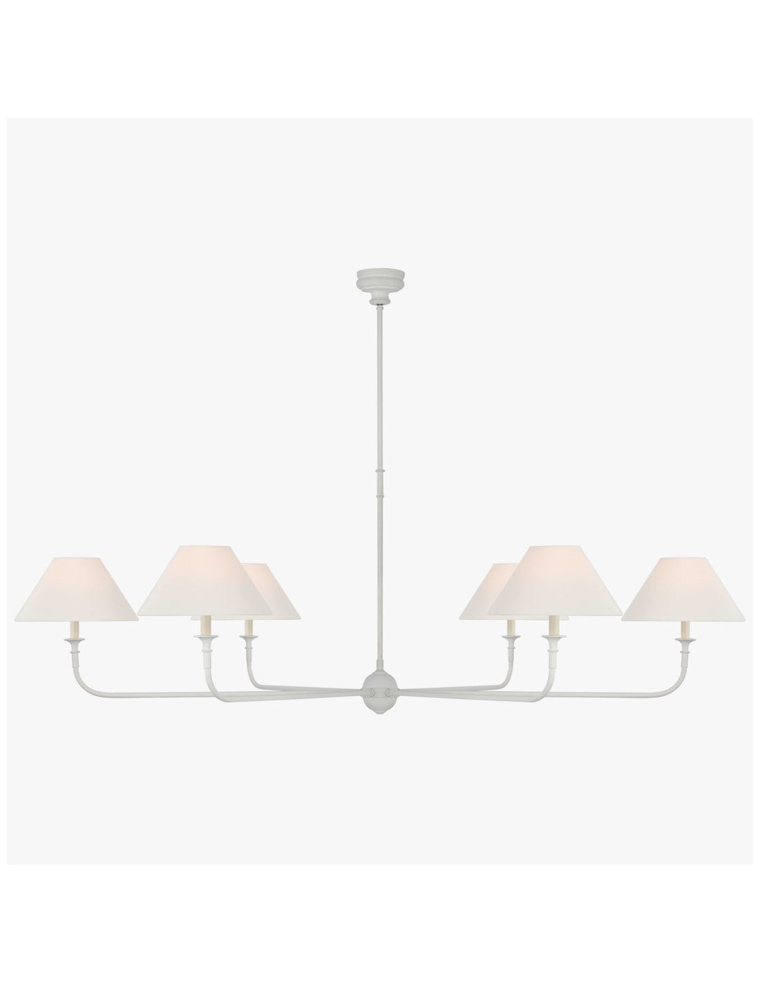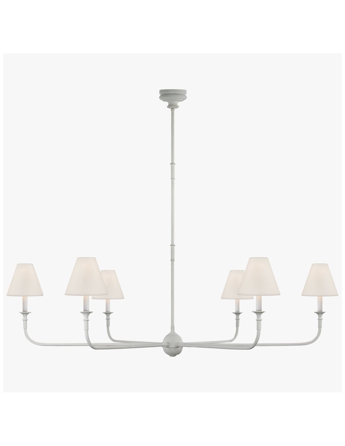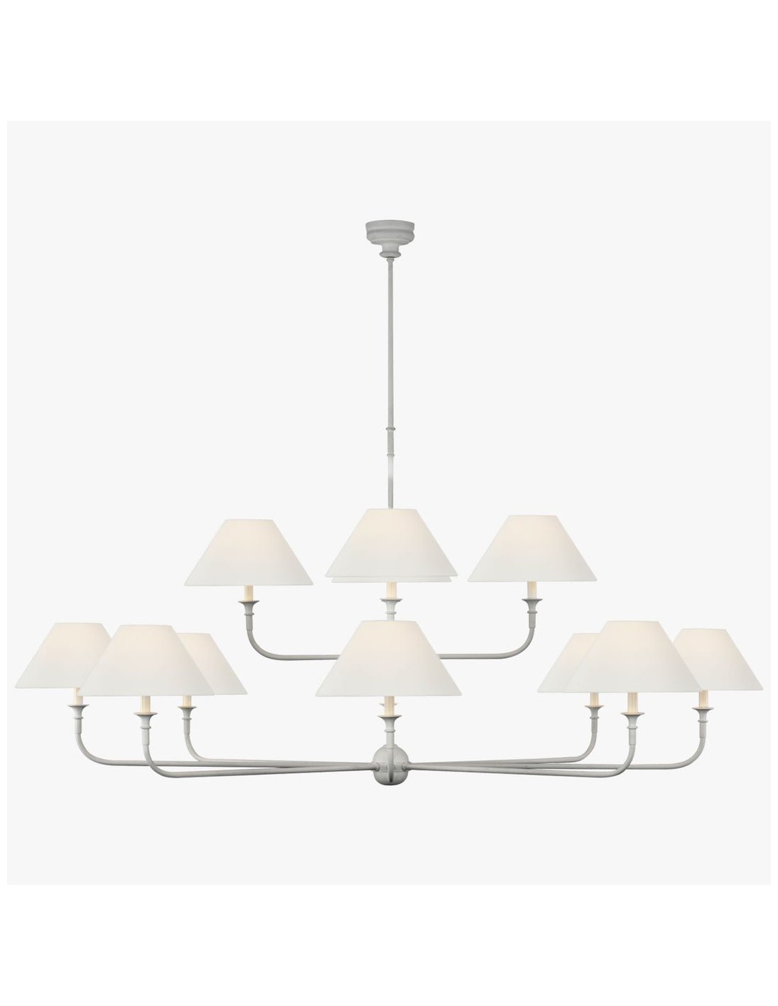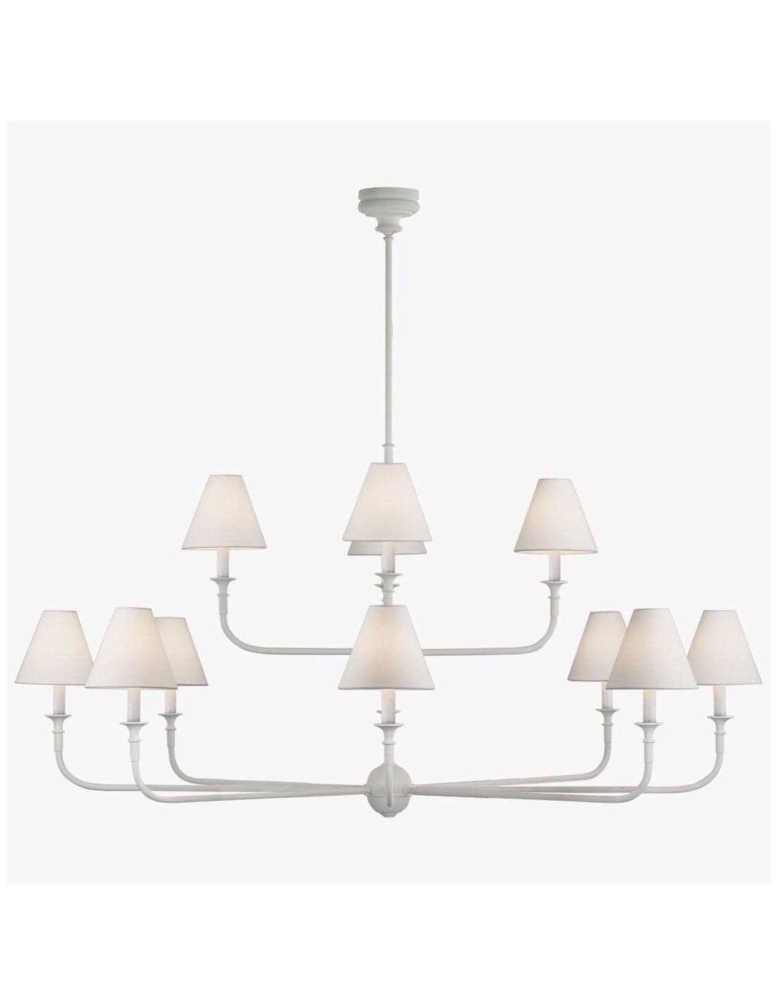 Le lustre Piaf Grande allie le charme moderne du milieu du siècle à une élégance intemporelle, offrant un confort visuel optimal. Ses élégants motifs de bougies et ses abat-jour fuselés en tissu rehaussent le confort visuel.