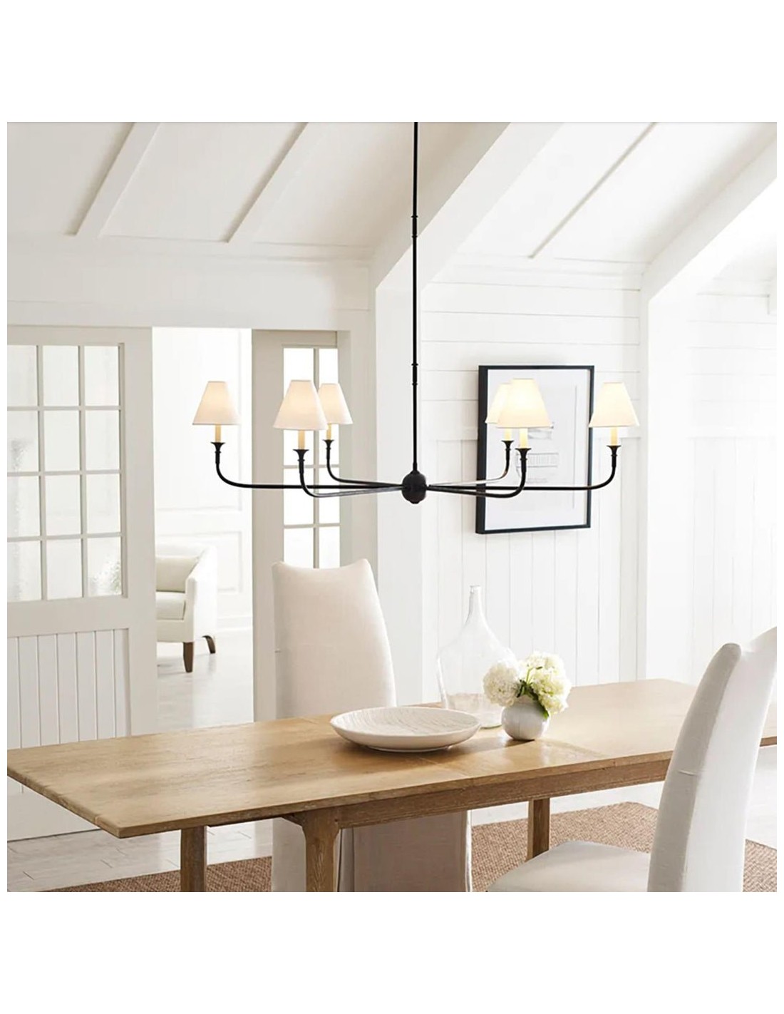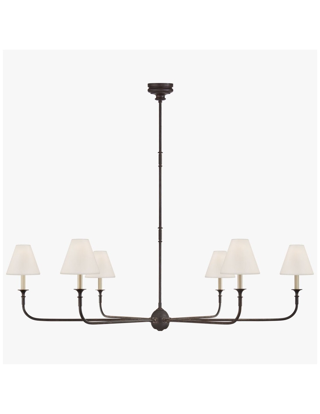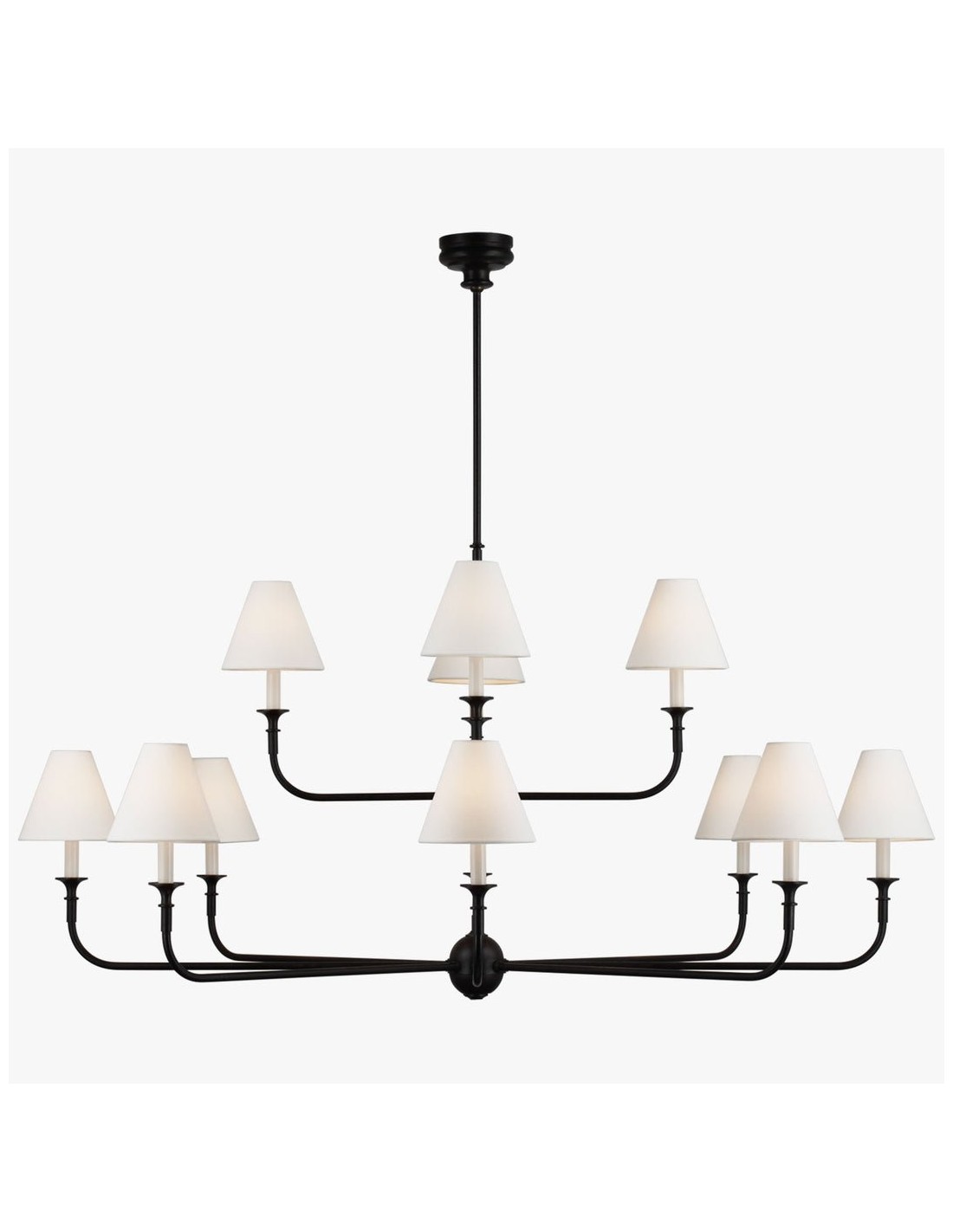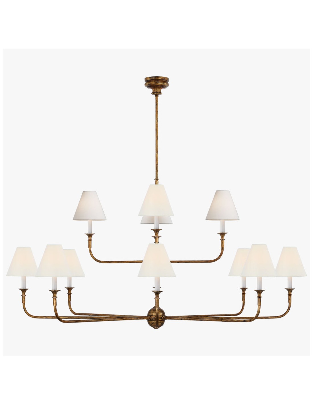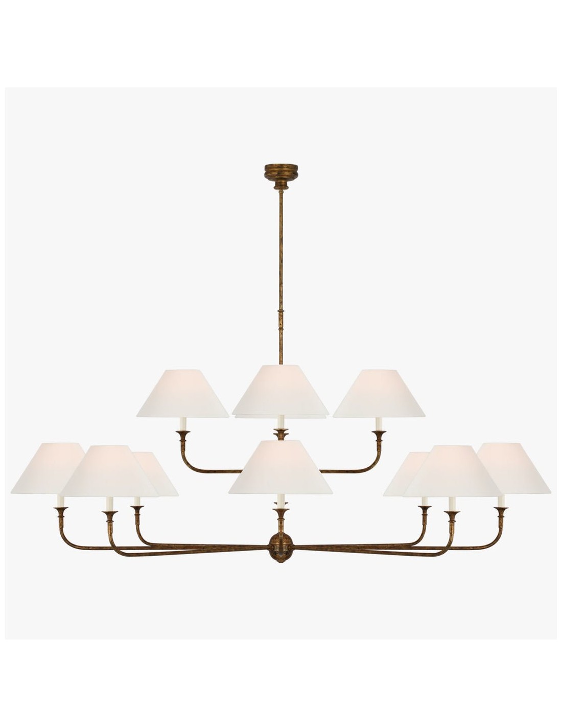 Le lustre Piaf Grande allie le charme moderne du milieu du siècle à une élégance intemporelle, offrant un confort visuel optimal. Ses élégants motifs de bougies et ses abat-jour fuselés en tissu rehaussent le confort visuel.