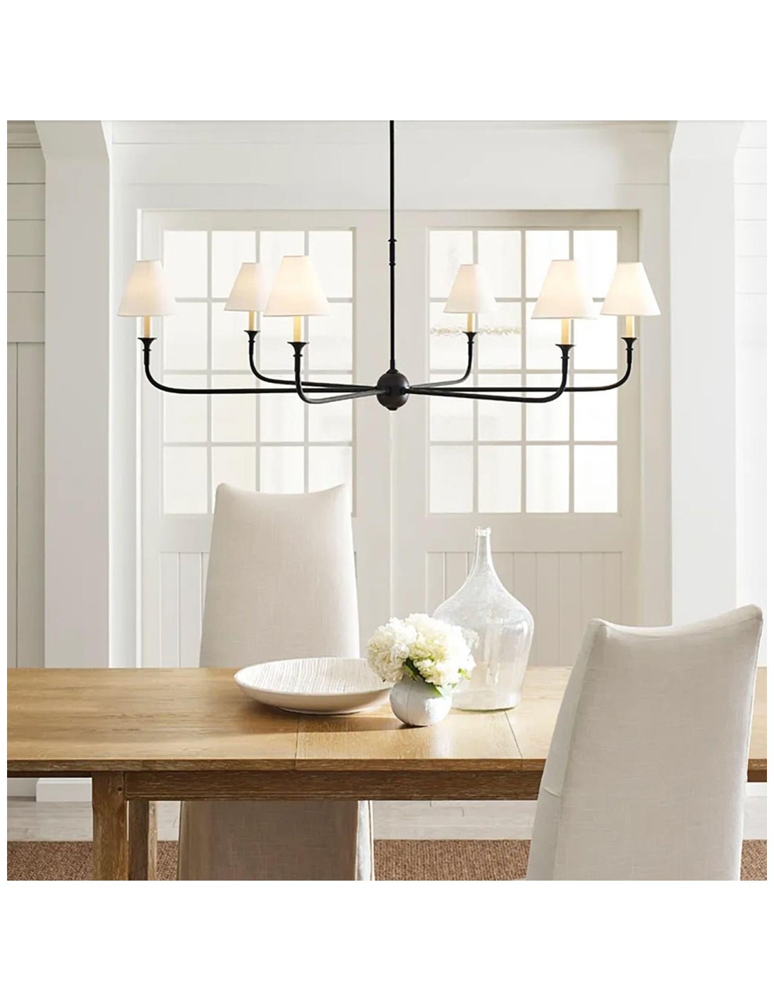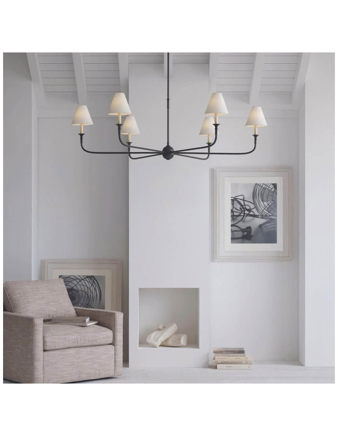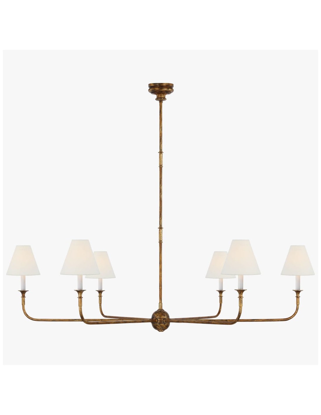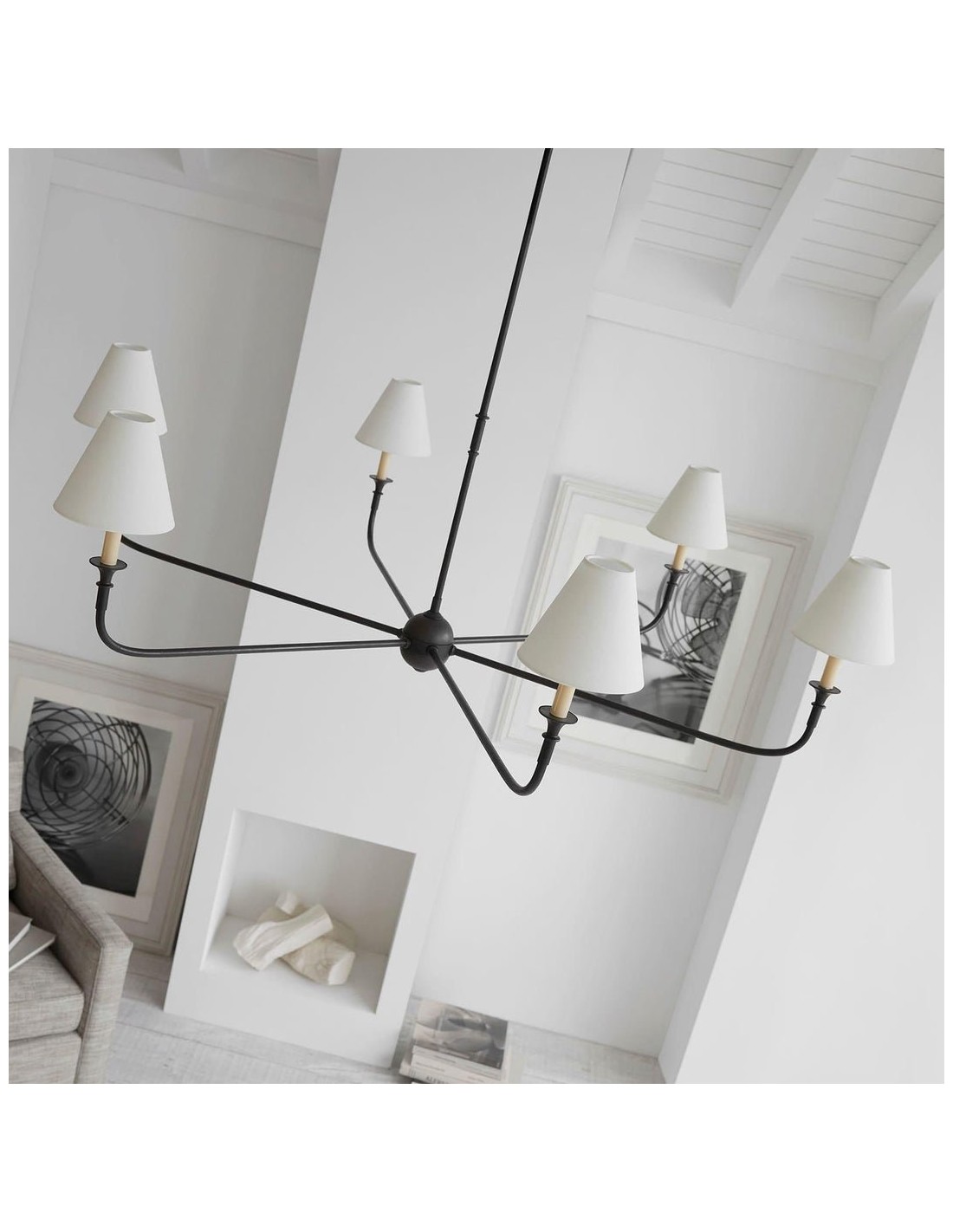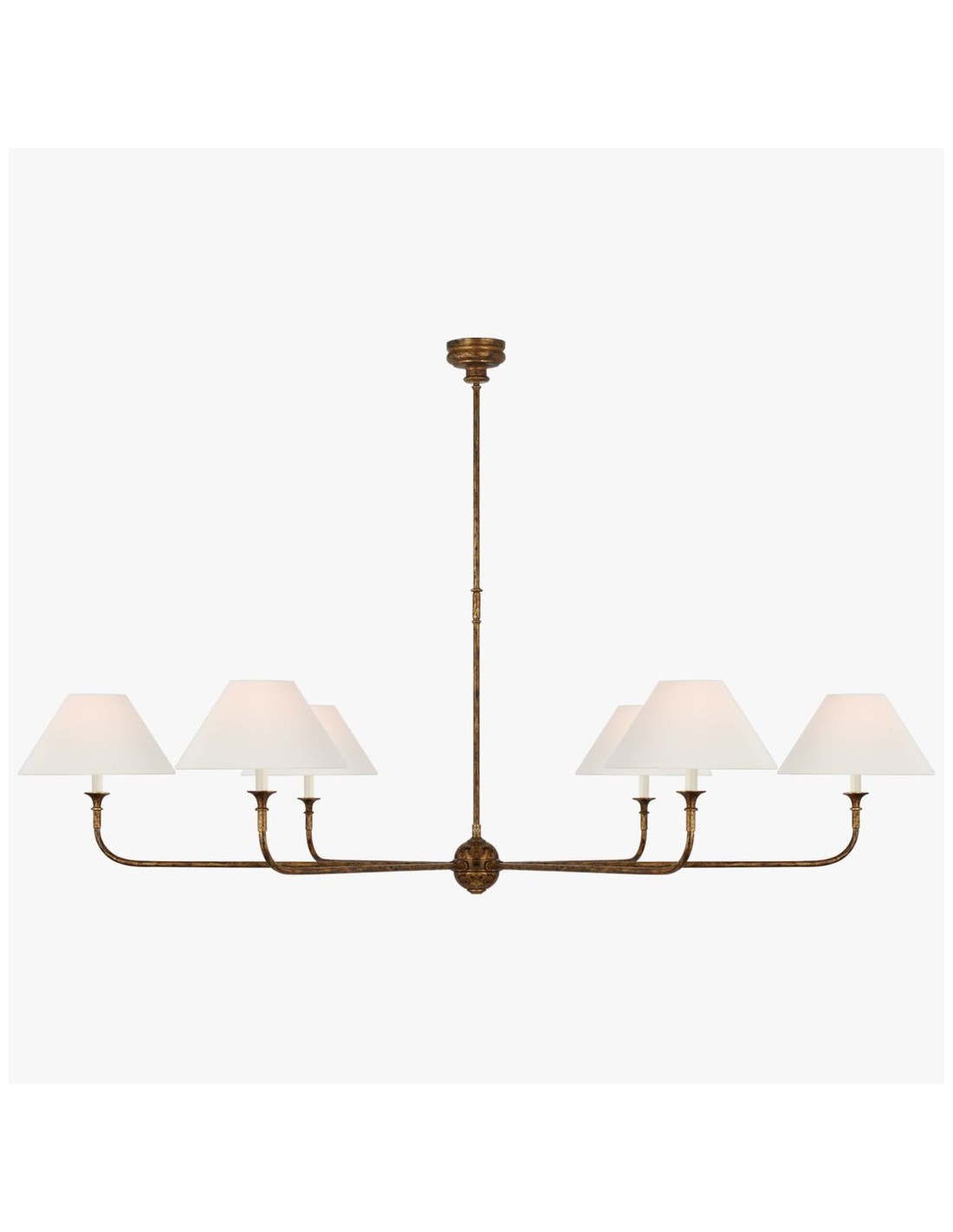 Le lustre Piaf Grande allie le charme moderne du milieu du siècle à une élégance intemporelle, offrant un confort visuel optimal. Ses élégants motifs de bougies et ses abat-jour fuselés en tissu rehaussent le confort visuel.
