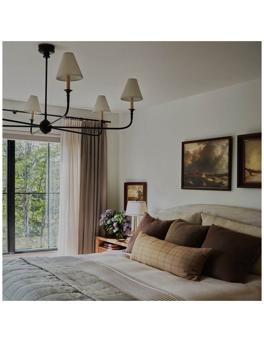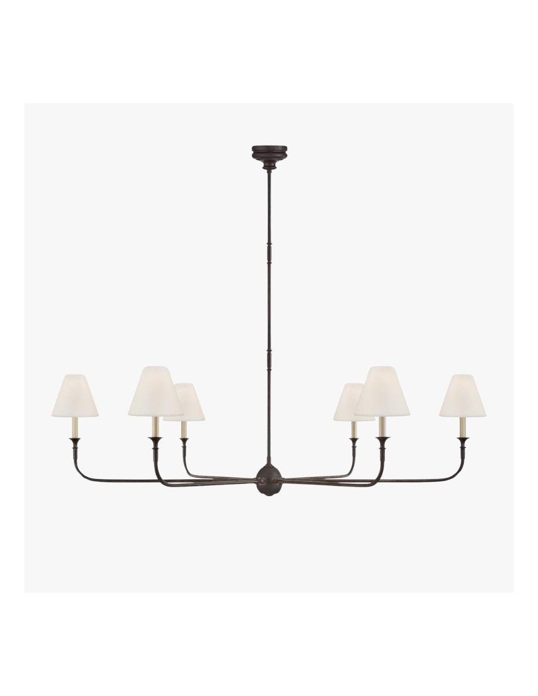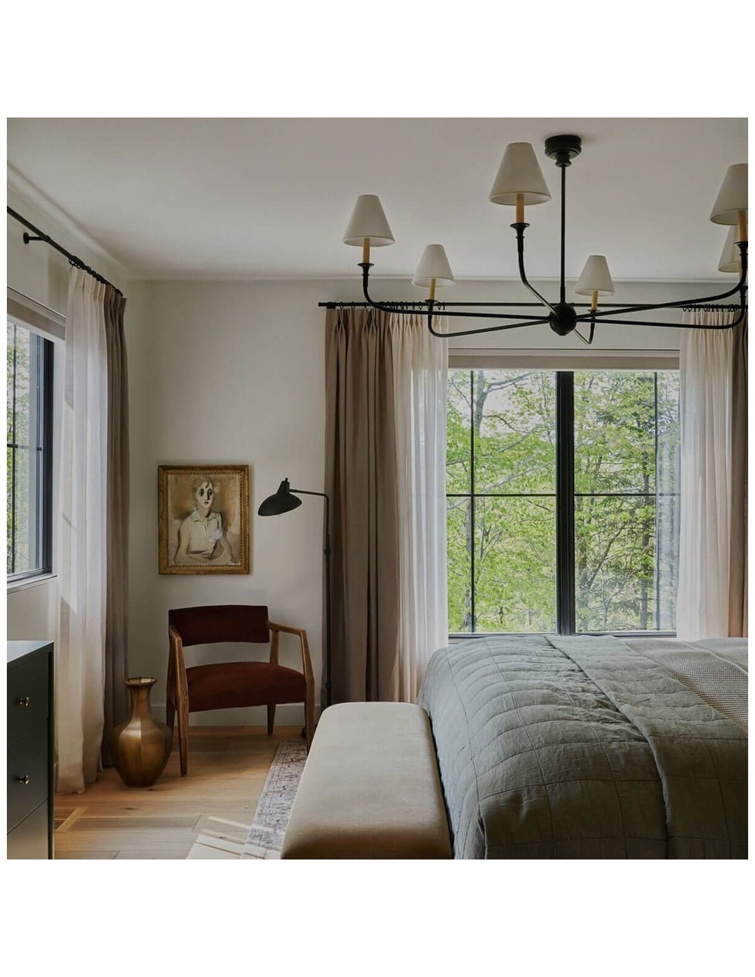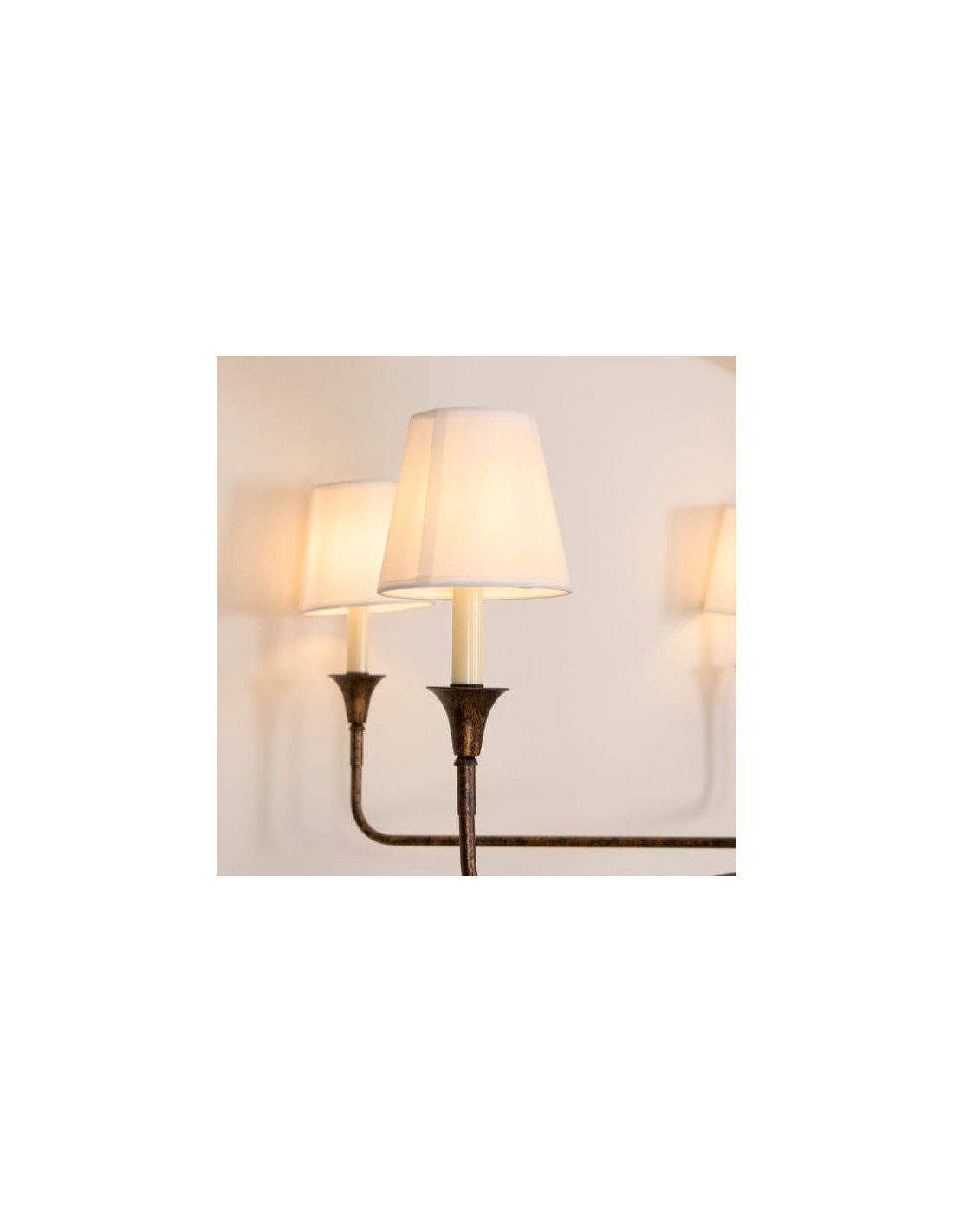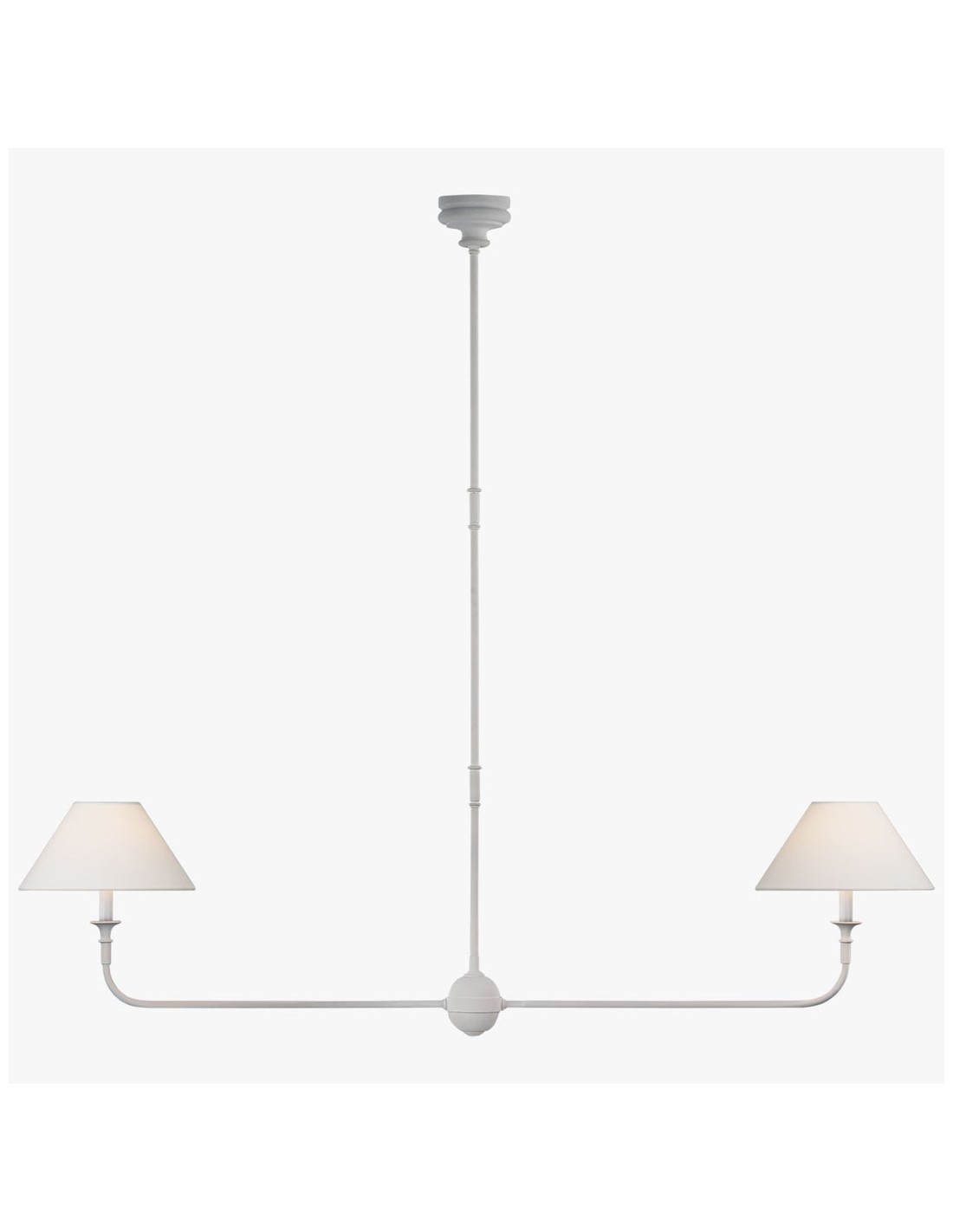 Le lustre Piaf Grande allie le charme moderne du milieu du siècle à une élégance intemporelle, offrant un confort visuel optimal. Ses élégants motifs de bougies et ses abat-jour fuselés en tissu rehaussent le confort visuel.