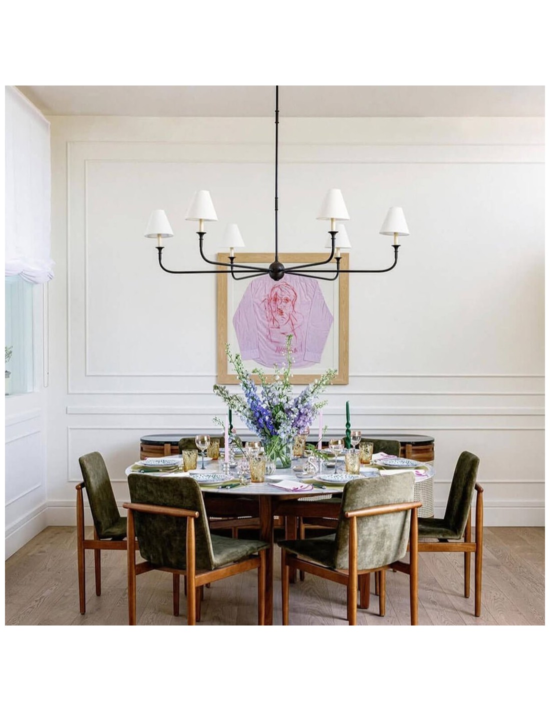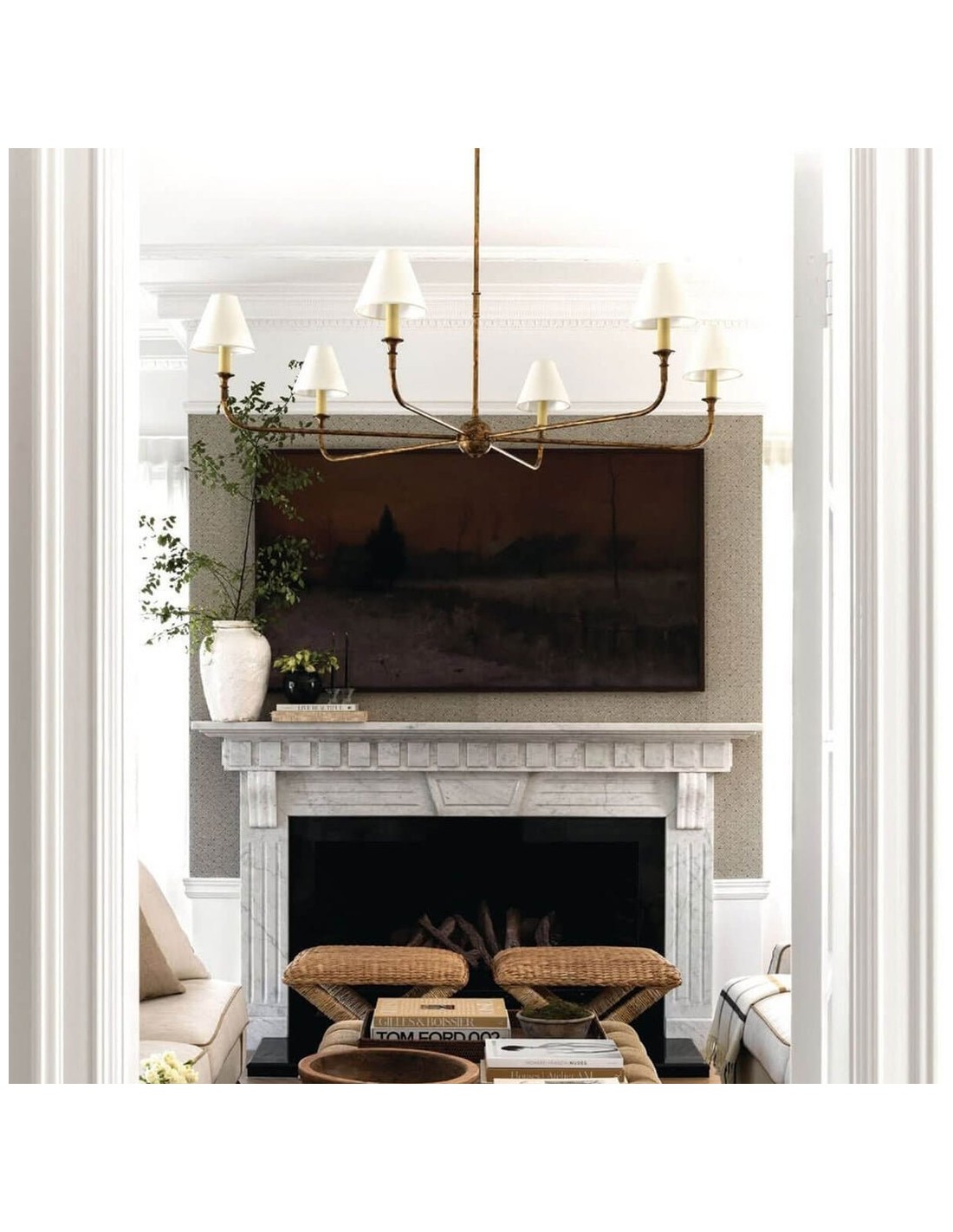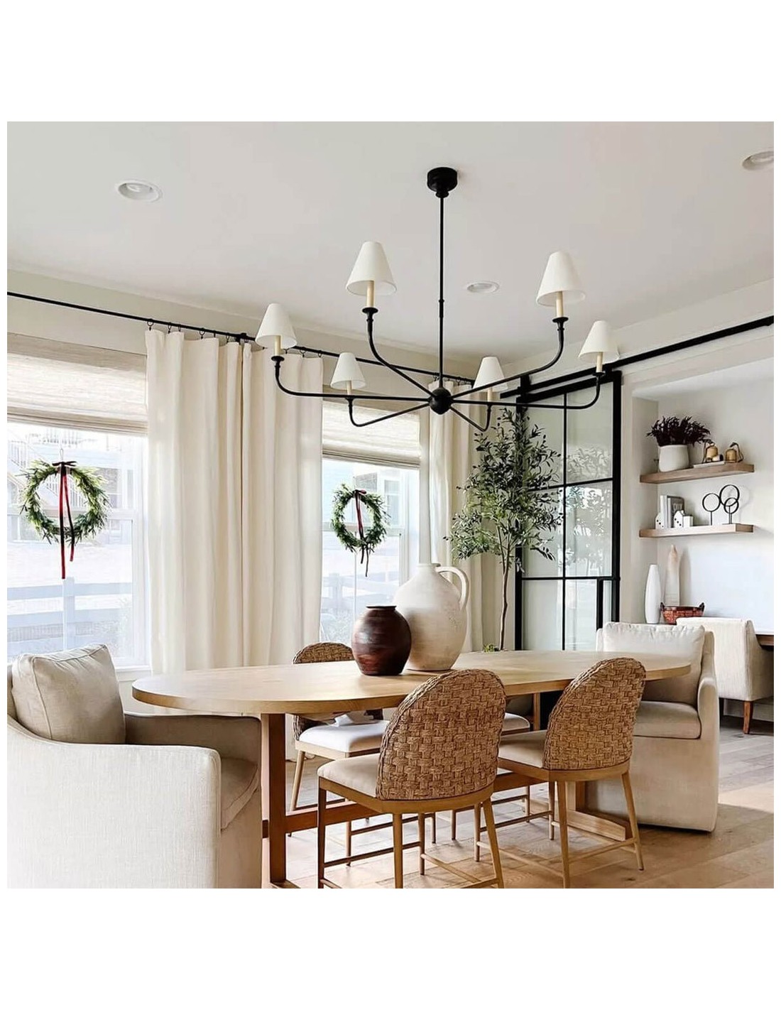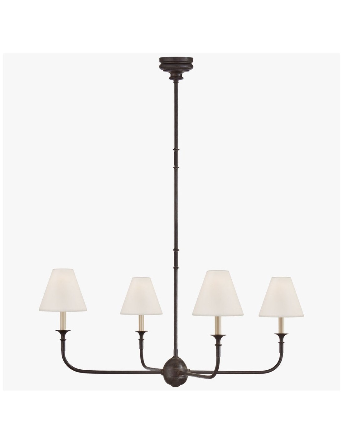 Le lustre Piaf Grande allie le charme moderne du milieu du siècle à une élégance intemporelle, offrant un confort visuel optimal. Ses élégants motifs de bougies et ses abat-jour fuselés en tissu rehaussent le confort visuel.