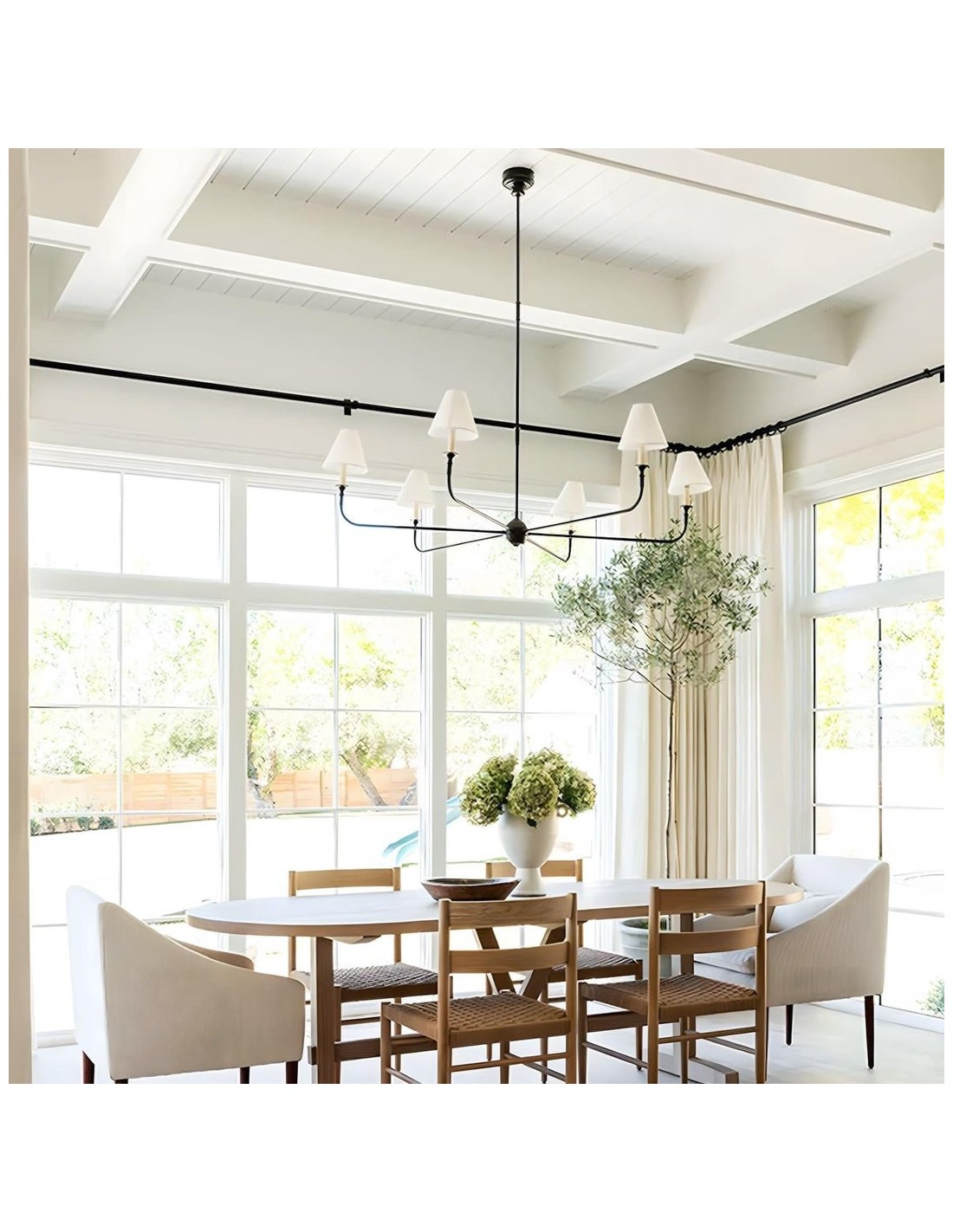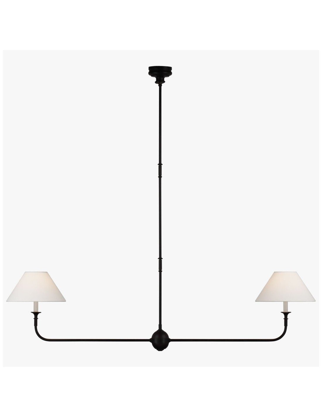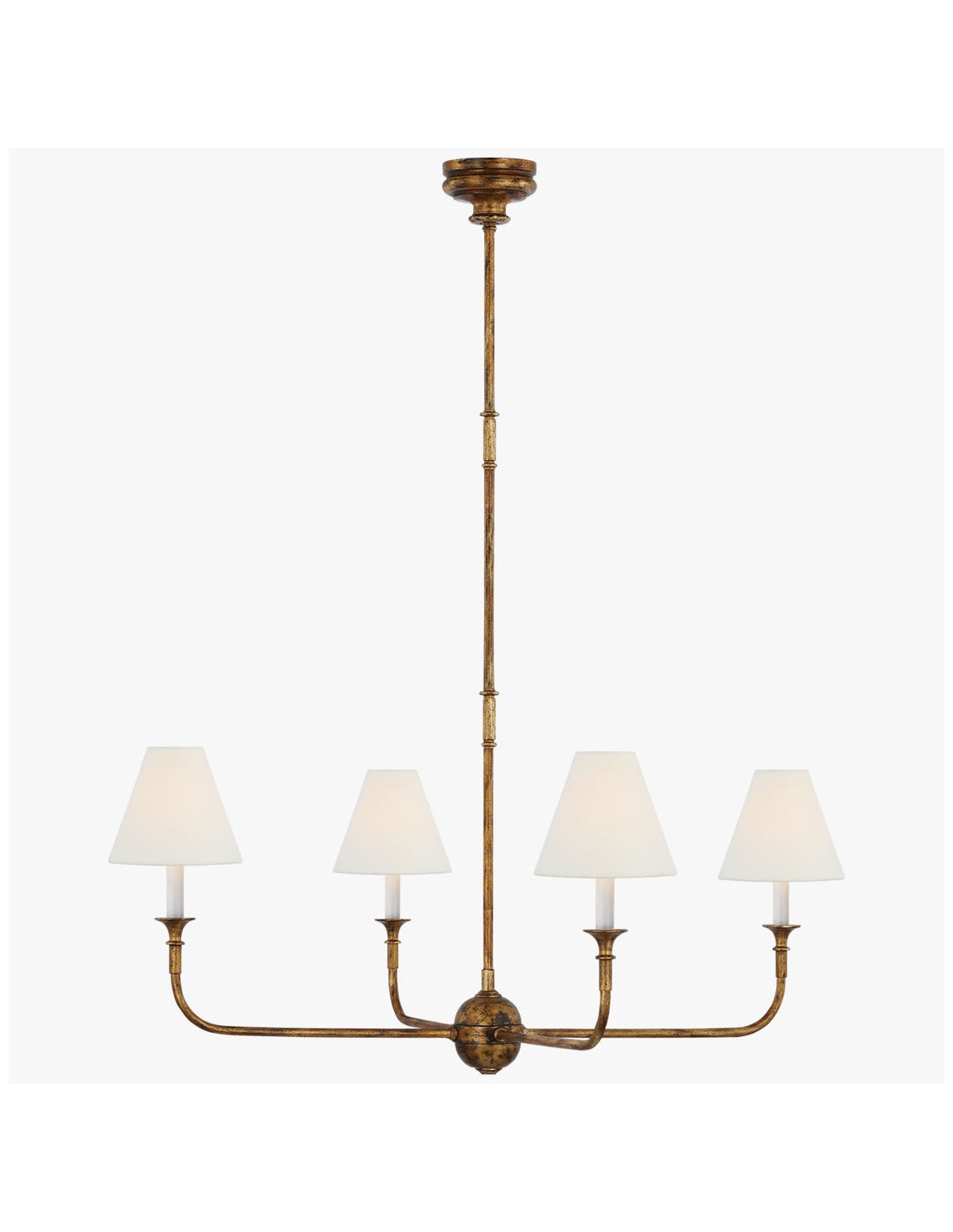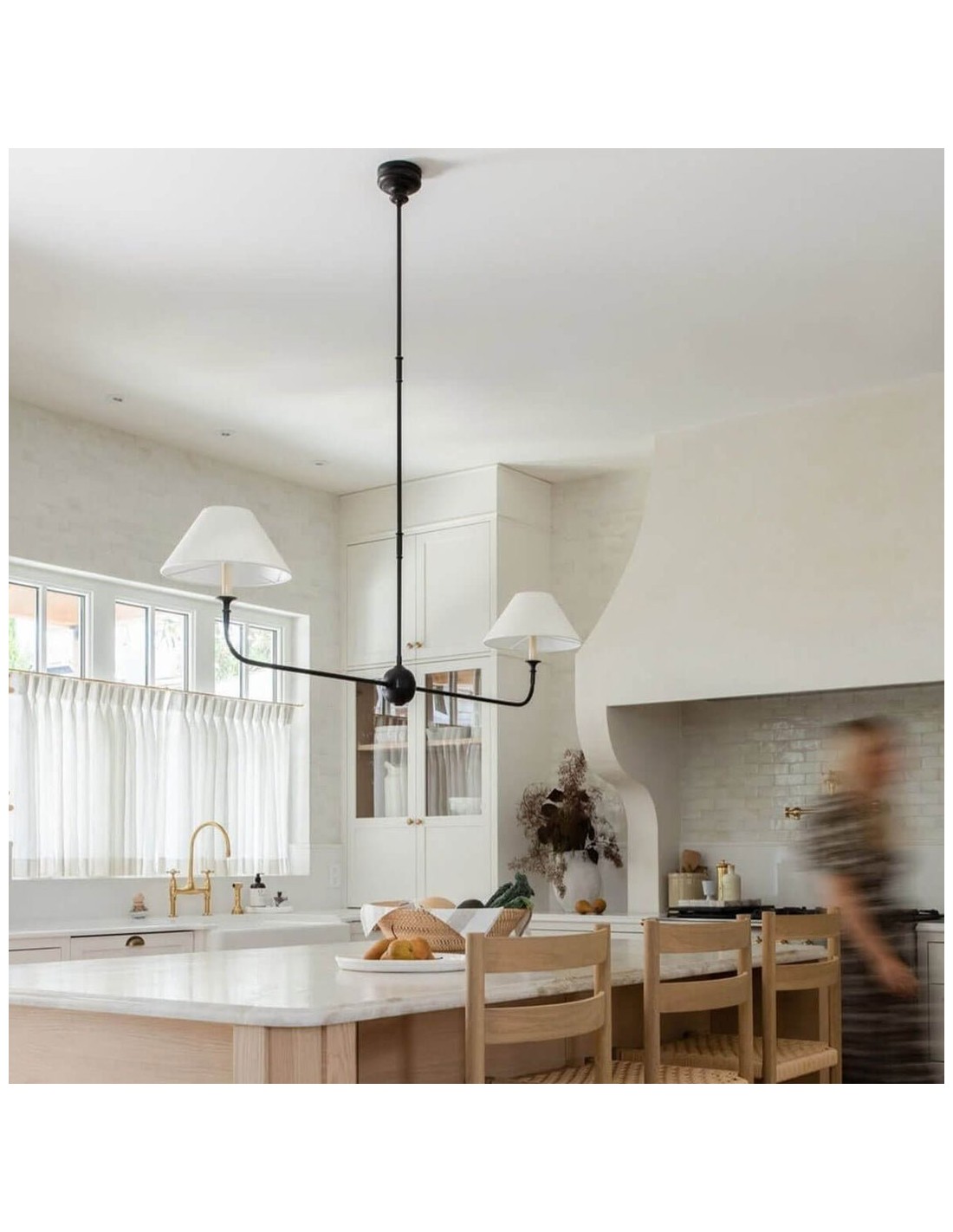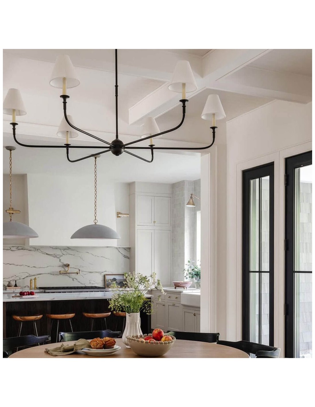 Le lustre Piaf Grande allie le charme moderne du milieu du siècle à une élégance intemporelle, offrant un confort visuel optimal. Ses élégants motifs de bougies et ses abat-jour fuselés en tissu rehaussent le confort visuel.