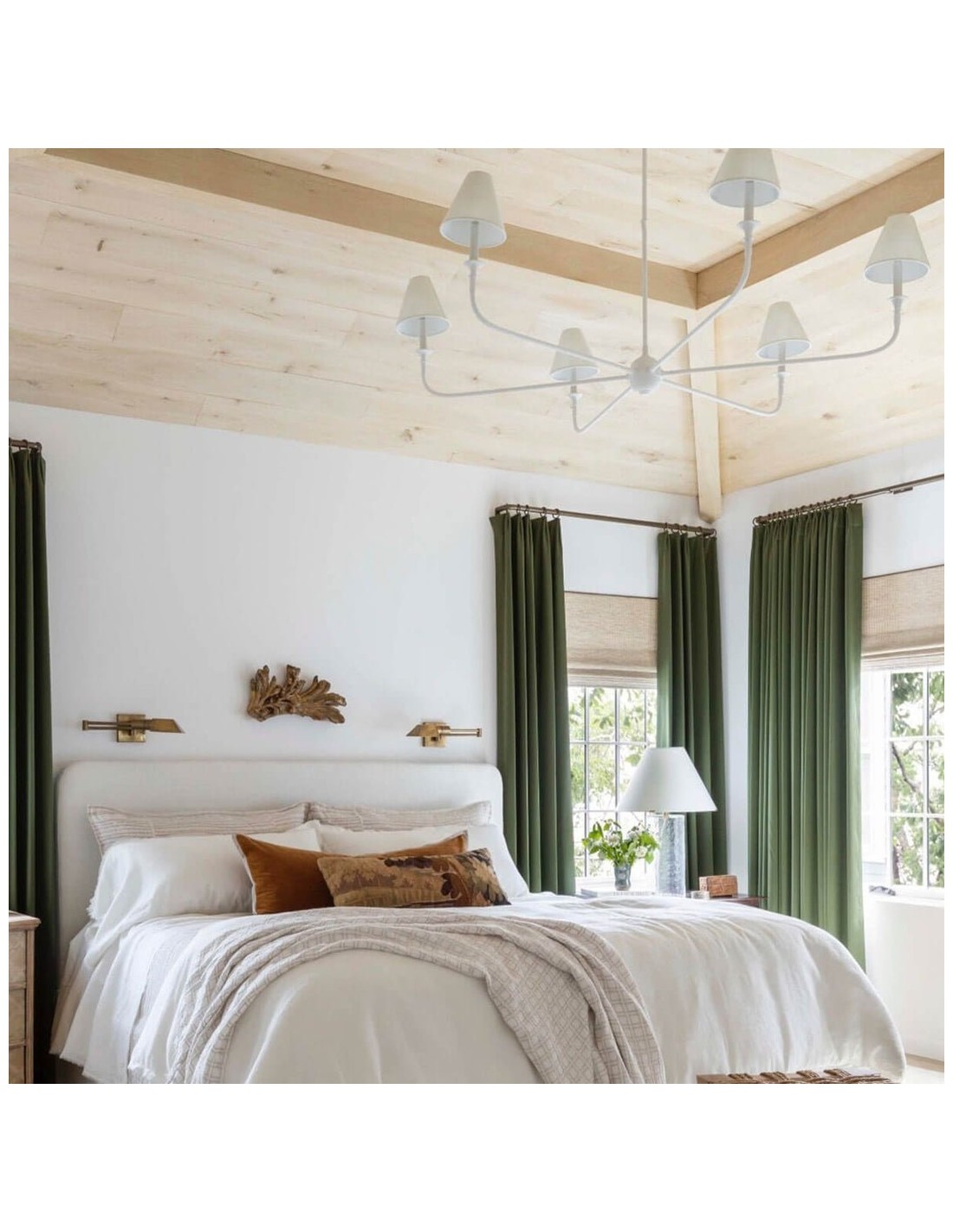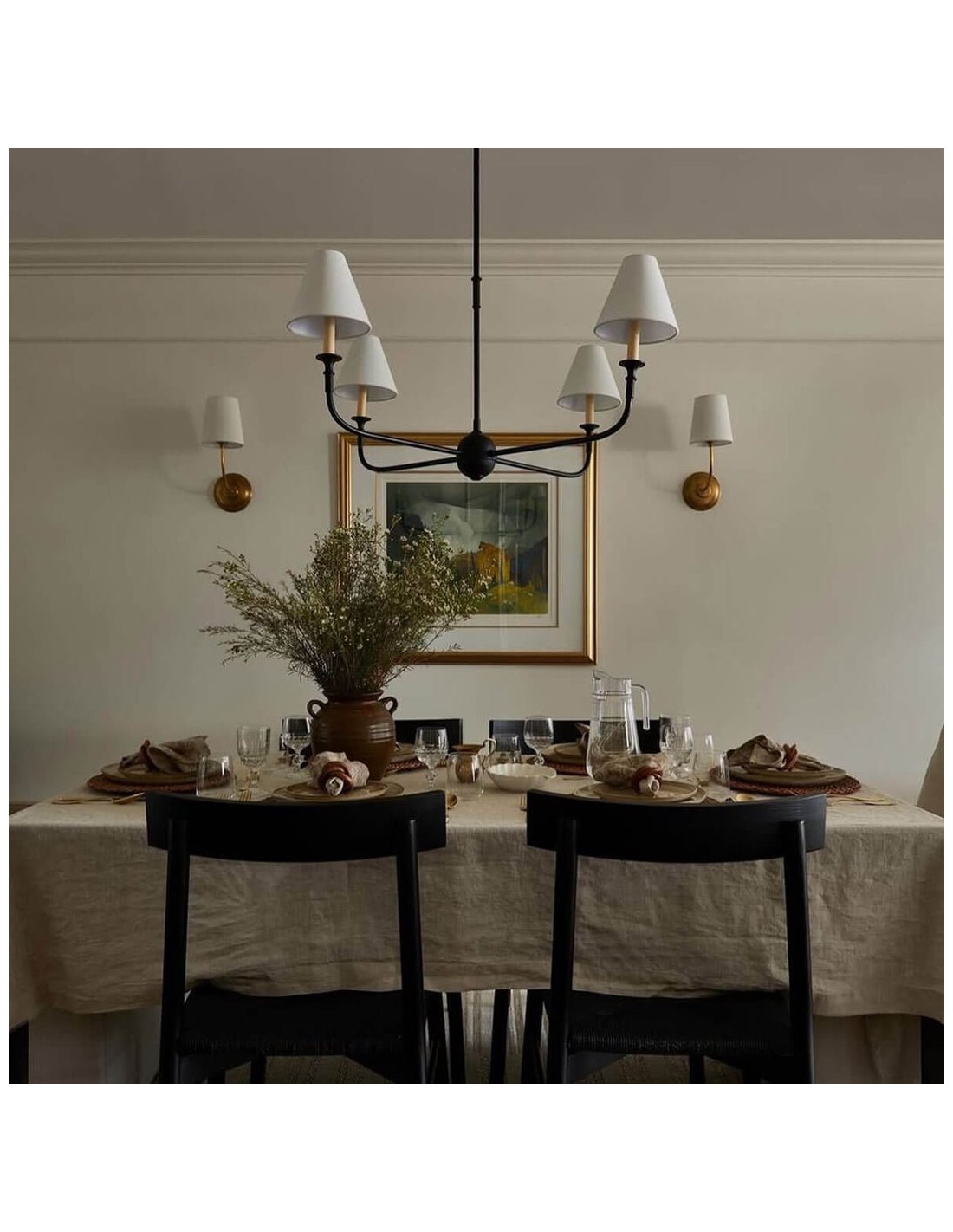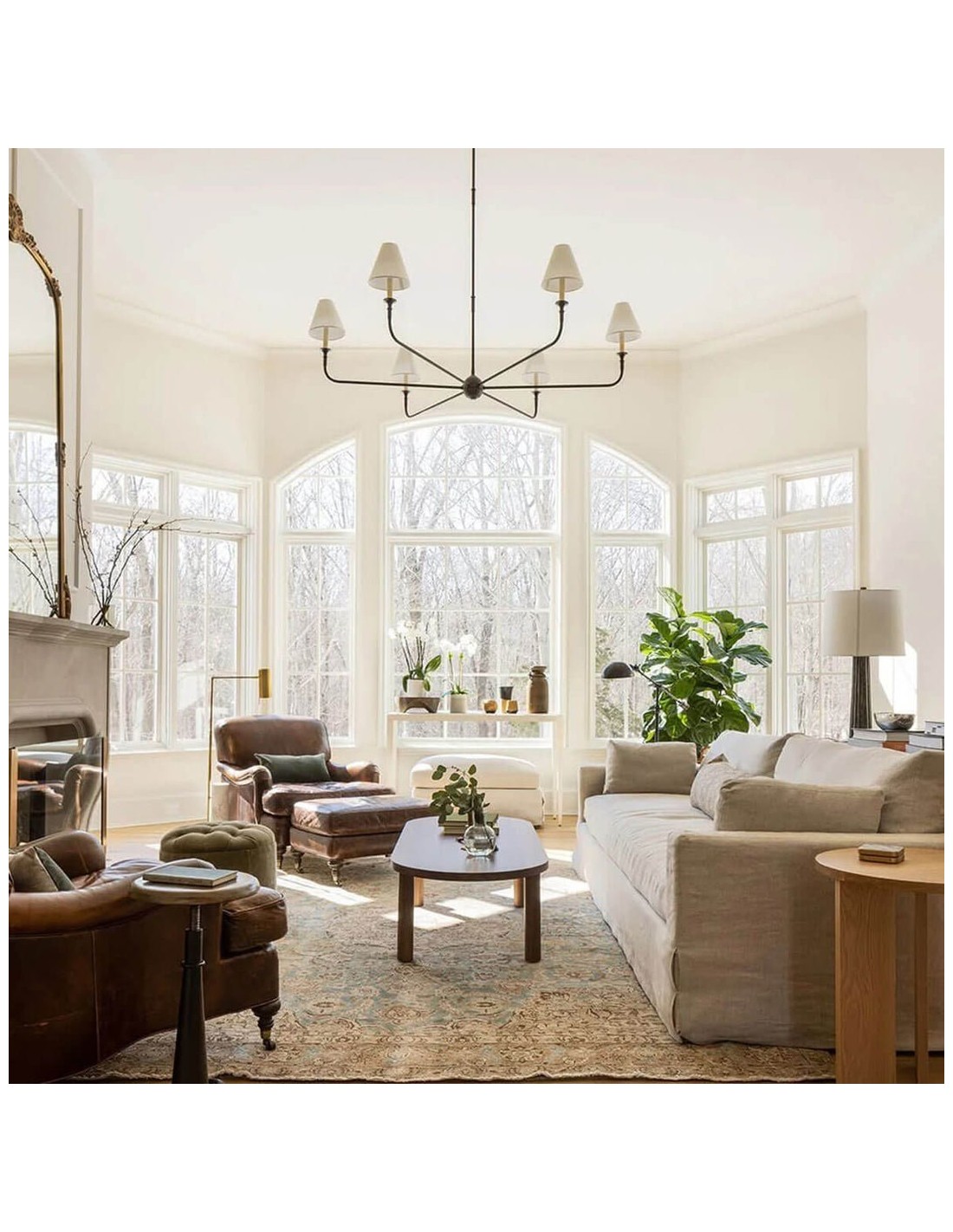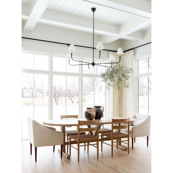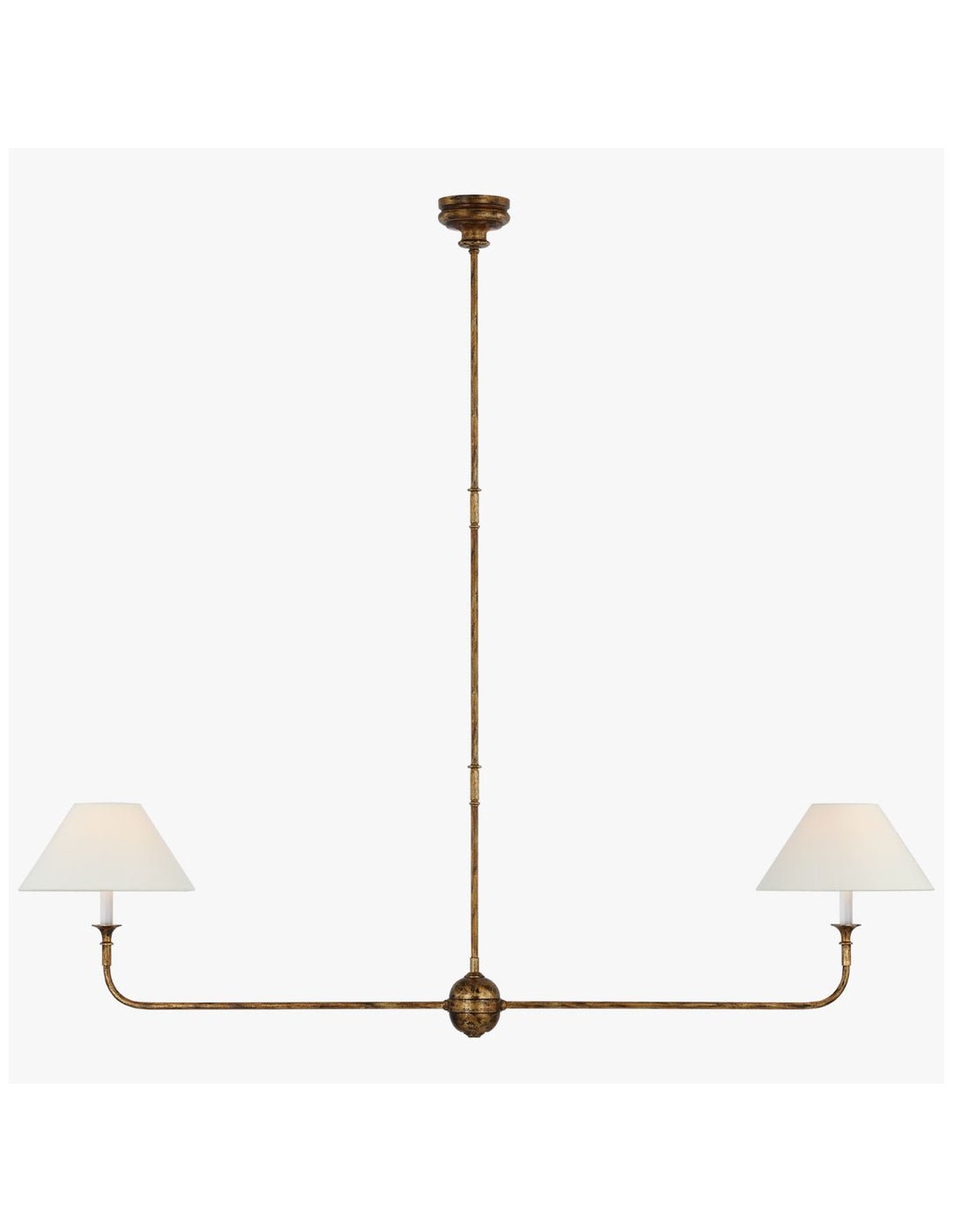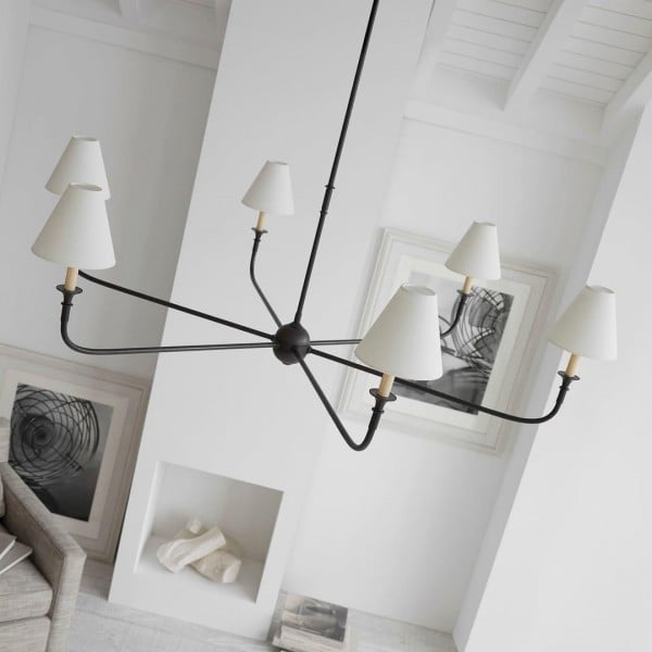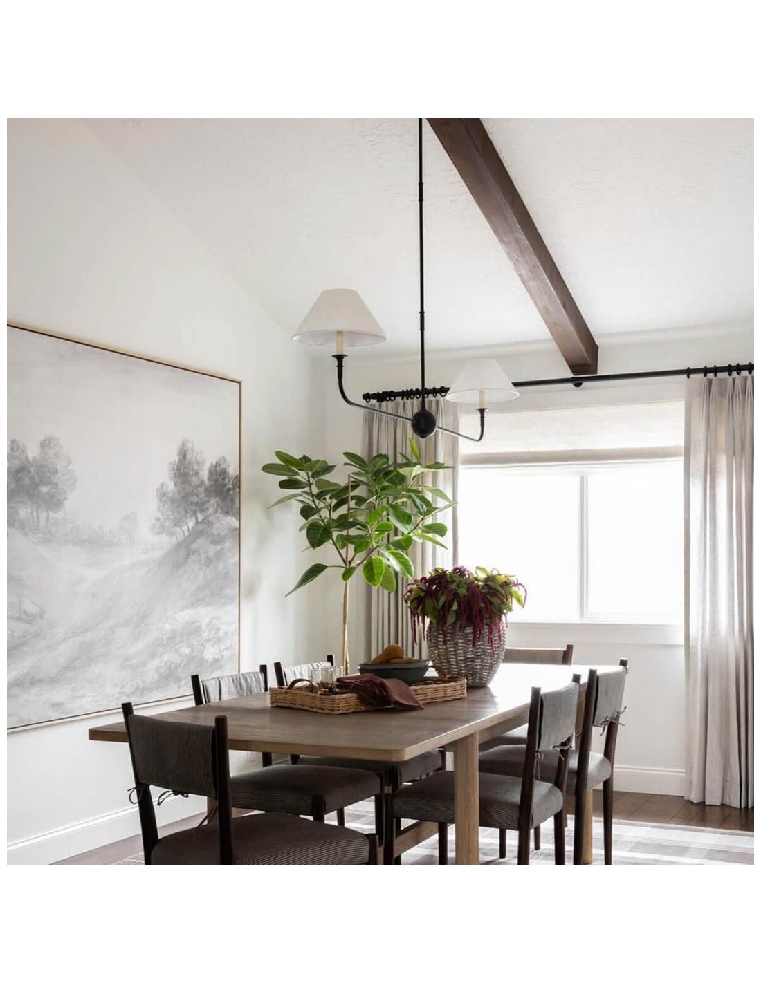 Le lustre Piaf Grande allie le charme moderne du milieu du siècle à une élégance intemporelle, offrant un confort visuel optimal. Ses élégants motifs de bougies et ses abat-jour fuselés en tissu rehaussent le confort visuel.