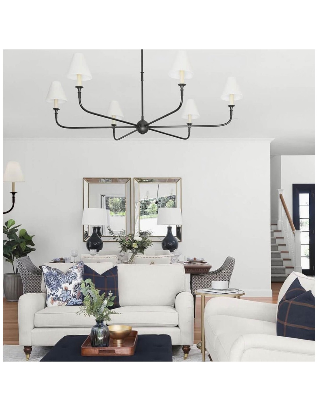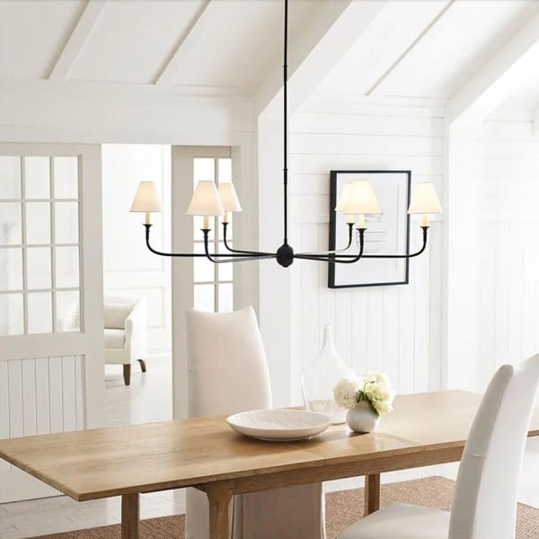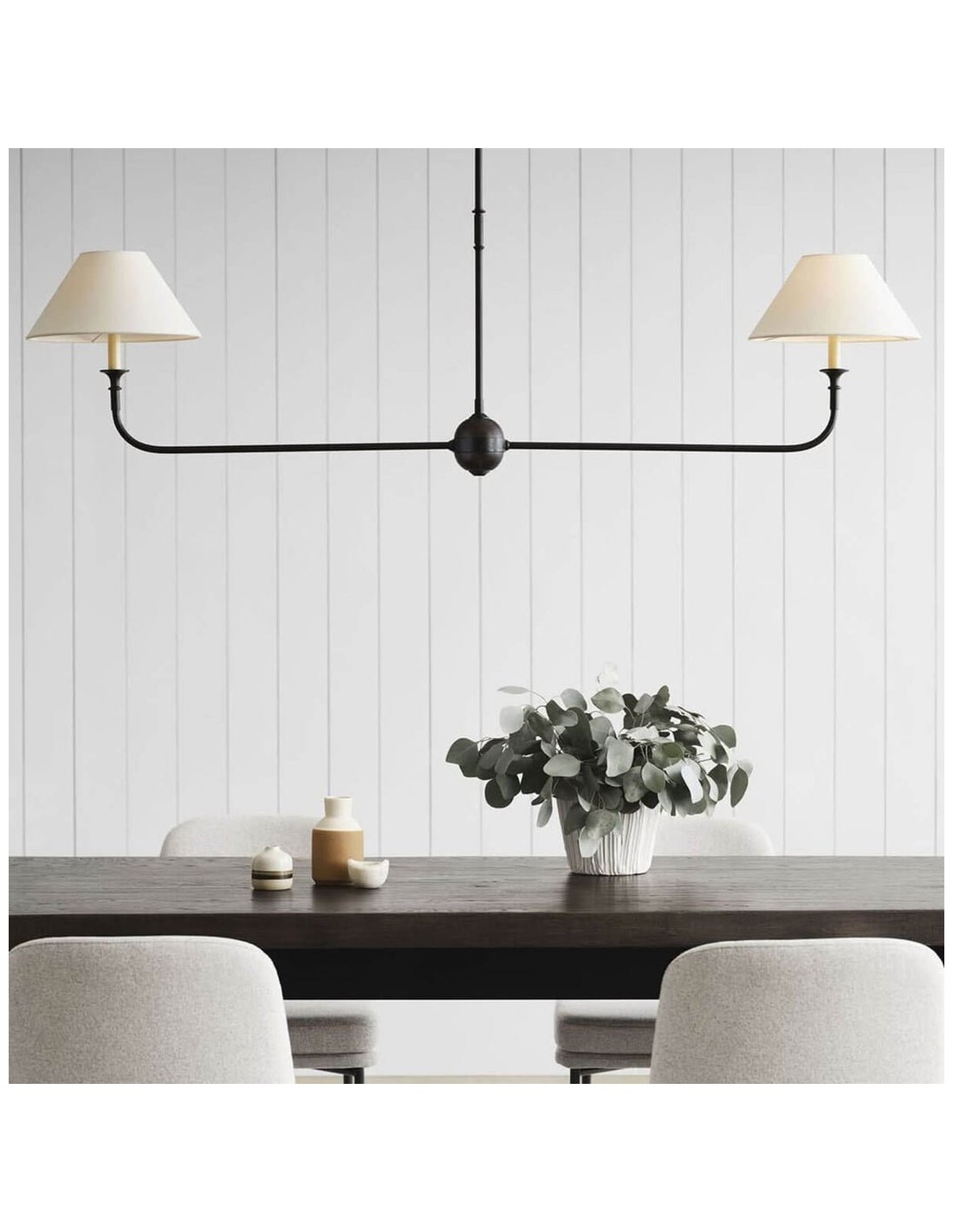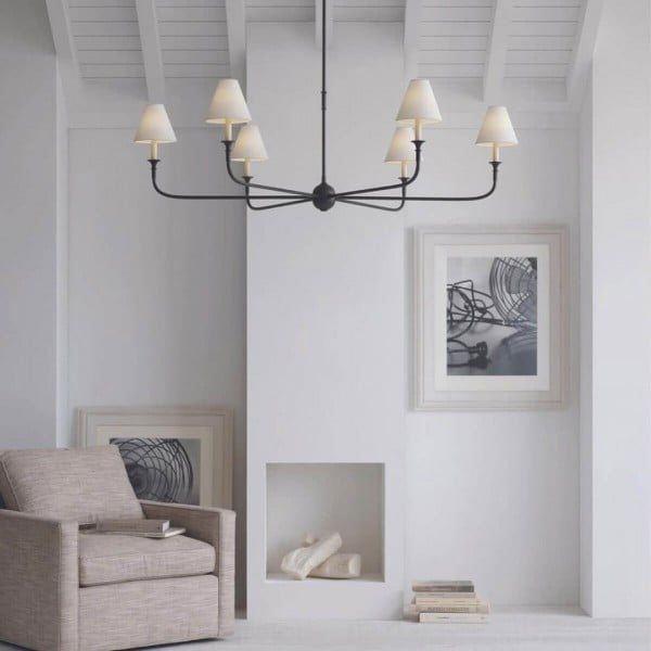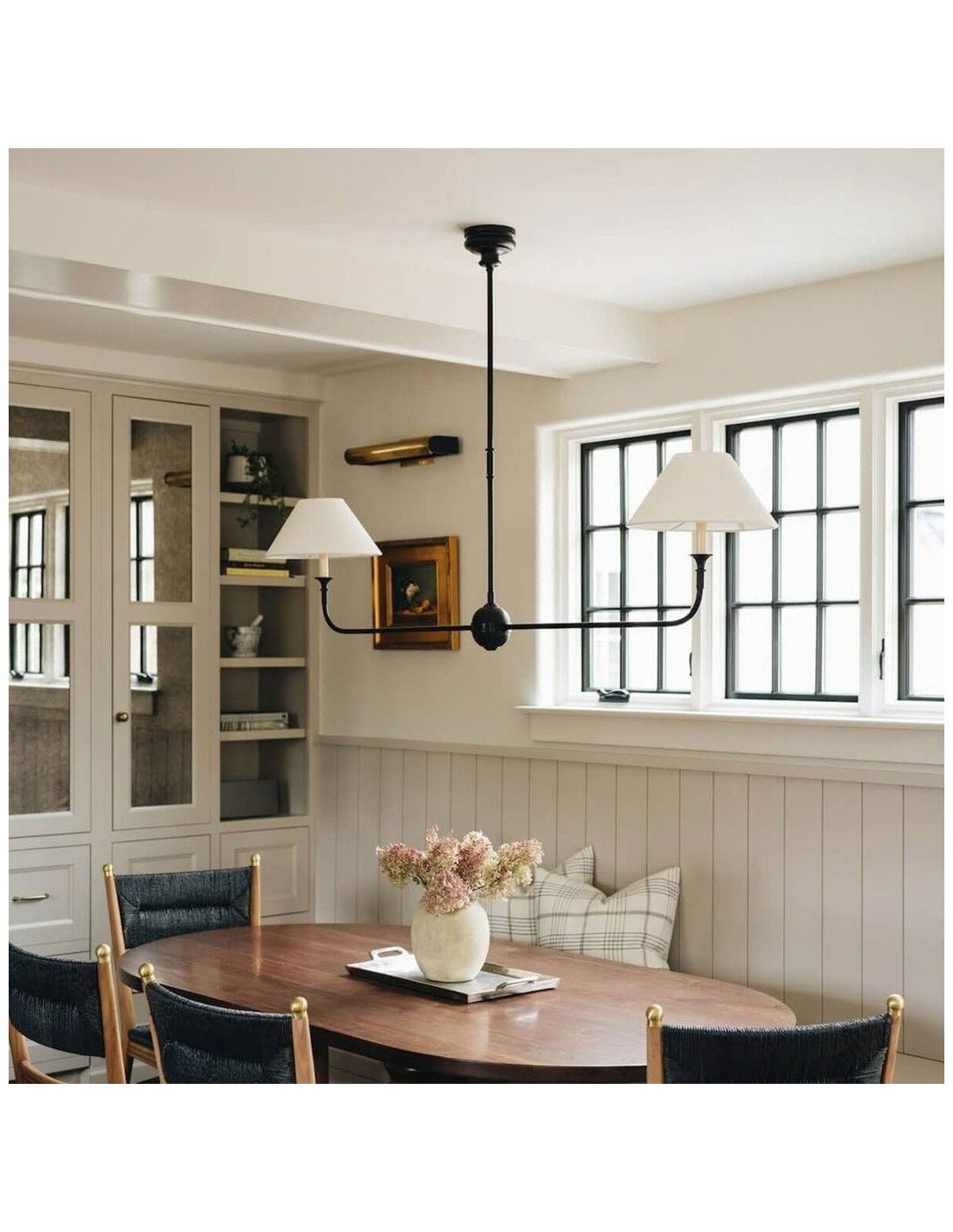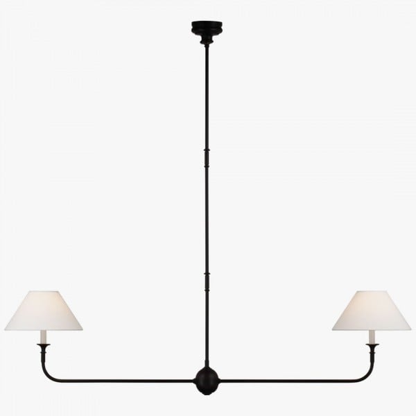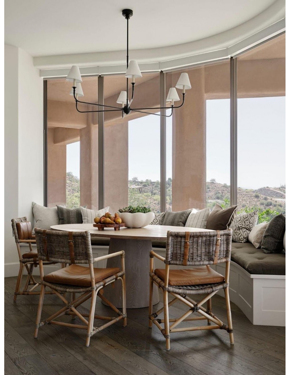 Le lustre Piaf Grande allie le charme moderne du milieu du siècle à une élégance intemporelle, offrant un confort visuel optimal. Ses élégants motifs de bougies et ses abat-jour fuselés en tissu rehaussent le confort visuel.