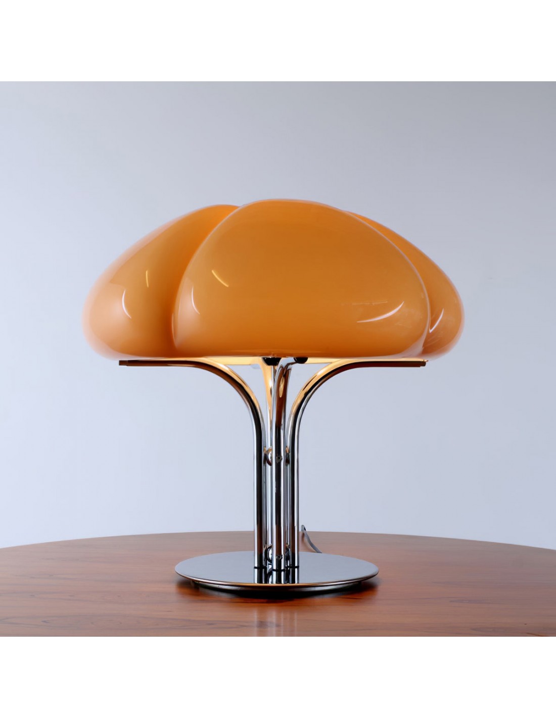 L'abat-jour en verre couleur caramel aux courbes généreuses et le pied chromé créent un effet lumineux chaleureux. Cette lampe de table incarne l'audace et la sensibilité des années 70. La douce couleur caramel de l'abat-jour contraste magnifiquement avec le chrome brillant du pied.