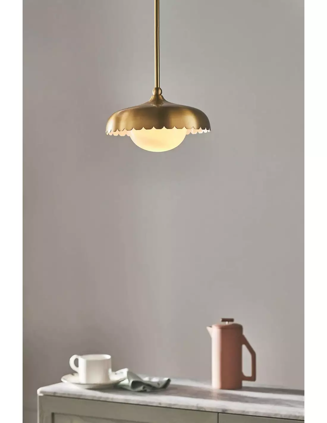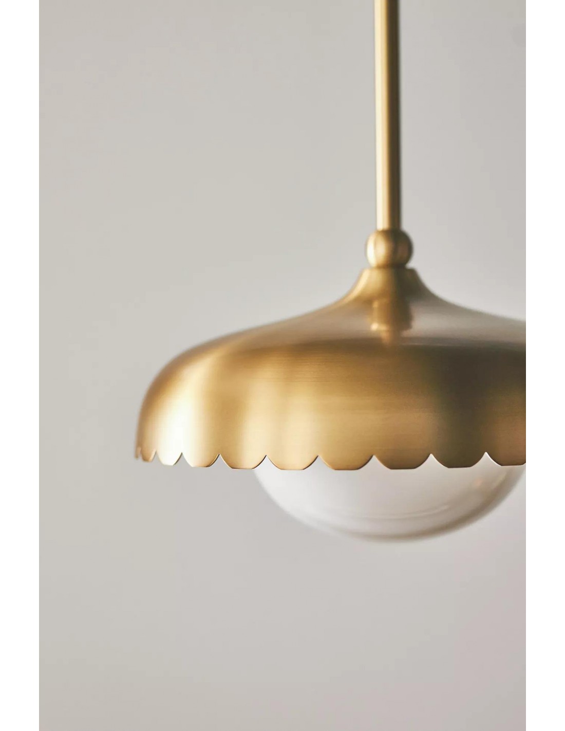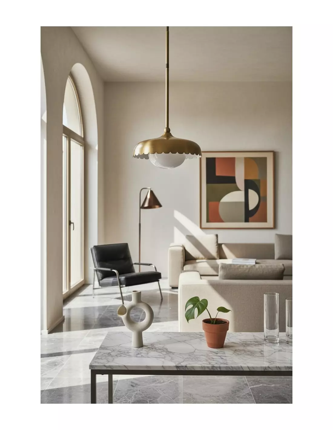 La suspension Scallop apporte une élégance ludique avec son abat-jour festonné en laiton et sa silhouette douce et incurvée. Conçue pour diffuser une lumière chaleureuse, elle crée une ambiance rétro au-dessus des tables à manger, des îlots de cuisine ou des couloirs. Polyvalente et intemporelle, elle apporte du charme aux intérieurs modernes comme classiques.