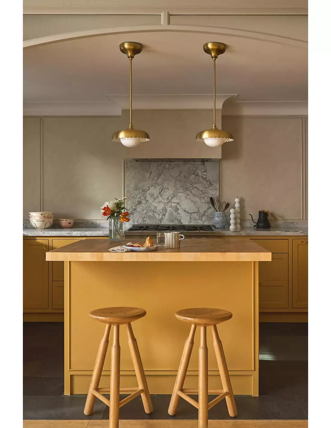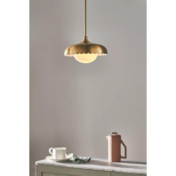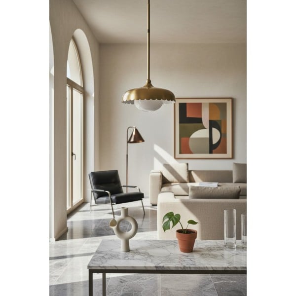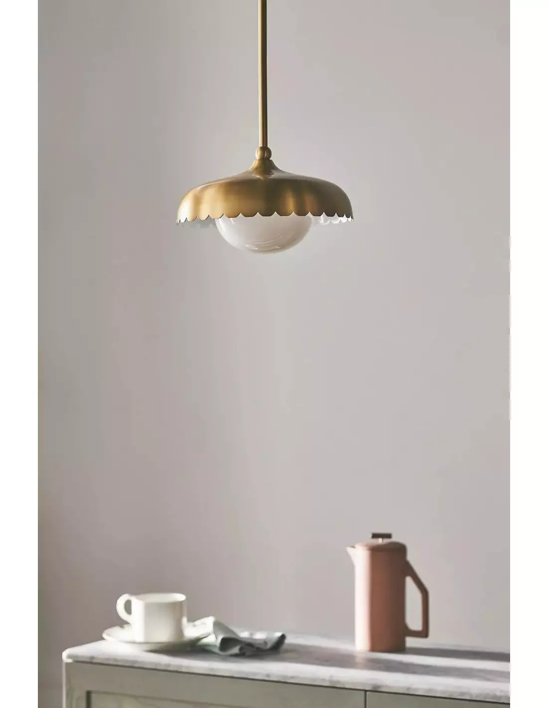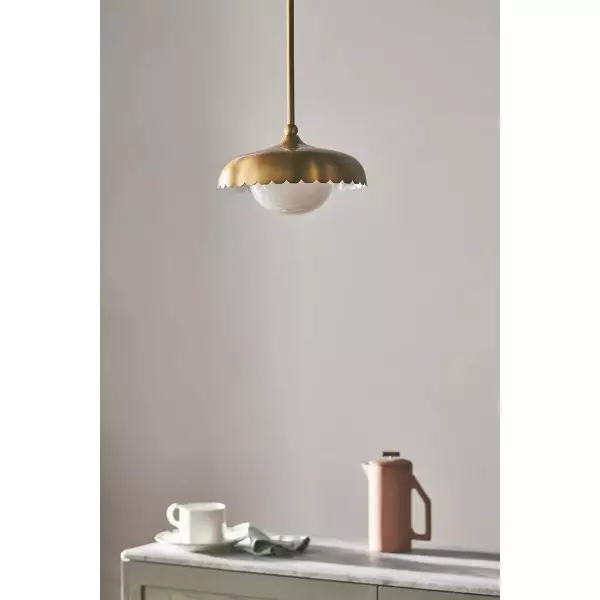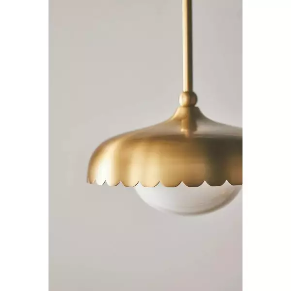 La suspension Scallop apporte une élégance ludique avec son abat-jour festonné en laiton et sa silhouette douce et incurvée. Conçue pour diffuser une lumière chaleureuse, elle crée une ambiance rétro au-dessus des tables à manger, des îlots de cuisine ou des couloirs. Polyvalente et intemporelle, elle apporte du charme aux intérieurs modernes comme classiques.
