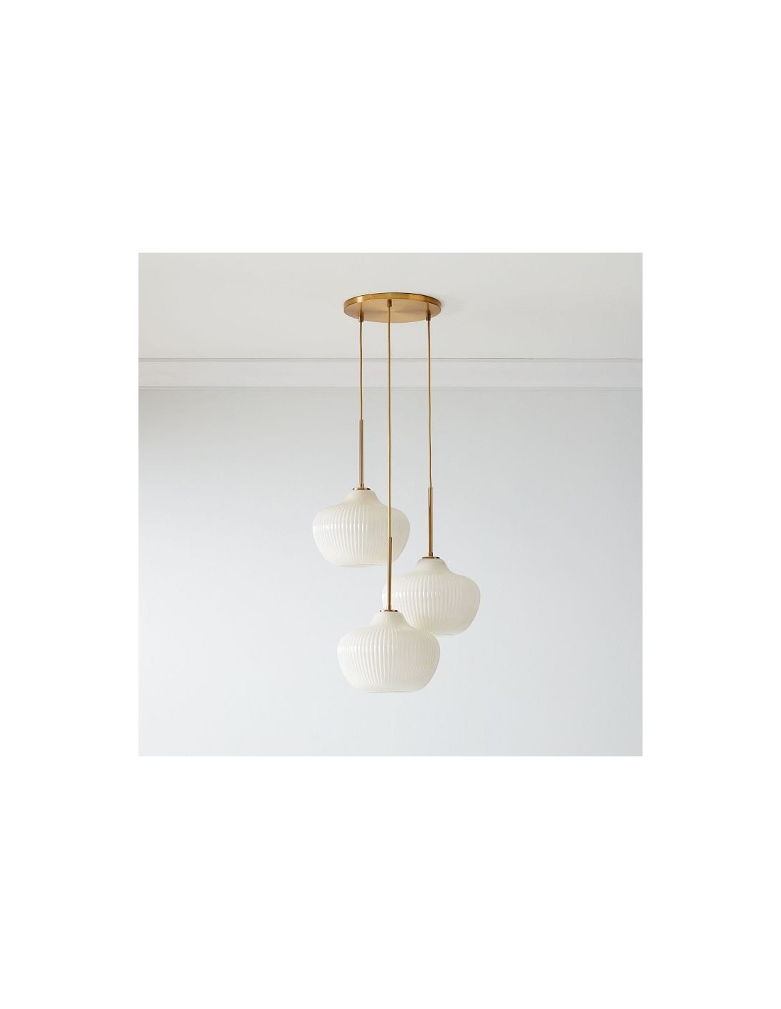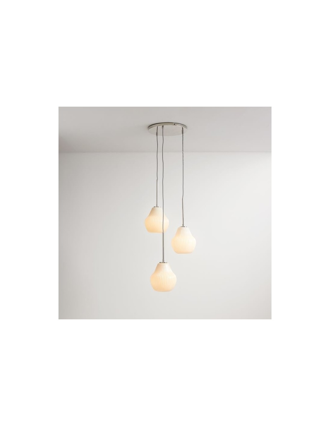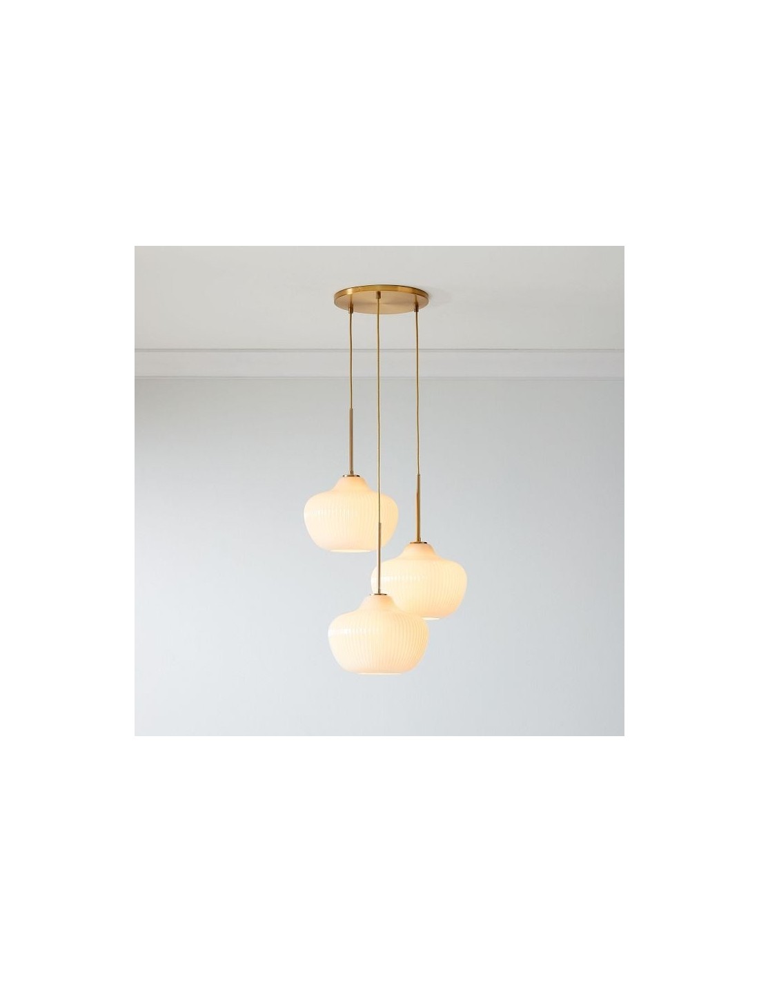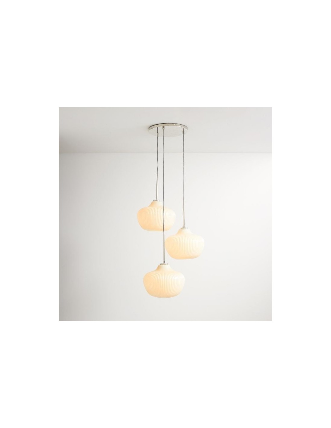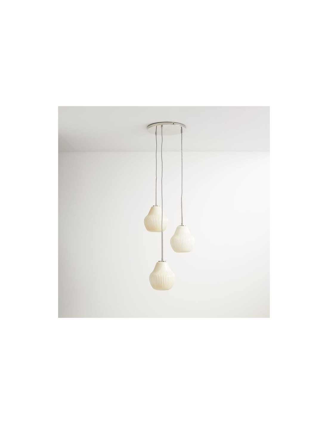 Le lustre à 3 lumières en verre strié offre une esthétique sculpturale et moderne. Ses abat-jour en verre cannelé diffusent une lumière chaleureuse et ambiante dans les couloirs, les salles à manger ou les entrées. Idéal comme lustre d'exception, il allie design artistique et fonctionnalité polyvalente pour des intérieurs élégants.