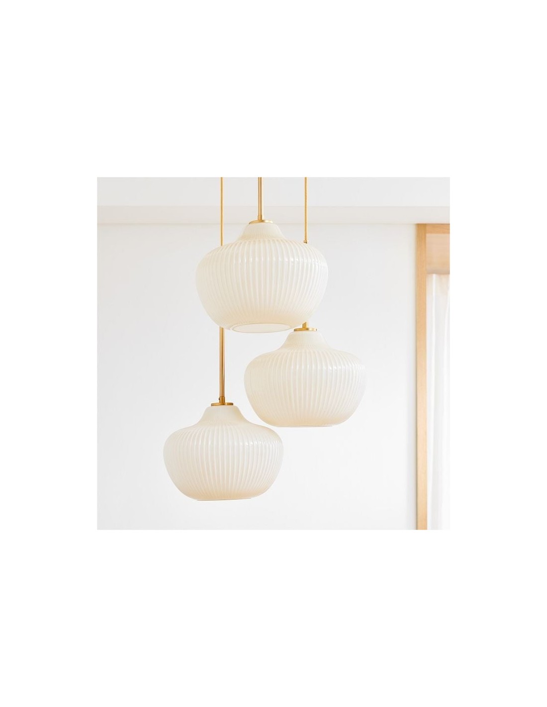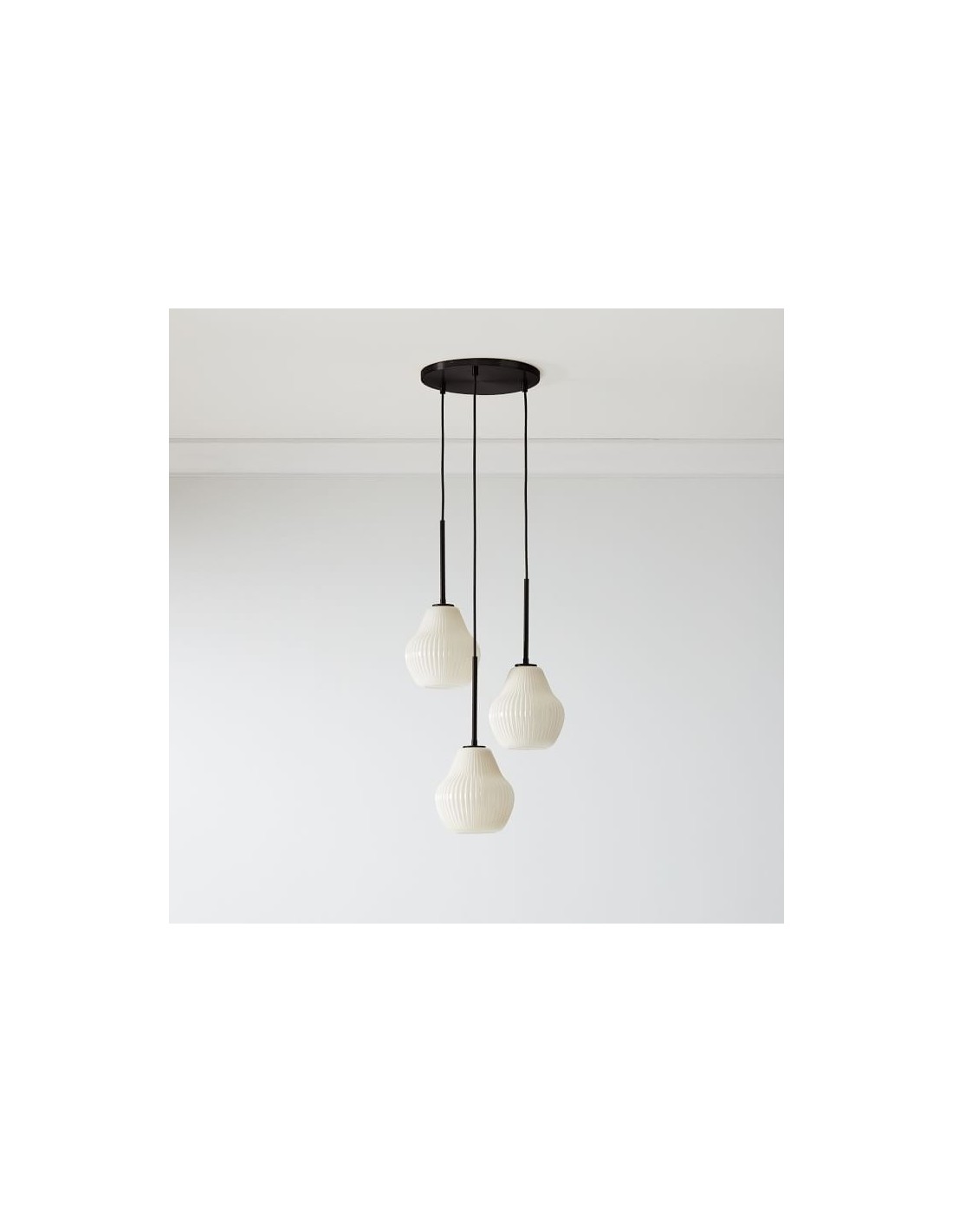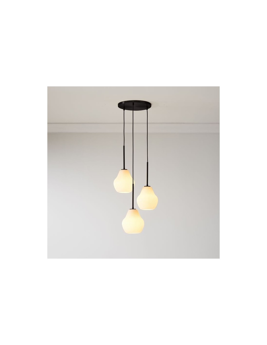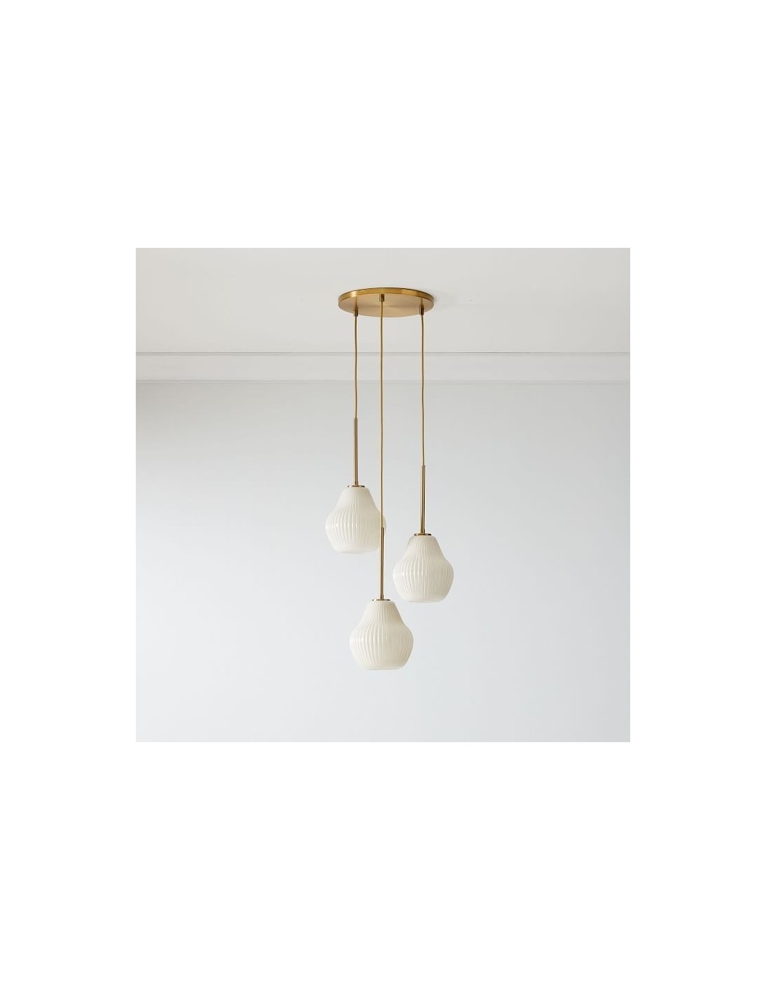 Le lustre à 3 lumières en verre strié offre une esthétique sculpturale et moderne. Ses abat-jour en verre cannelé diffusent une lumière chaleureuse et ambiante dans les couloirs, les salles à manger ou les entrées. Idéal comme lustre d'exception, il allie design artistique et fonctionnalité polyvalente pour des intérieurs élégants.
