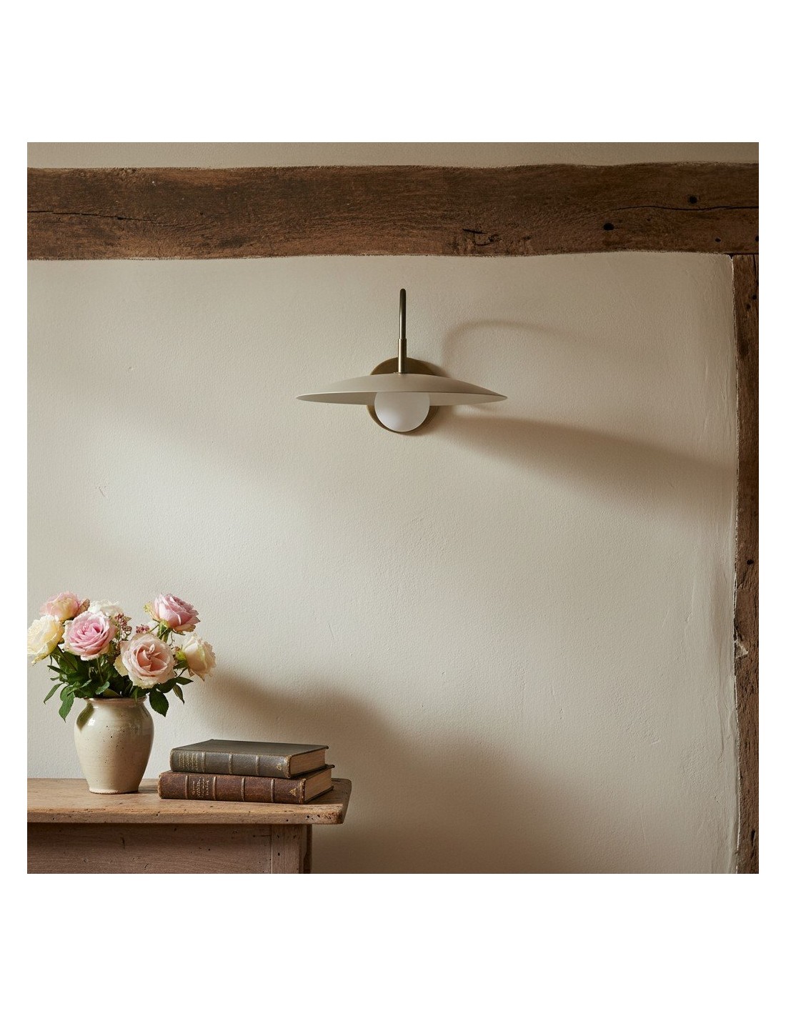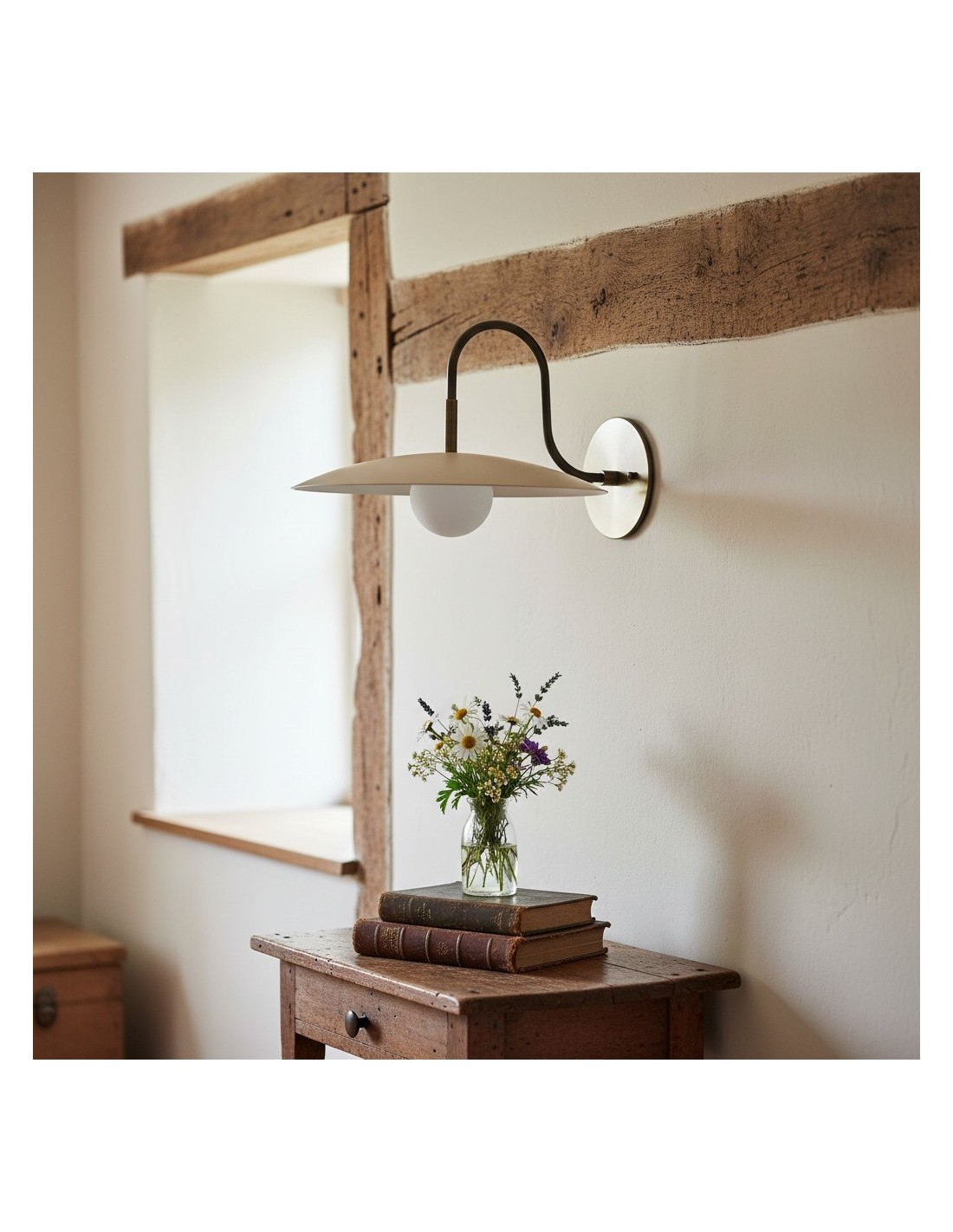 Sublimez vos murs avec cette applique sculpturale alliant minimalisme moderne et design élégant. Un bras fin en laiton antique s'enroule autour d'une plaque arrière ronde pour accueillir un large disque en métal crème mat. Le globe givré diffuse une douce lumière ambiante, idéale pour entourer les miroirs, illuminer les couloirs ou créer des touches chaleureuses près d'une table de chevet. Transformez n'importe quel espace en un havre de paix raffiné.