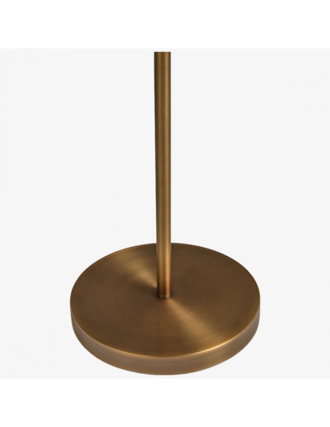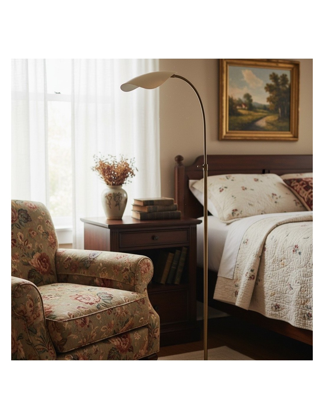 Le lampadaire Shella apporte une élégance sculpturale et un éclairage fonctionnel à toute pièce. Sa structure fine et arquée soutient un abat-jour gracieux en métal crème, évoquant des pétales, orientable pour diriger la lumière selon les besoins. Avec sa finition en laiton antique et sa fabrication en métal robuste, ce lampadaire allie minimalisme moderne et charme intemporel.