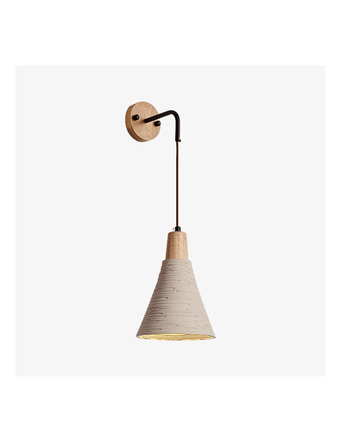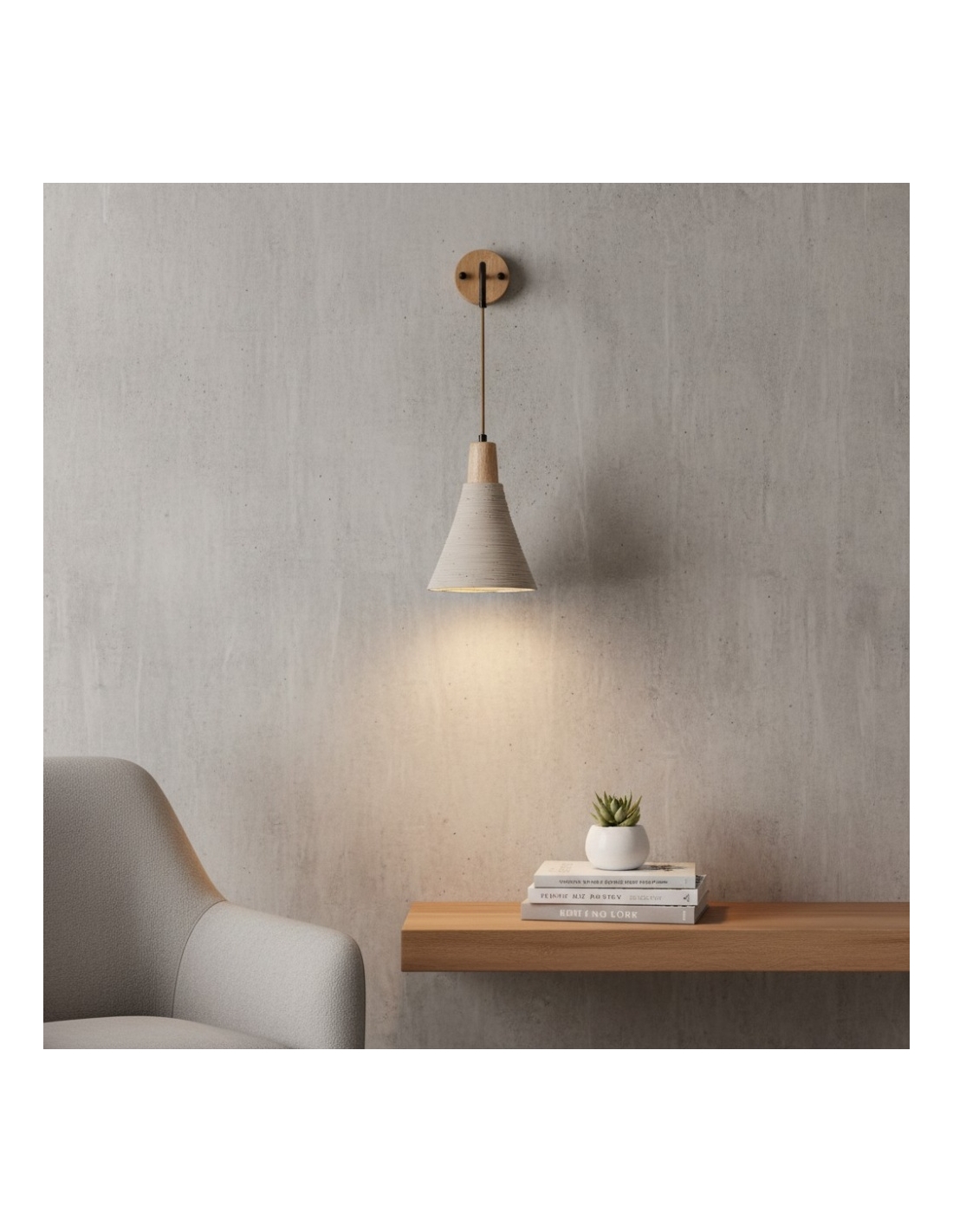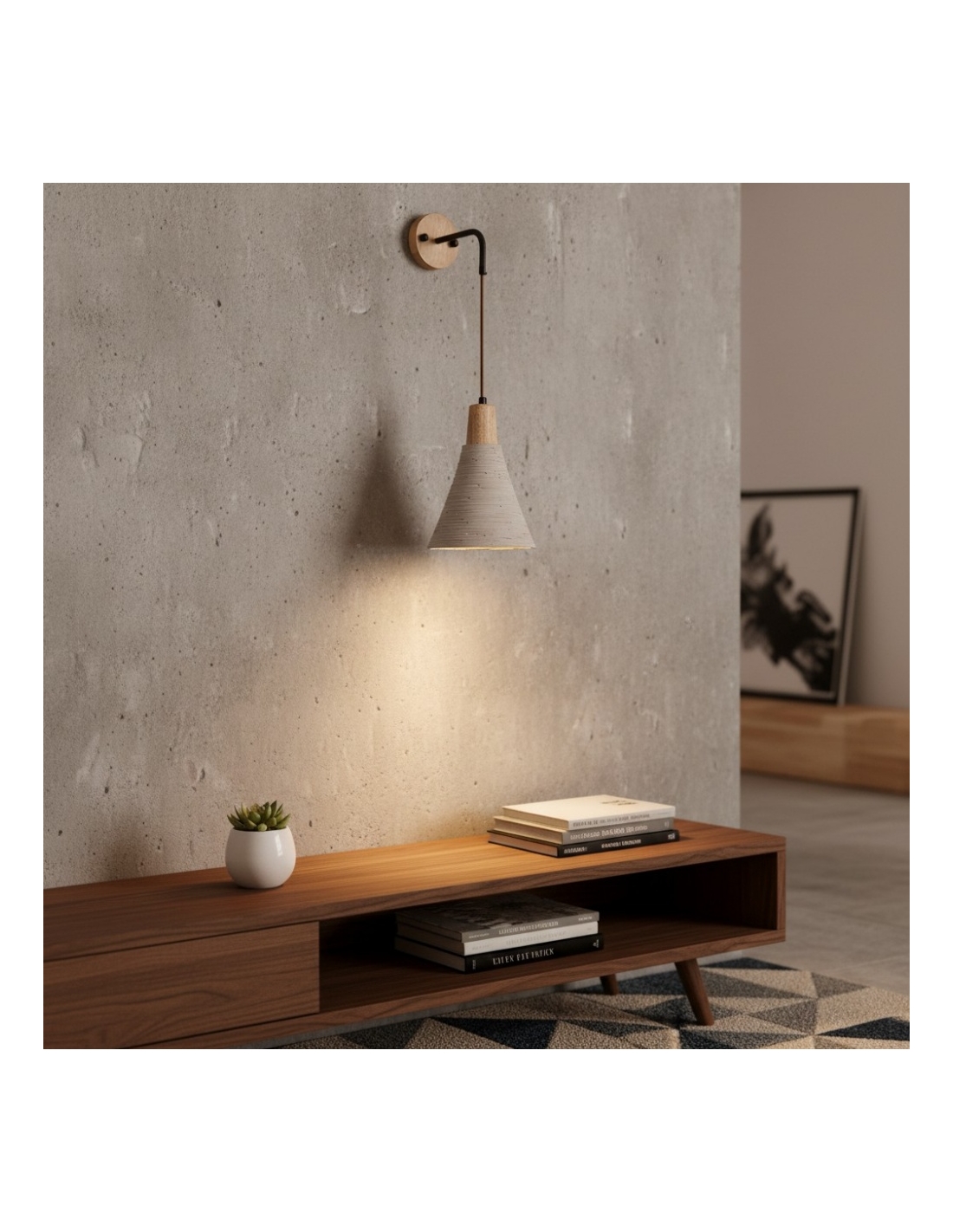 Cette applique murale minimaliste de style industriel est dotée d'un abat-jour conique en microciment sur une base en bois avec un bras en métal, diffusant une lumière douce vers le bas. Idéale pour les salons, les chambres, les couloirs et les coins cosy dans les intérieurs modernes ou wabi-sabi.