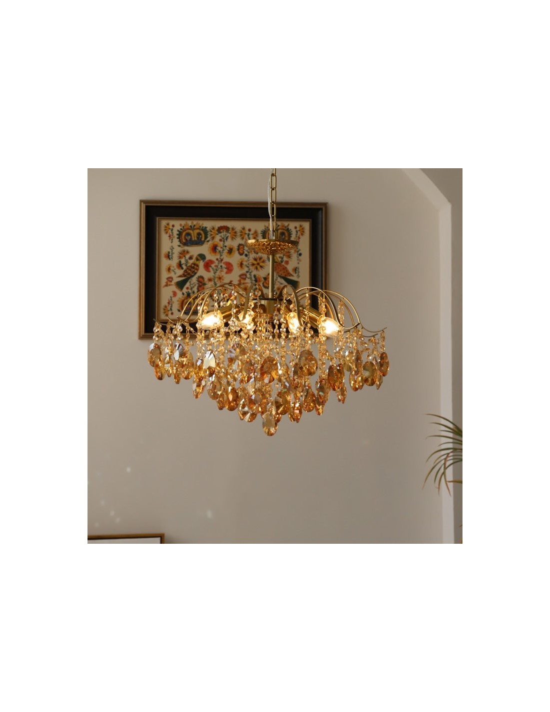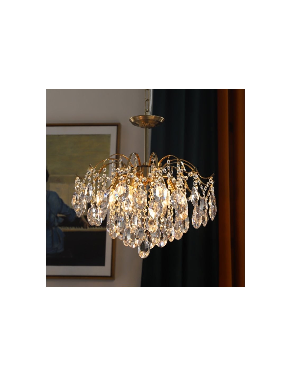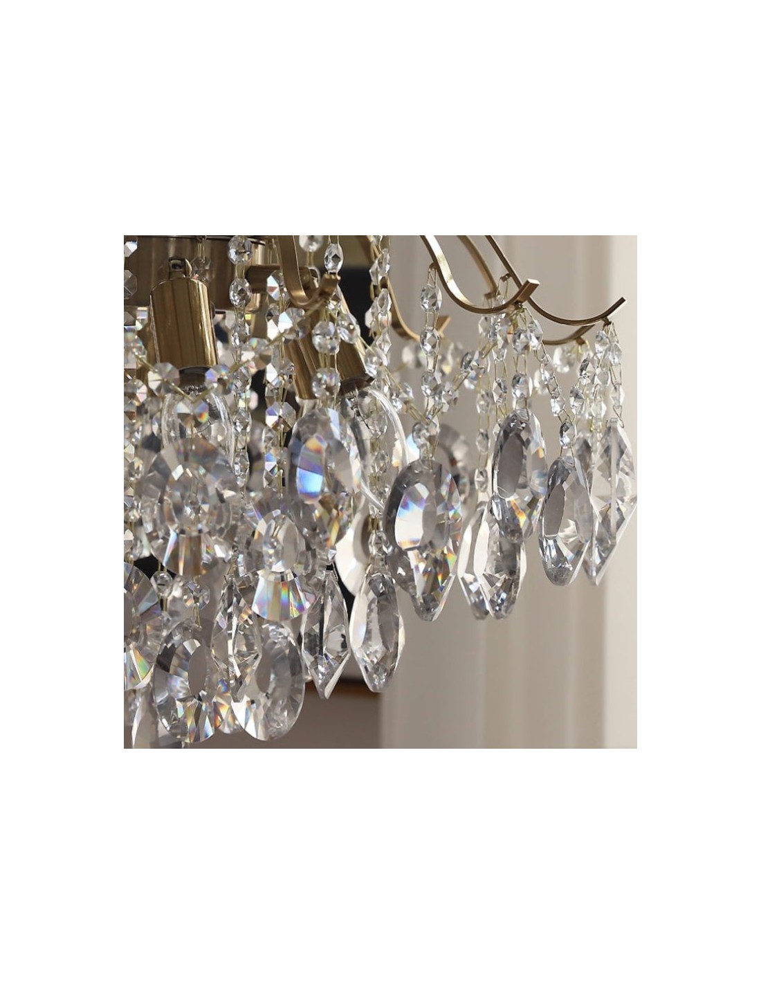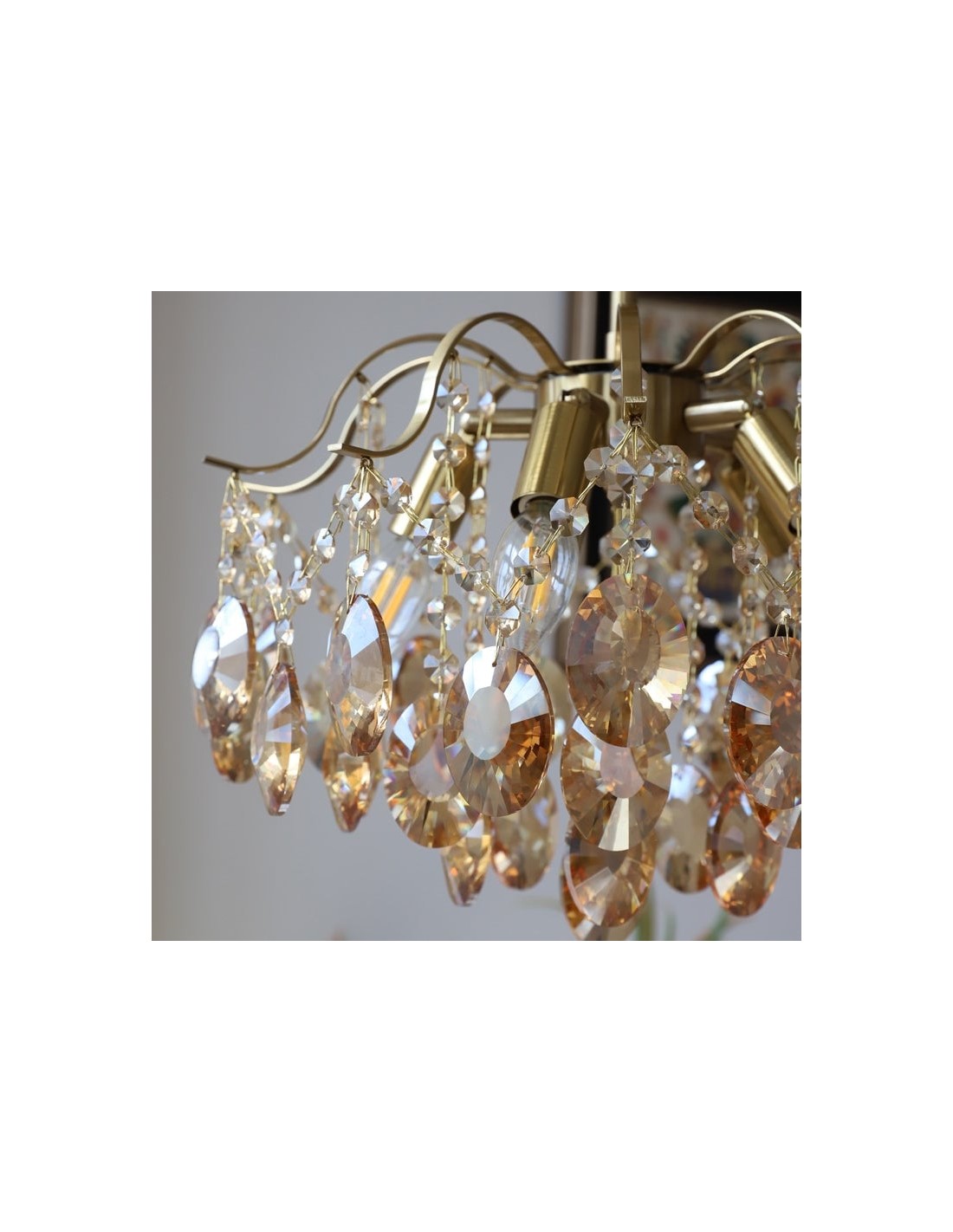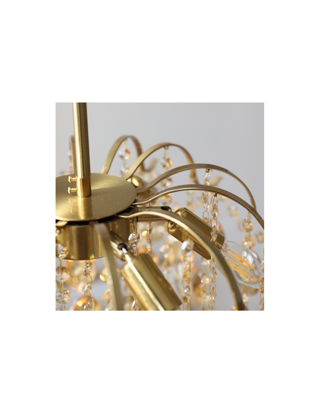 Un lustre exclusif qui devient un élément phare de chaque pièce grâce à son somptueux lustre en cristal. De nombreuses chaînes ornées de cristaux, petits et grands, pendent des bras incurvés de son cadre doré, qui scintillent à la lumière. Associé à la couleur du cadre, il apporte une touche d'élégance.