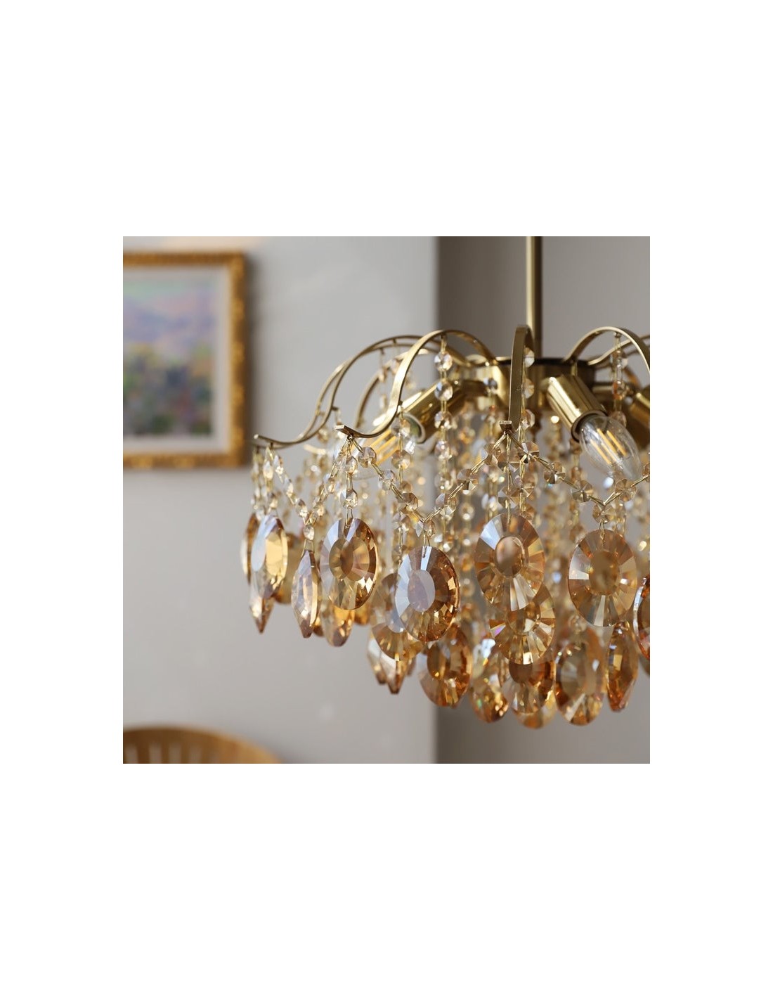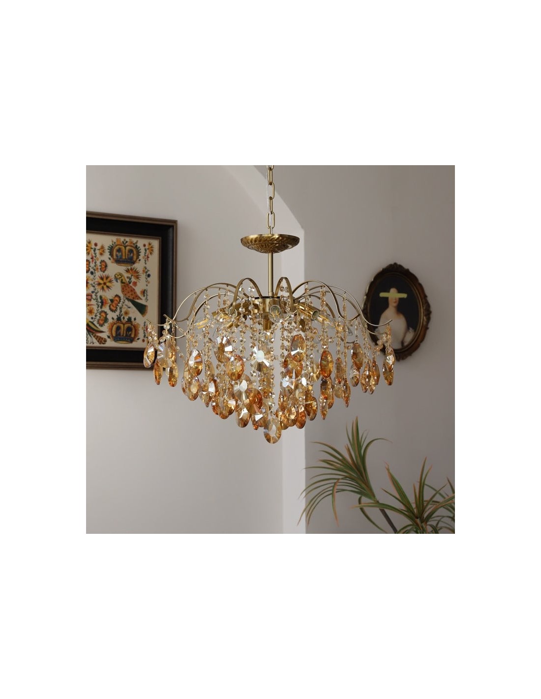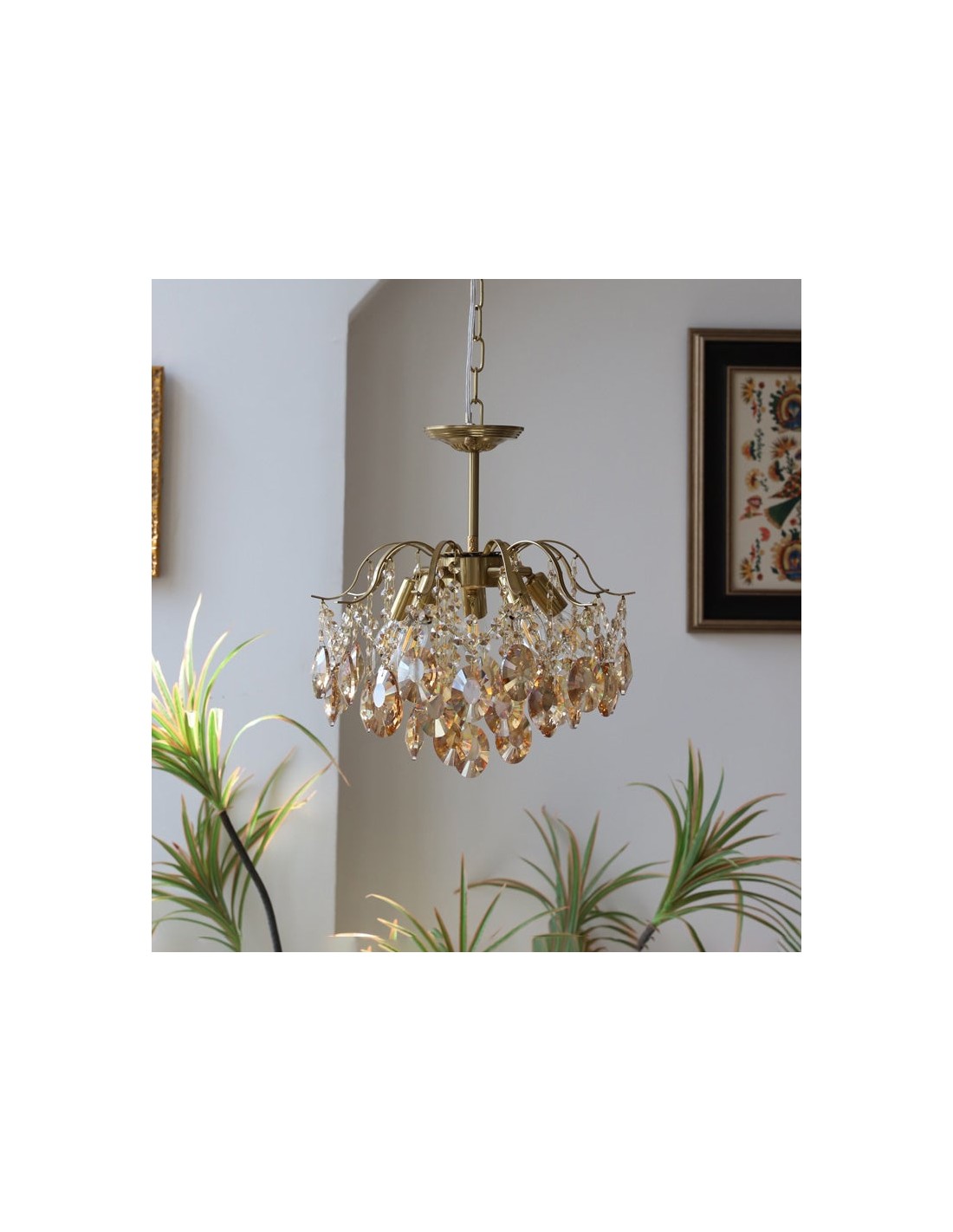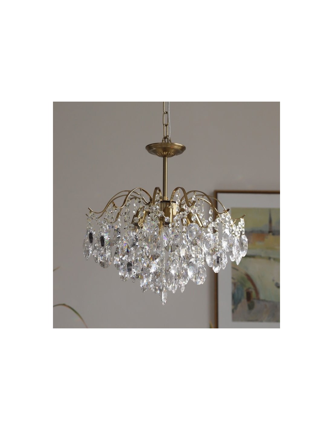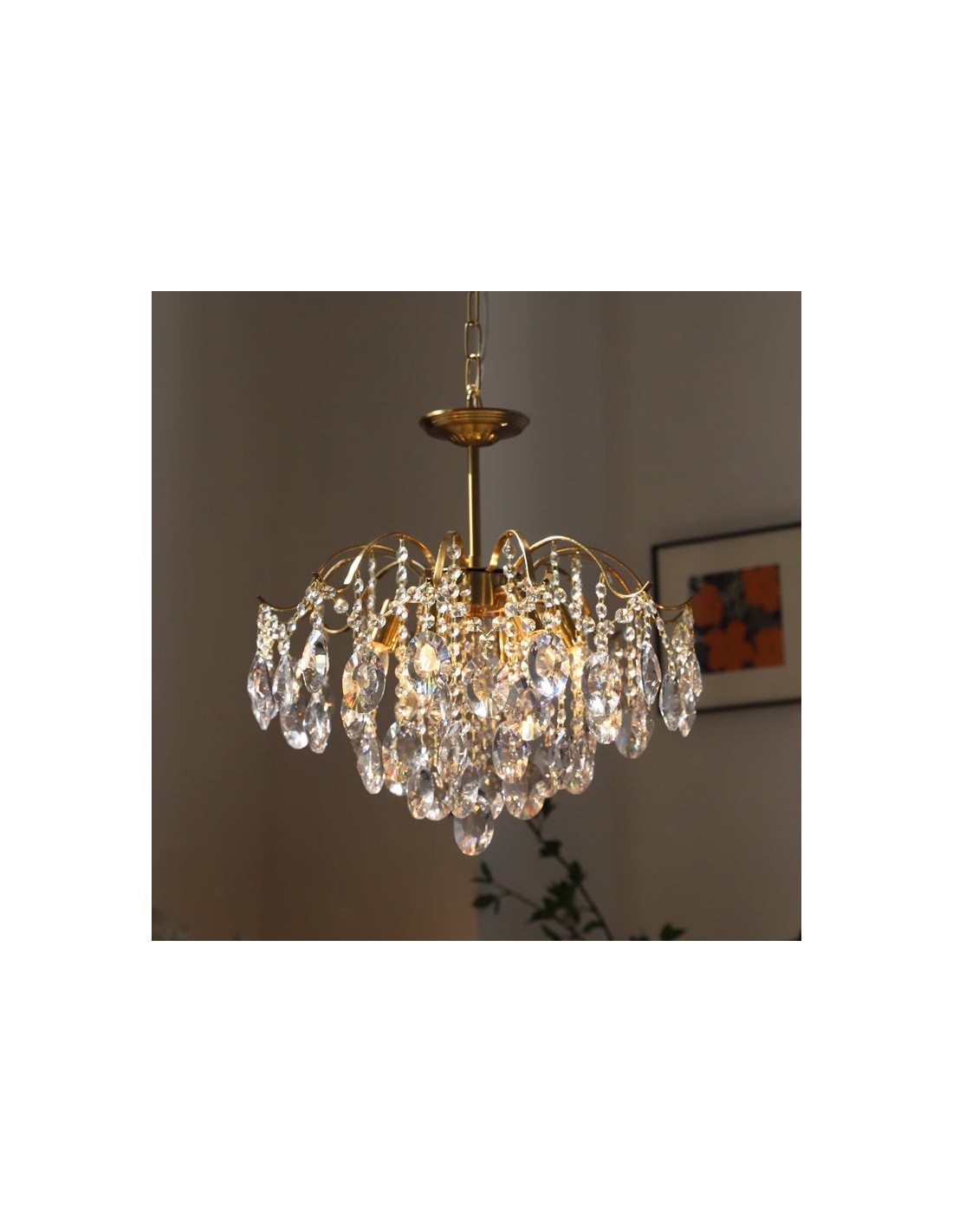 Un lustre exclusif qui devient un élément phare de chaque pièce grâce à son somptueux lustre en cristal. De nombreuses chaînes ornées de cristaux, petits et grands, pendent des bras incurvés de son cadre doré, qui scintillent à la lumière. Associé à la couleur du cadre, il apporte une touche d'élégance.