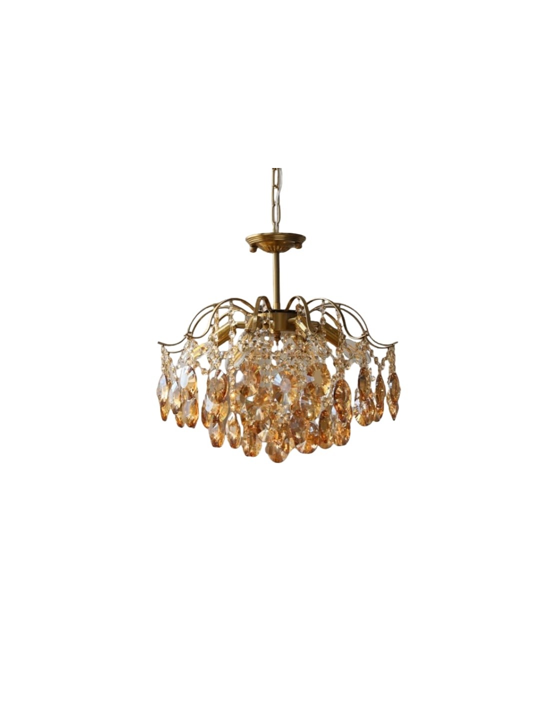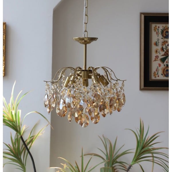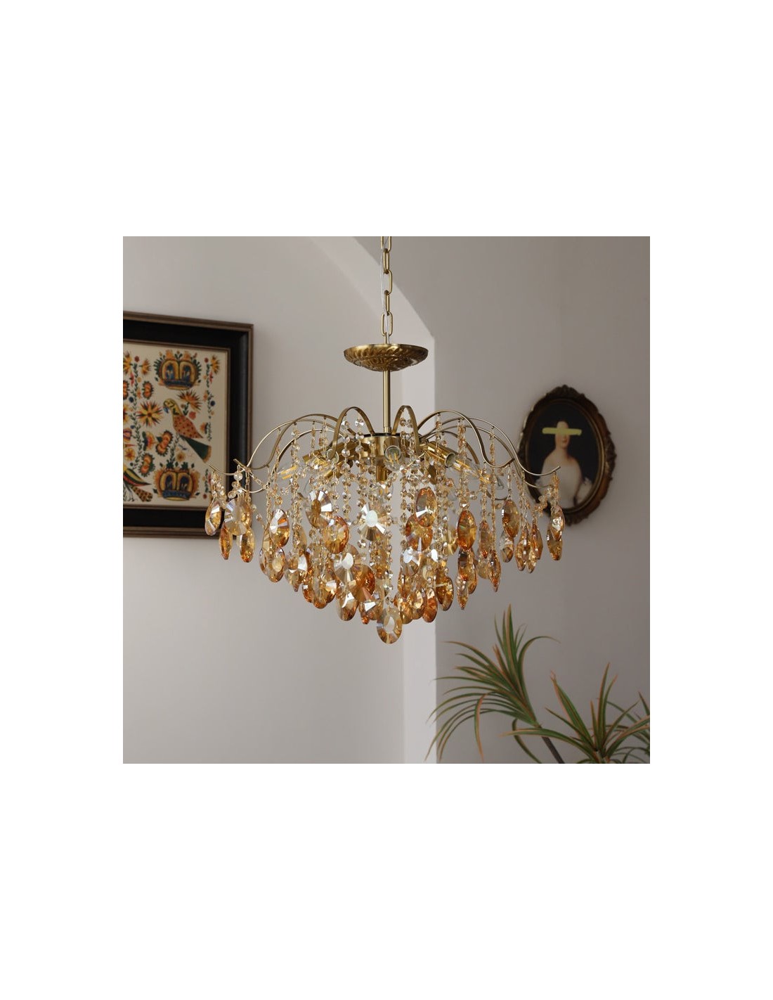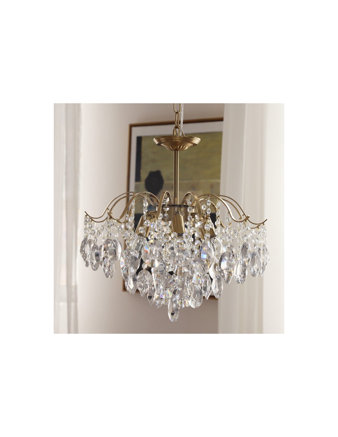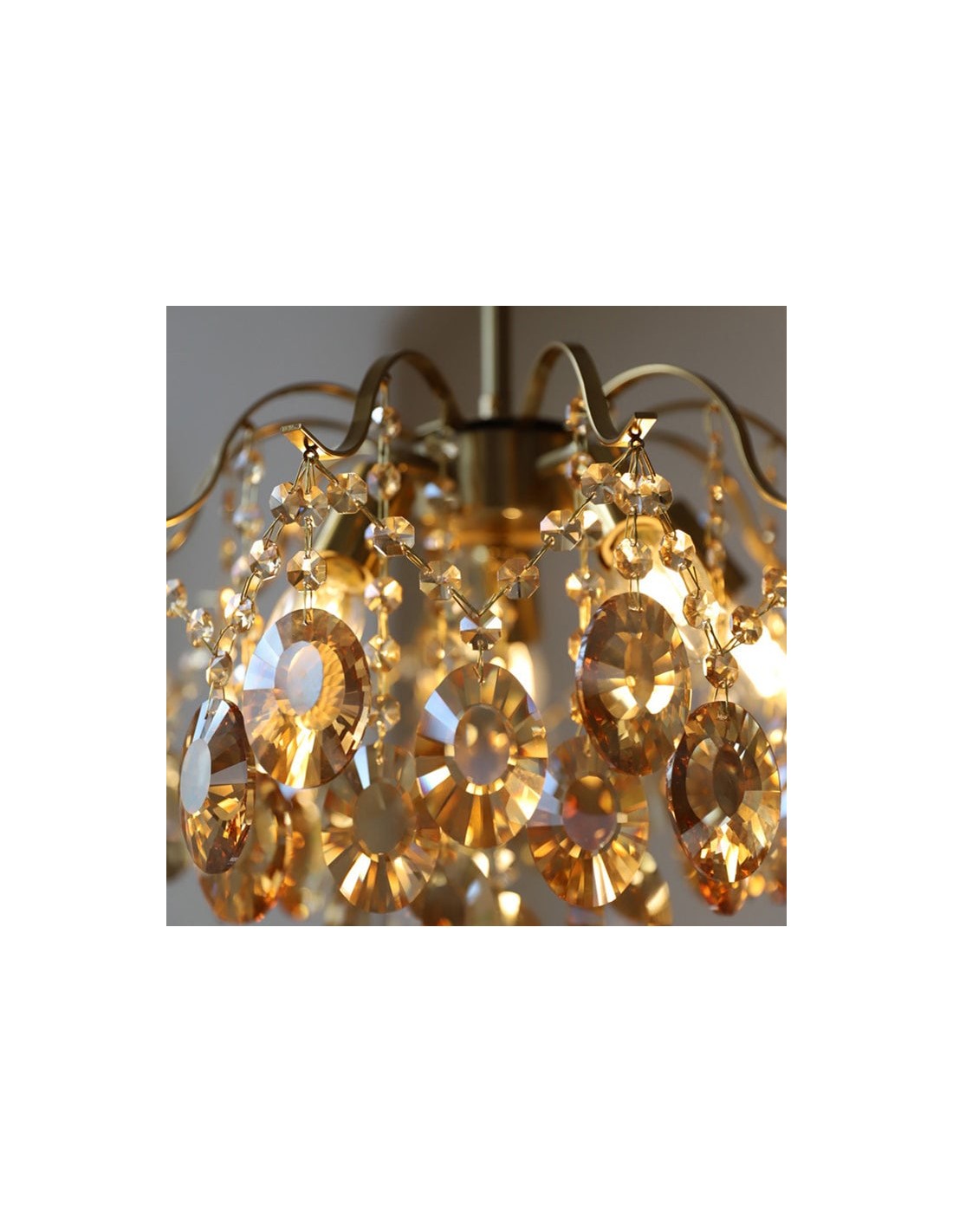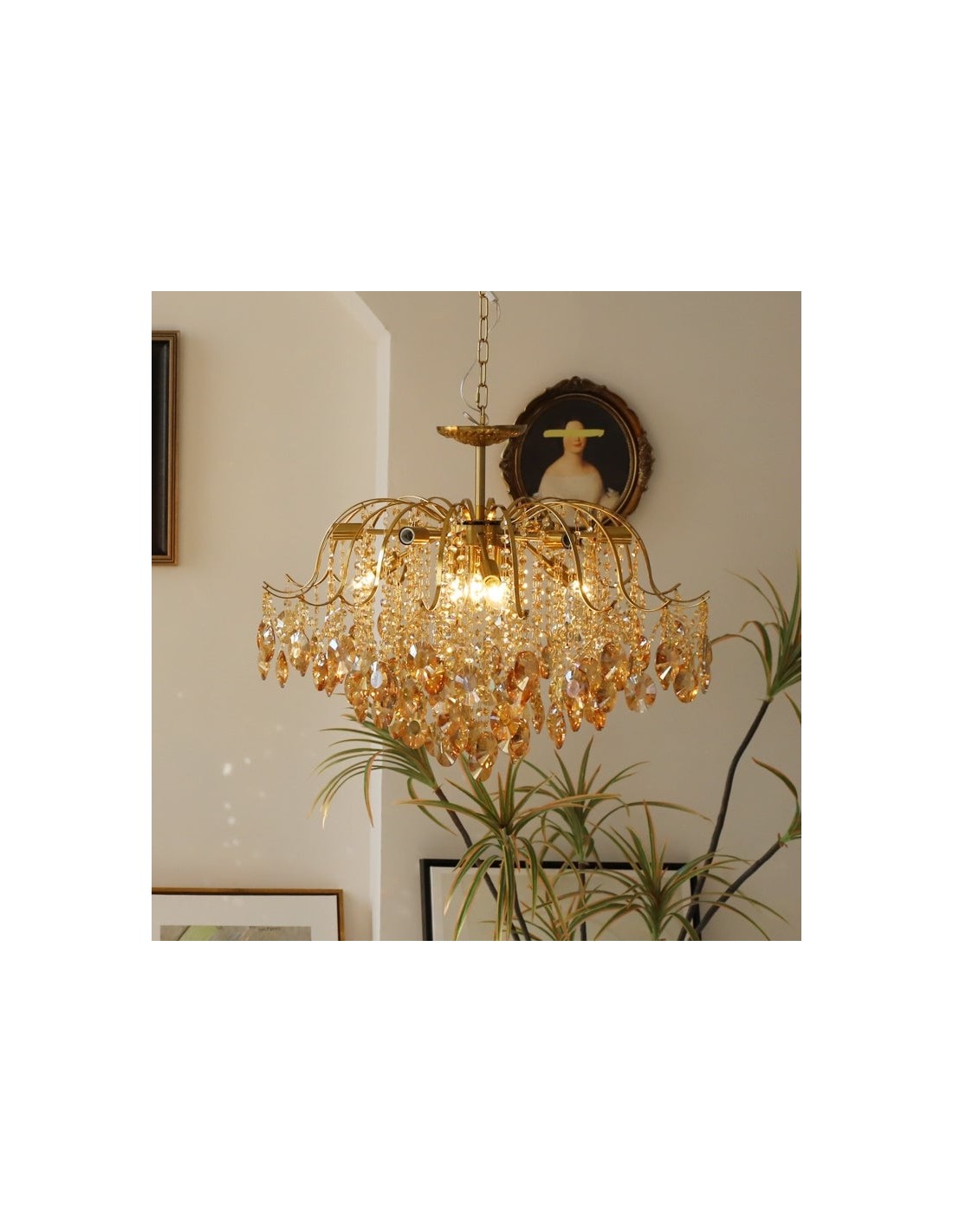 Un lustre exclusif qui devient un élément phare de chaque pièce grâce à son somptueux lustre en cristal. De nombreuses chaînes ornées de cristaux, petits et grands, pendent des bras incurvés de son cadre doré, qui scintillent à la lumière. Associé à la couleur du cadre, il apporte une touche d'élégance.