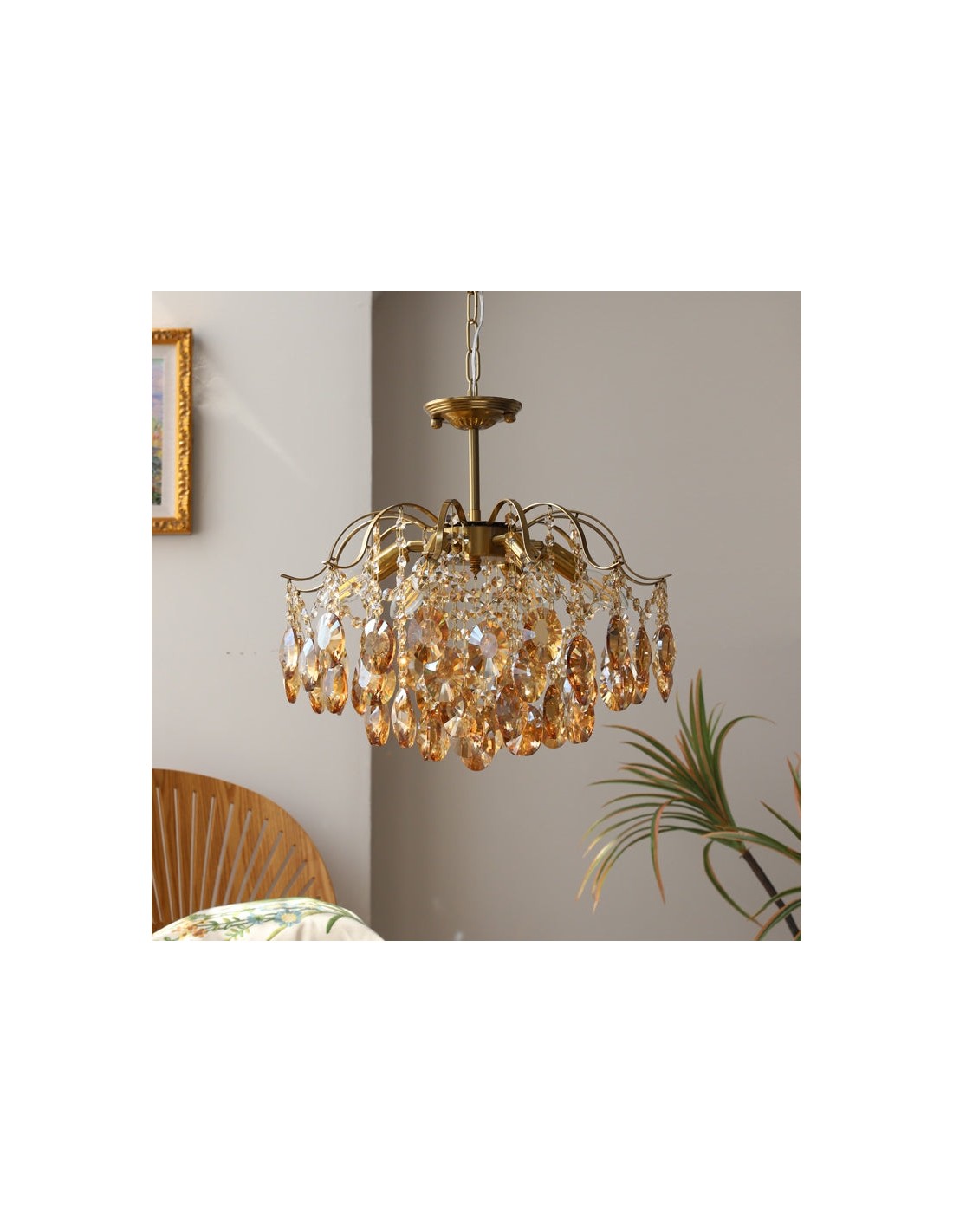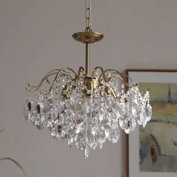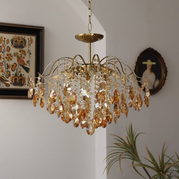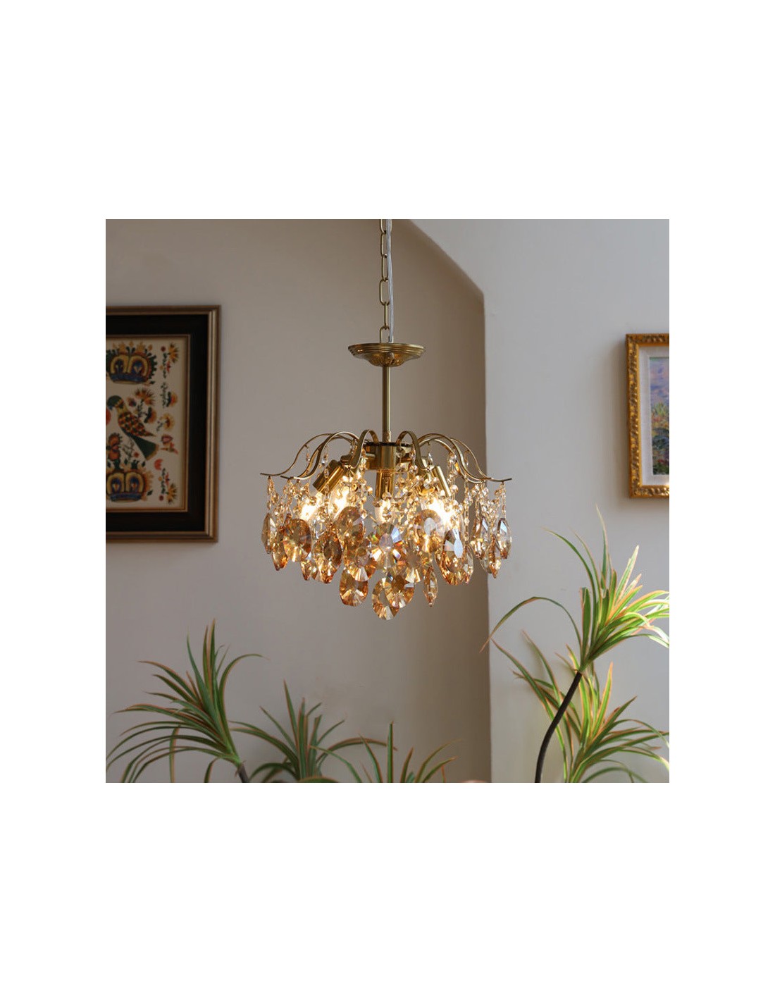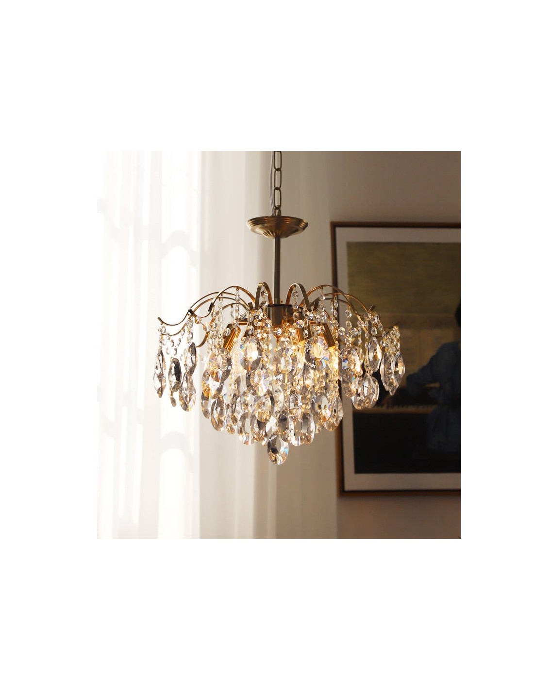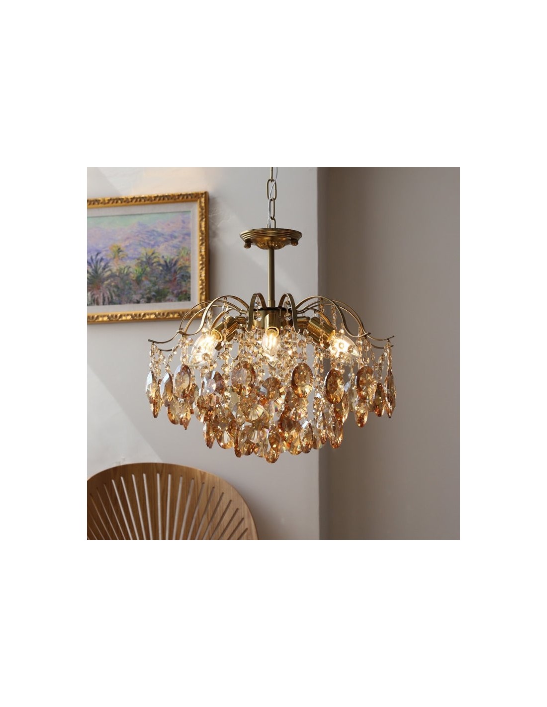 Un lustre exclusif qui devient un élément phare de chaque pièce grâce à son somptueux lustre en cristal. De nombreuses chaînes ornées de cristaux, petits et grands, pendent des bras incurvés de son cadre doré, qui scintillent à la lumière. Associé à la couleur du cadre, il apporte une touche d'élégance.