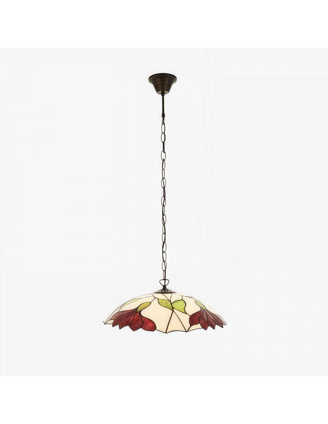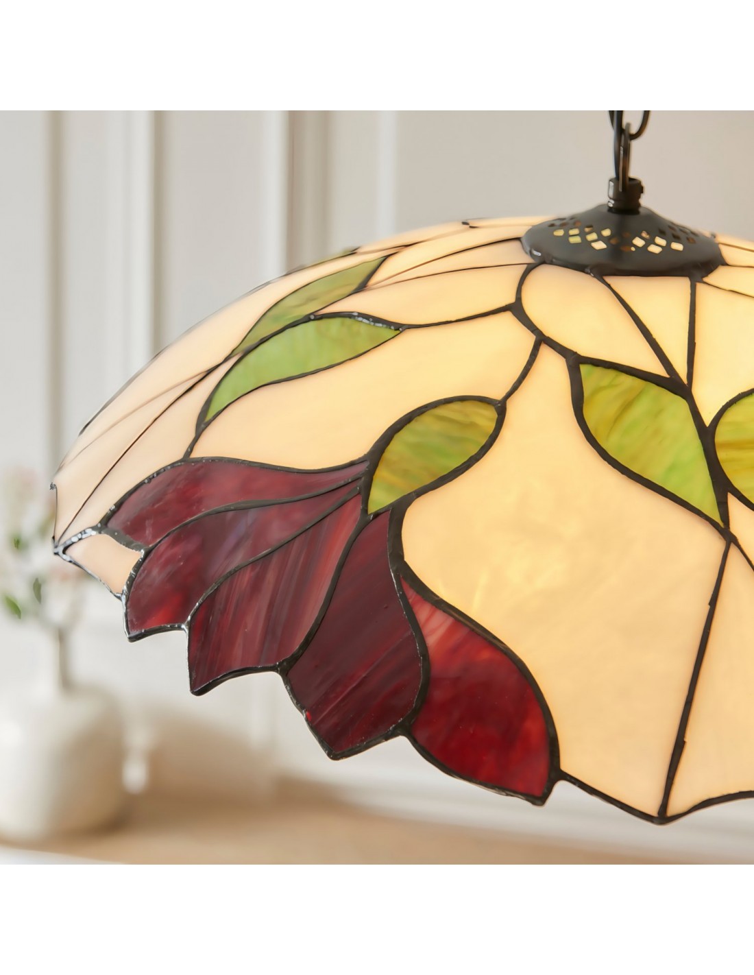 Cette suspension en verre à motif floral est dotée d'un abat-jour en verre soufflé à la main, orné de motifs floraux aux couleurs chaudes et translucides, diffusant une lumière douce et accueillante. Son élégante structure en métal et sa chaîne lui confèrent un style intemporel et permettent de régler la hauteur de suspension. Idéale pour le salon, la salle à manger ou la cuisine, elle apporte une touche artistique et un éclairage d'ambiance à tous les espaces.