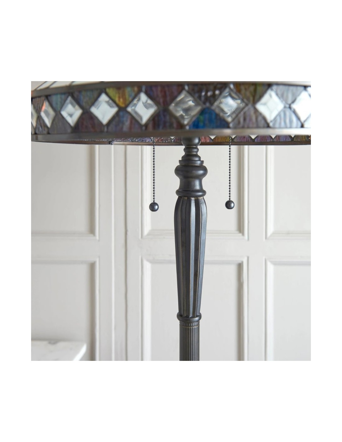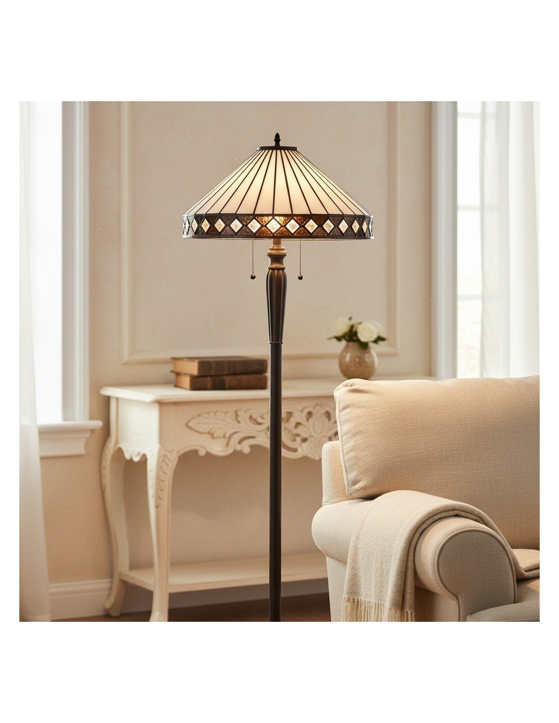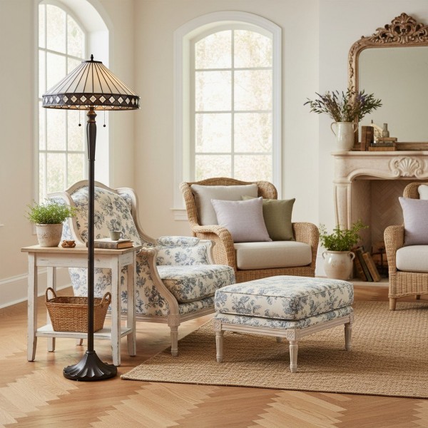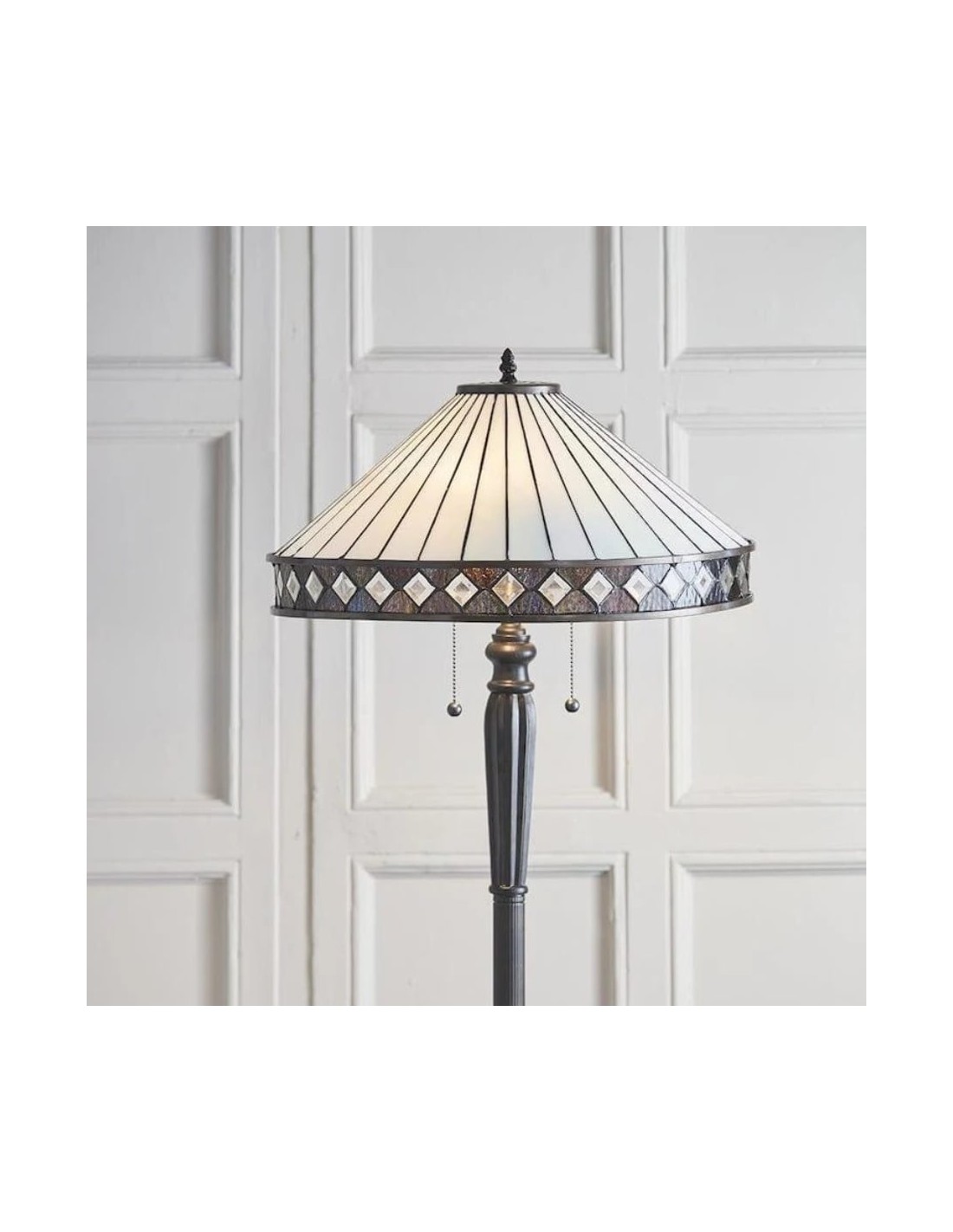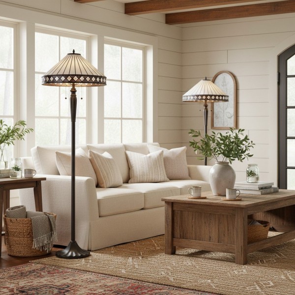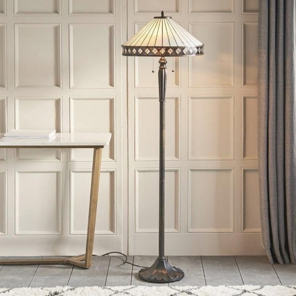 Illuminez votre espace avec le lampadaire TF Fargo. Inspiré de l'Art déco, ce luminaire est doté d'un abat-jour géométrique de style Tiffany, réalisé artisanalement, qui diffuse une lumière chaleureuse. Son pied robuste en bronze foncé lui confère un charme vintage, faisant de ce lampadaire une pièce maîtresse idéale pour un salon, une chambre ou un bureau.