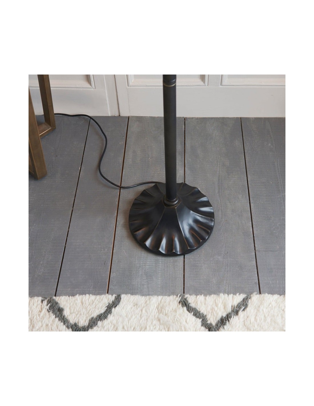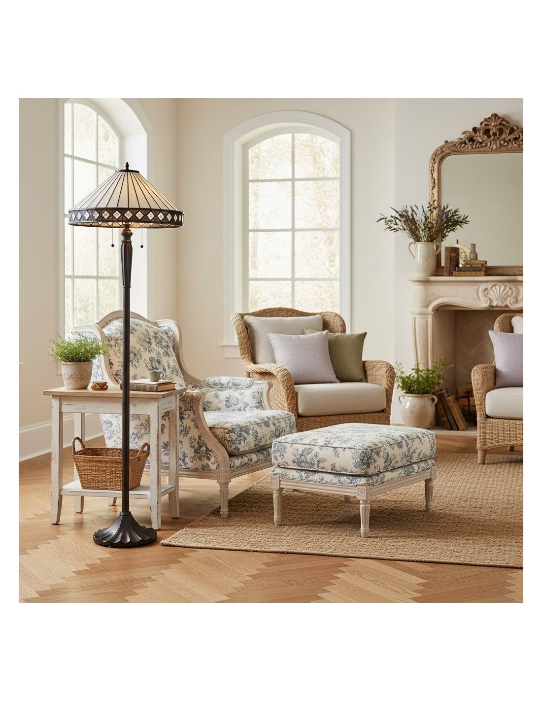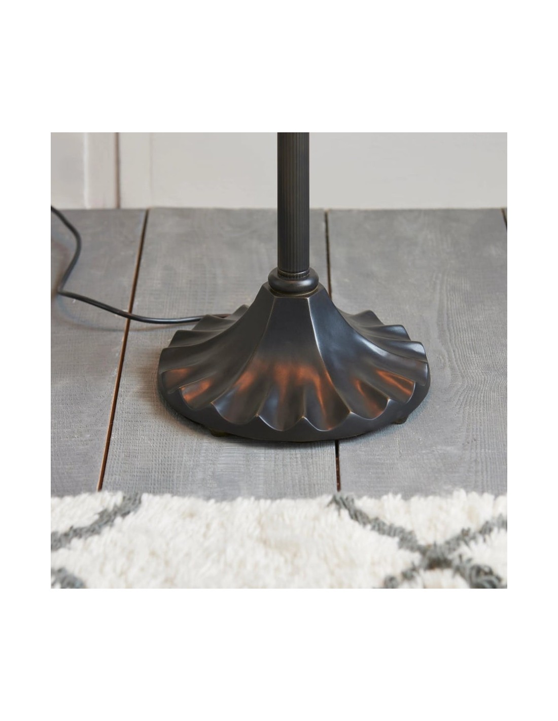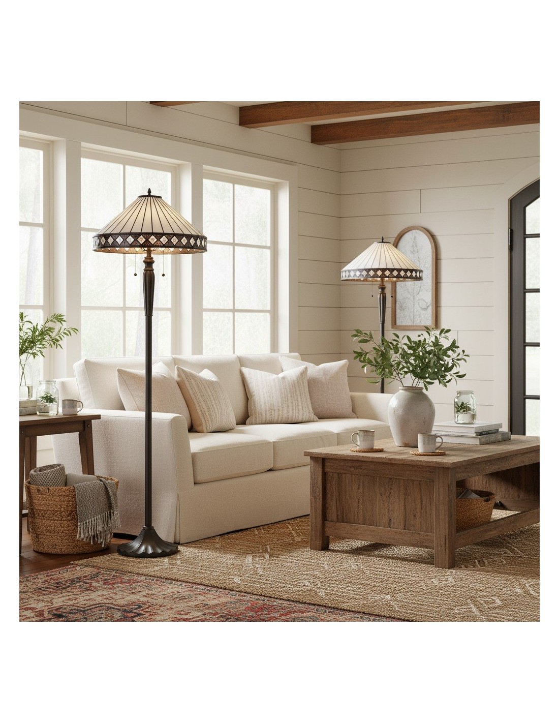 Illuminez votre espace avec le lampadaire TF Fargo. Inspiré de l'Art déco, ce luminaire est doté d'un abat-jour géométrique de style Tiffany, réalisé artisanalement, qui diffuse une lumière chaleureuse. Son pied robuste en bronze foncé lui confère un charme vintage, faisant de ce lampadaire une pièce maîtresse idéale pour un salon, une chambre ou un bureau.