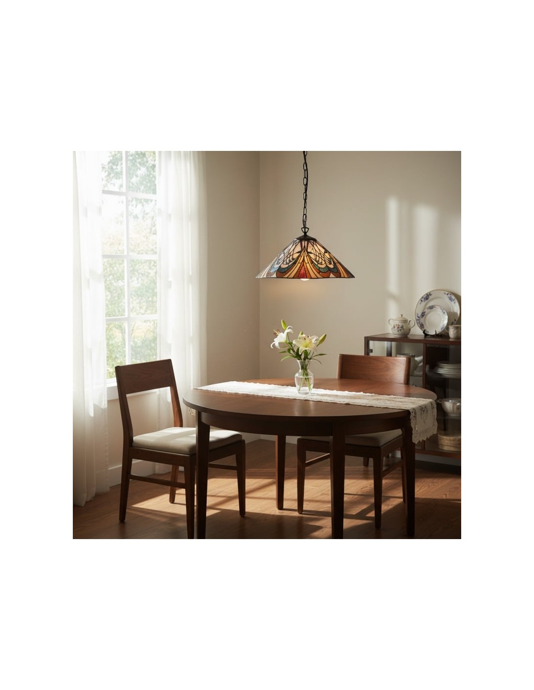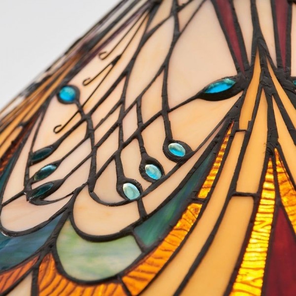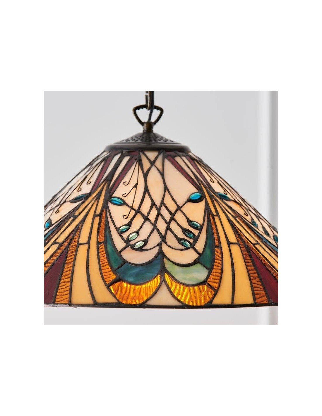 Cette suspension met en valeur un abat-jour en vitrail finement travaillé, orné de motifs Art nouveau complexes. Équipée d'une seule ampoule, elle apporte élégance et touche décorative aux salles à manger, couloirs, salons ou chambres, et sa hauteur de suspension ajustable permet une installation polyvalente.