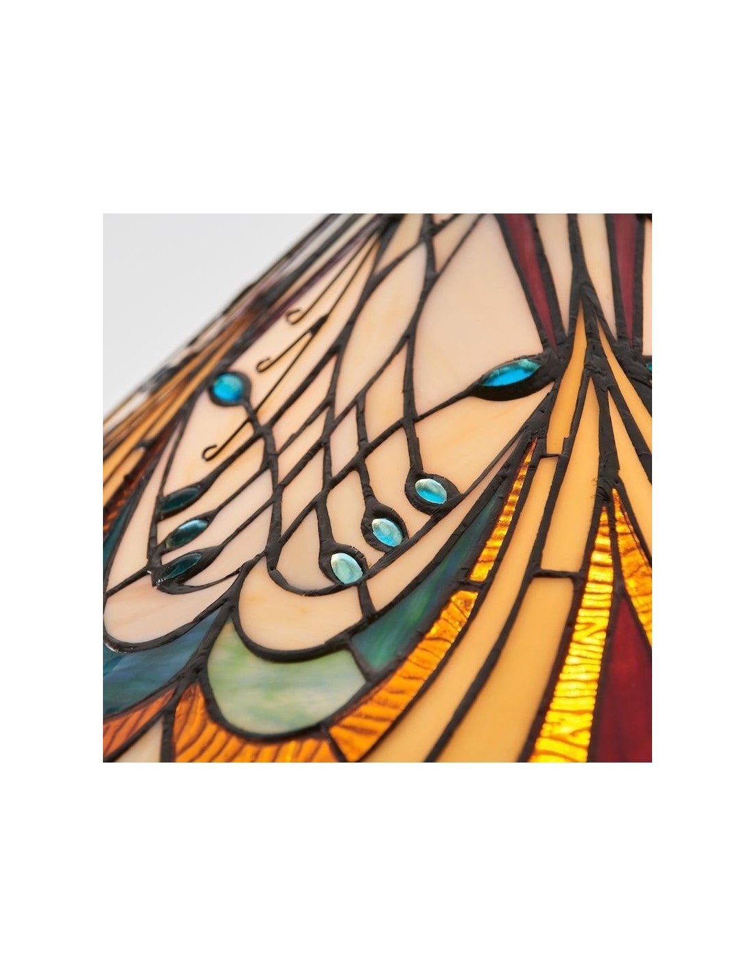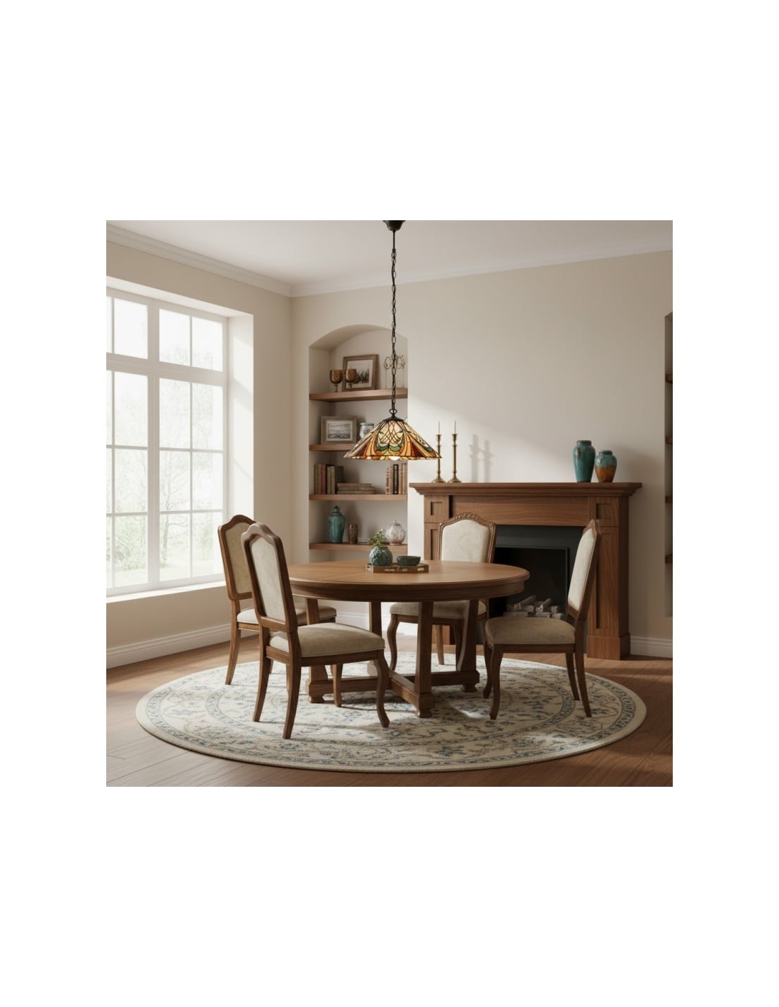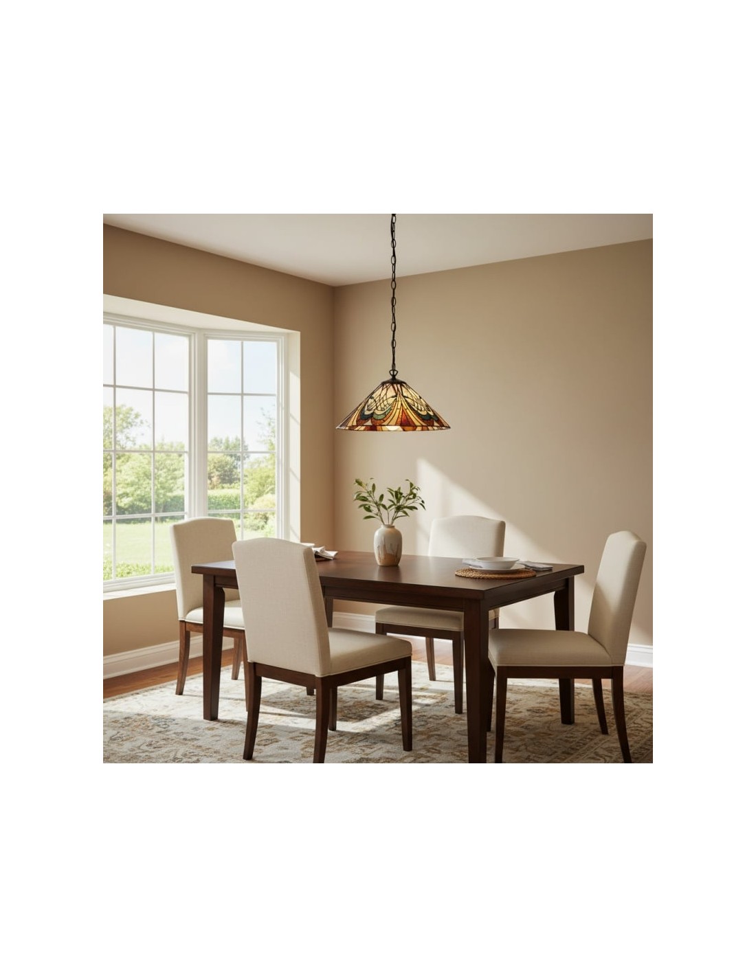 Cette suspension met en valeur un abat-jour en vitrail finement travaillé, orné de motifs Art nouveau complexes. Équipée d'une seule ampoule, elle apporte élégance et touche décorative aux salles à manger, couloirs, salons ou chambres, et sa hauteur de suspension ajustable permet une installation polyvalente.