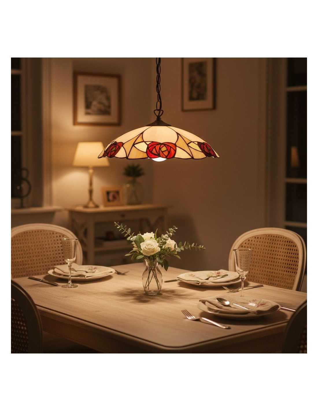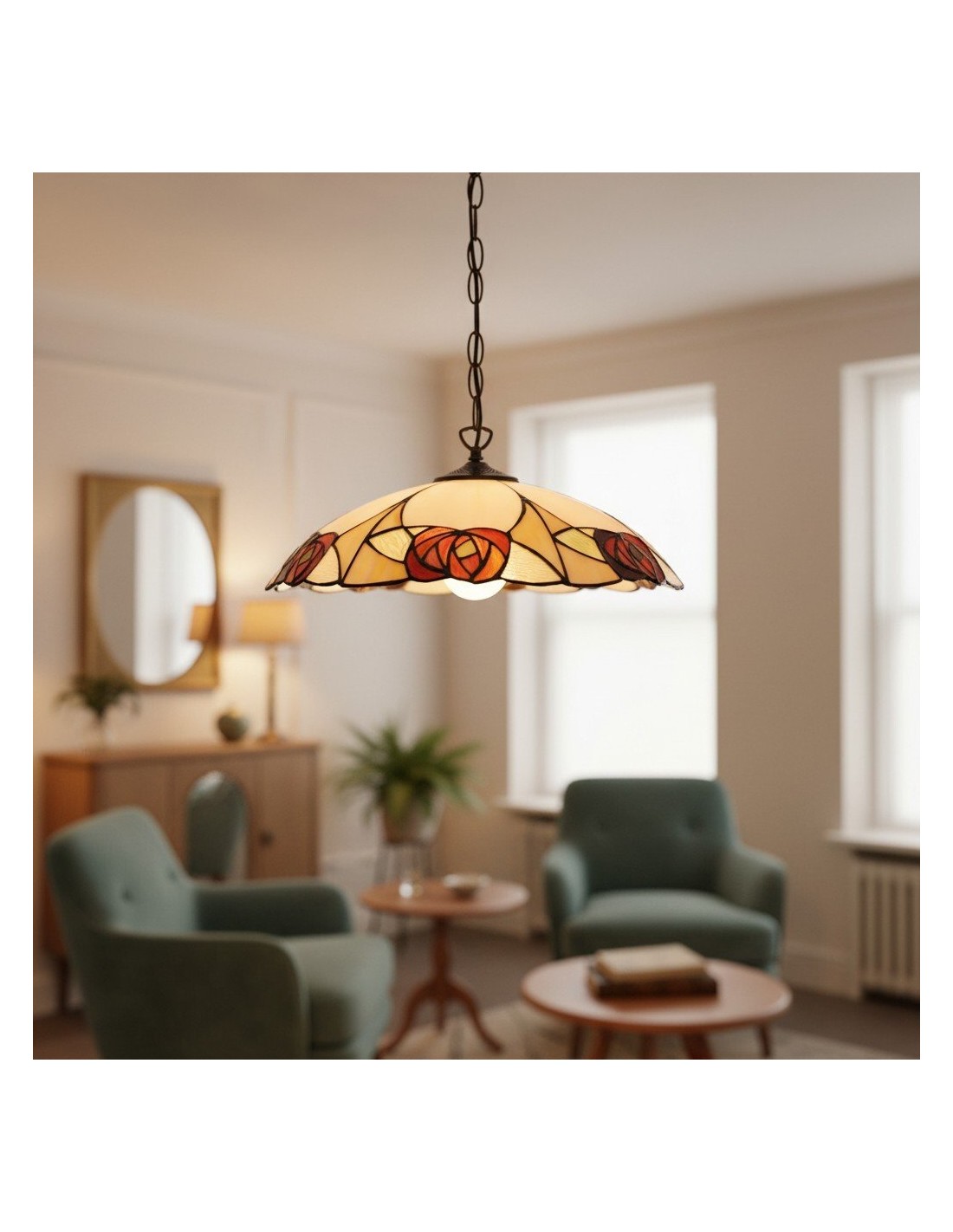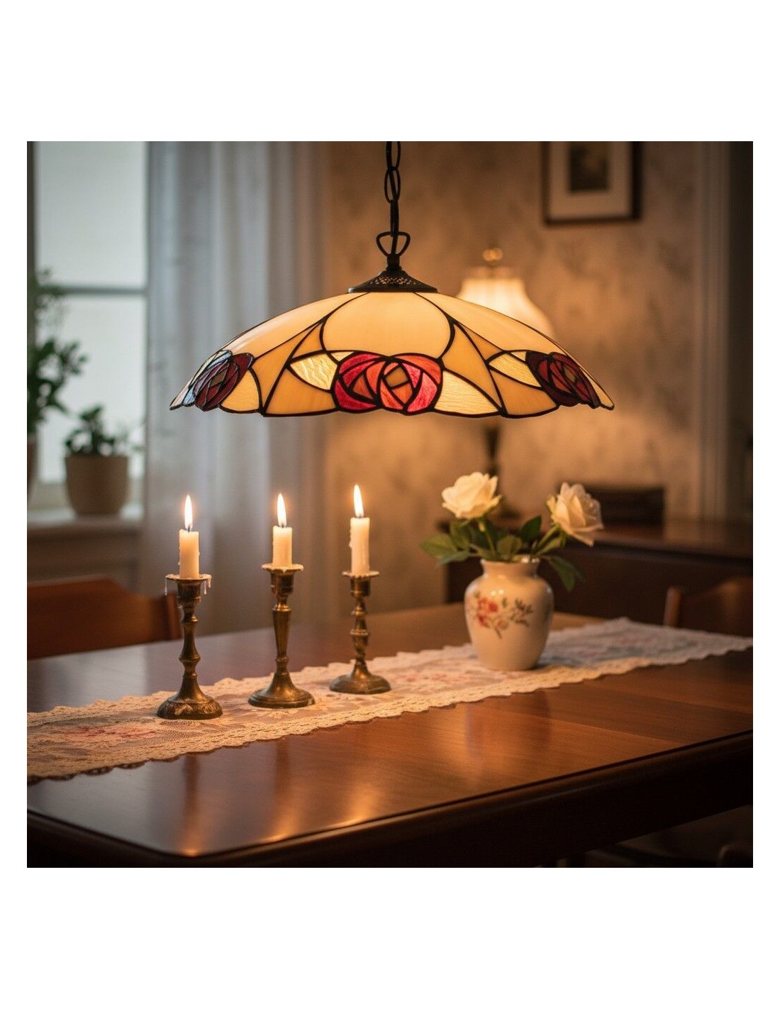 Un superbe pendentif de style Tiffany, alliant un abat-jour en verre soufflé à la main à une structure métallique sculptée pour un charme d'antan instantané. Ce grand pendentif arbore des motifs floraux et géométriques complexes, un bord festonné et une hauteur réglable ; idéal au-dessus d'une table à manger, d'un îlot de cuisine, d'un couloir ou d'une entrée commerciale.