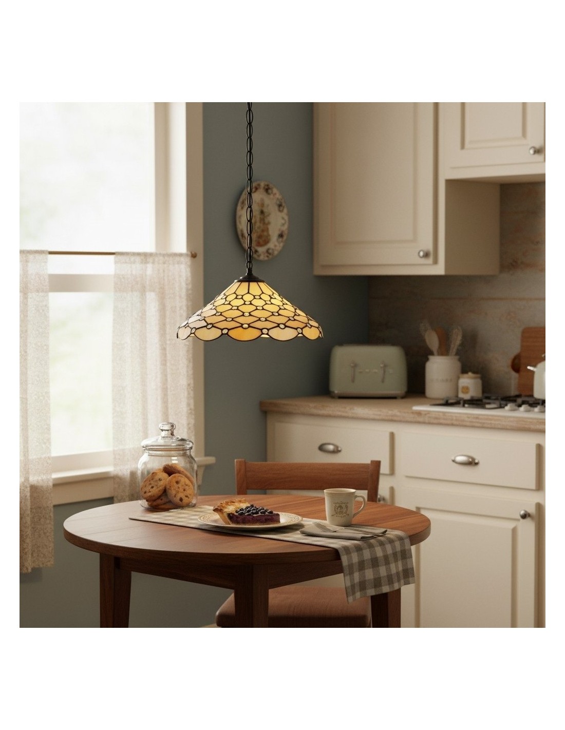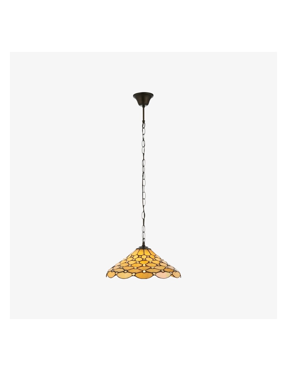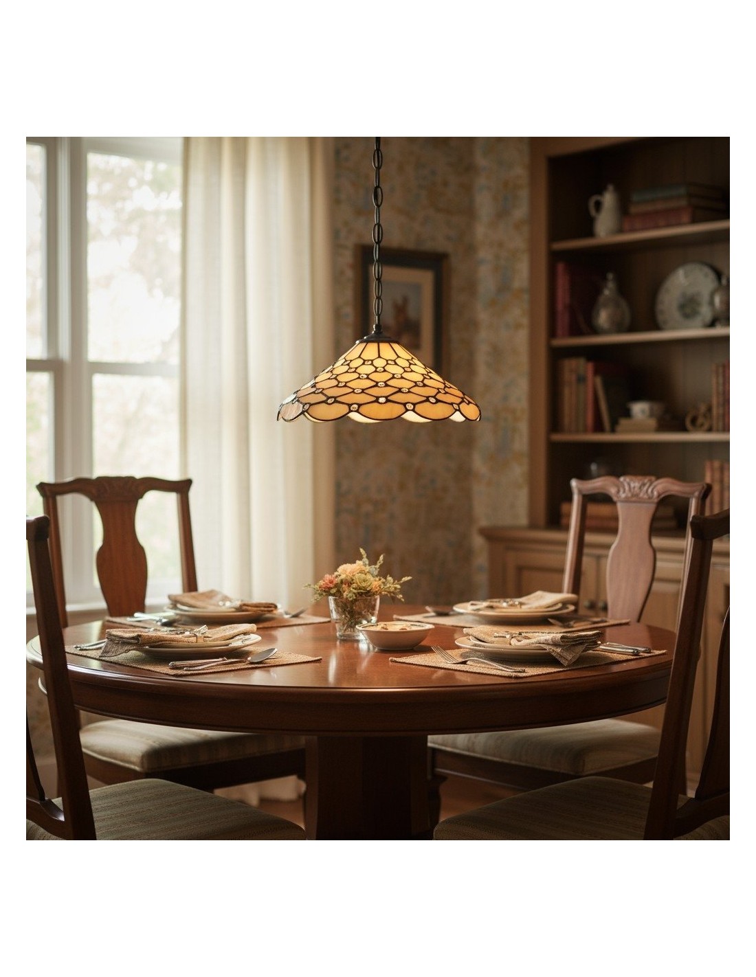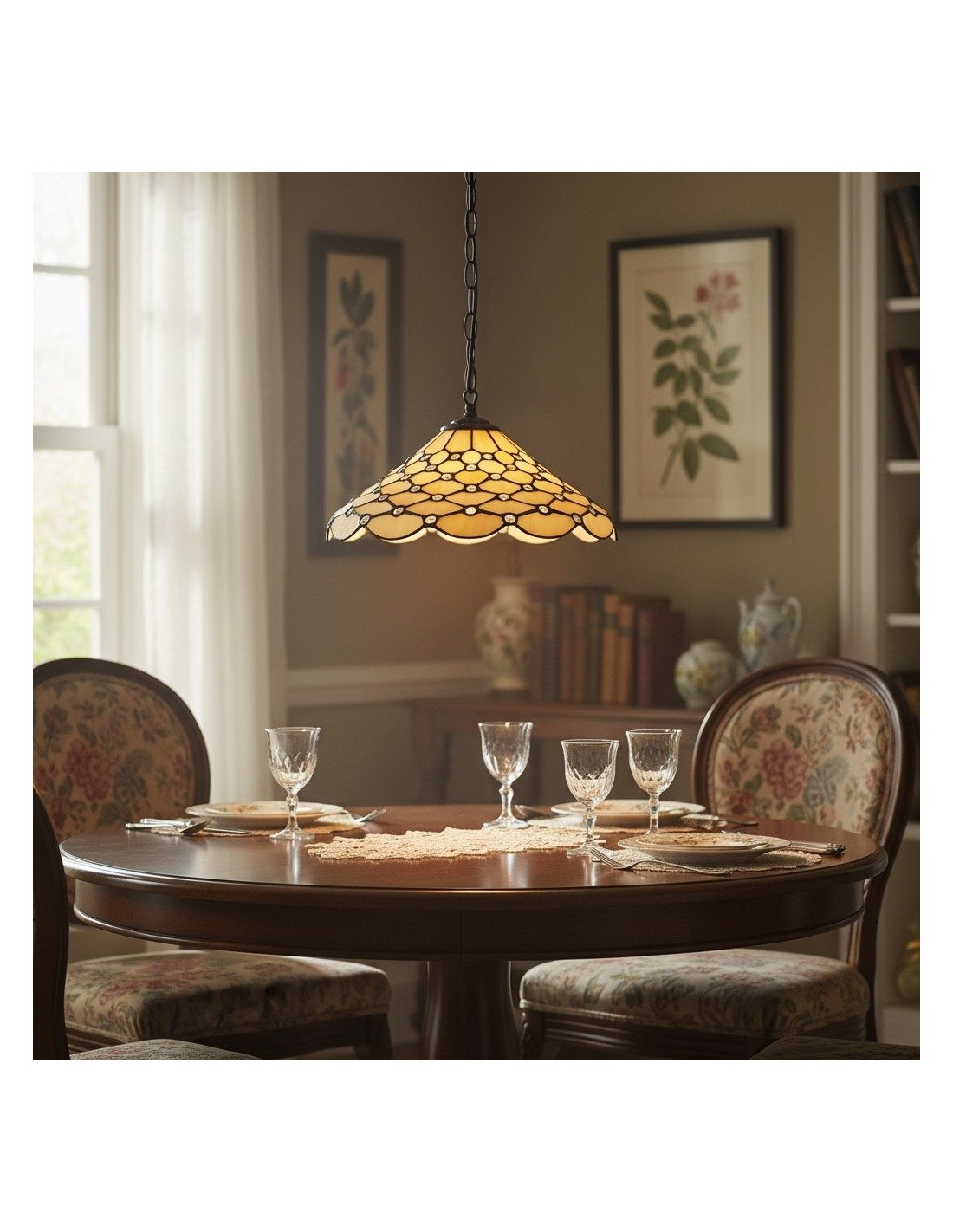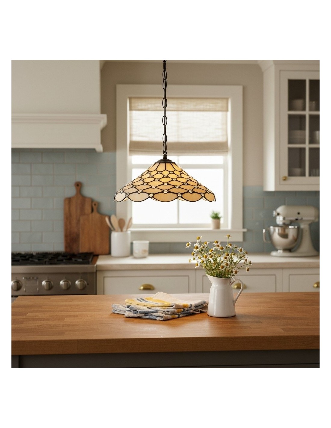 La suspension TF Pearl Tiffany est une lampe suspendue en verre, coiffée d'un dôme nacré qui diffuse une lumière chaude et douce. Les panneaux de verre et les détails soudés ajoutent une texture lumineuse, tandis que le pavillon métallique ajustable complète le style Tiffany vintage – idéal pour les tables à manger et les îlots de cuisine.