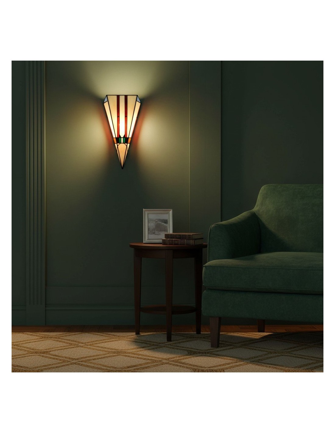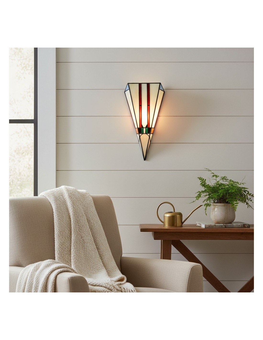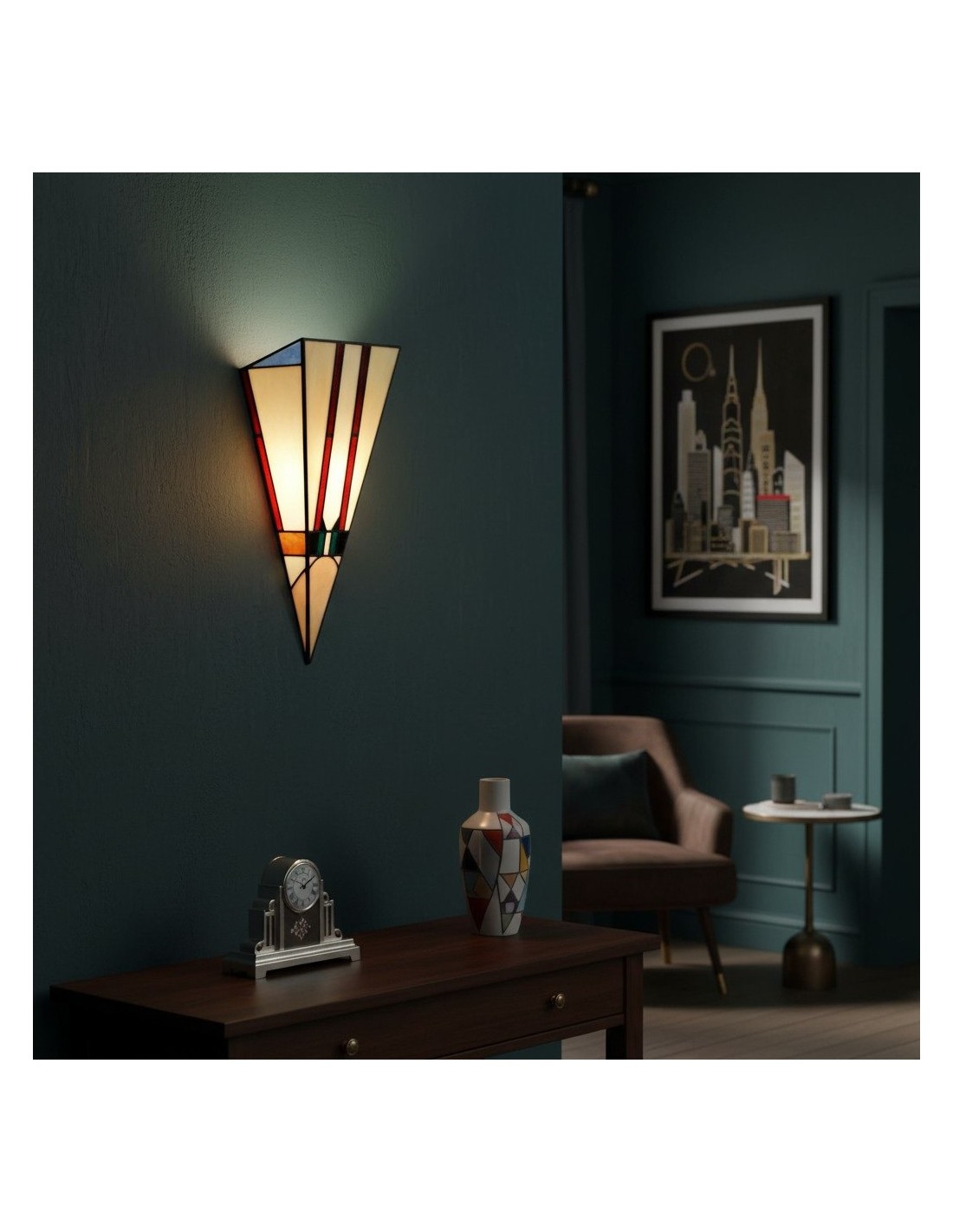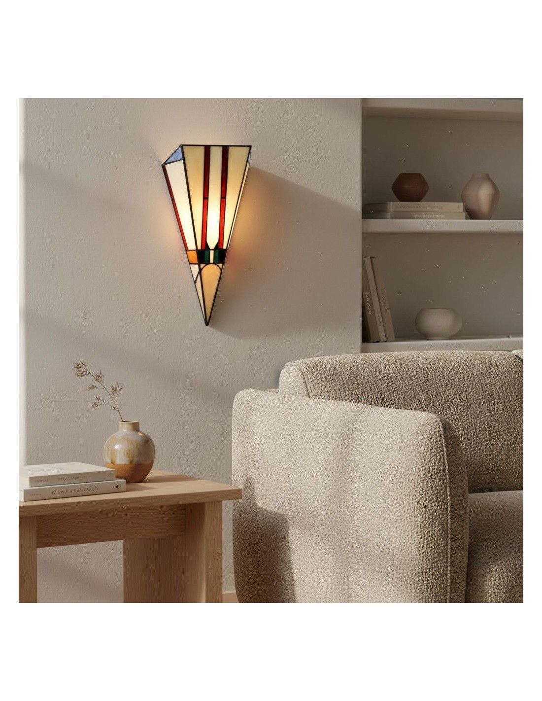 Cette applique murale est dotée d'un abat-jour en vitrail taillé à la main, aux tons chauds et riches, et aux lignes géométriques Art déco épurées. Idéale pour les couloirs, les chambres, les salons ou tout espace nécessitant une touche artistique.