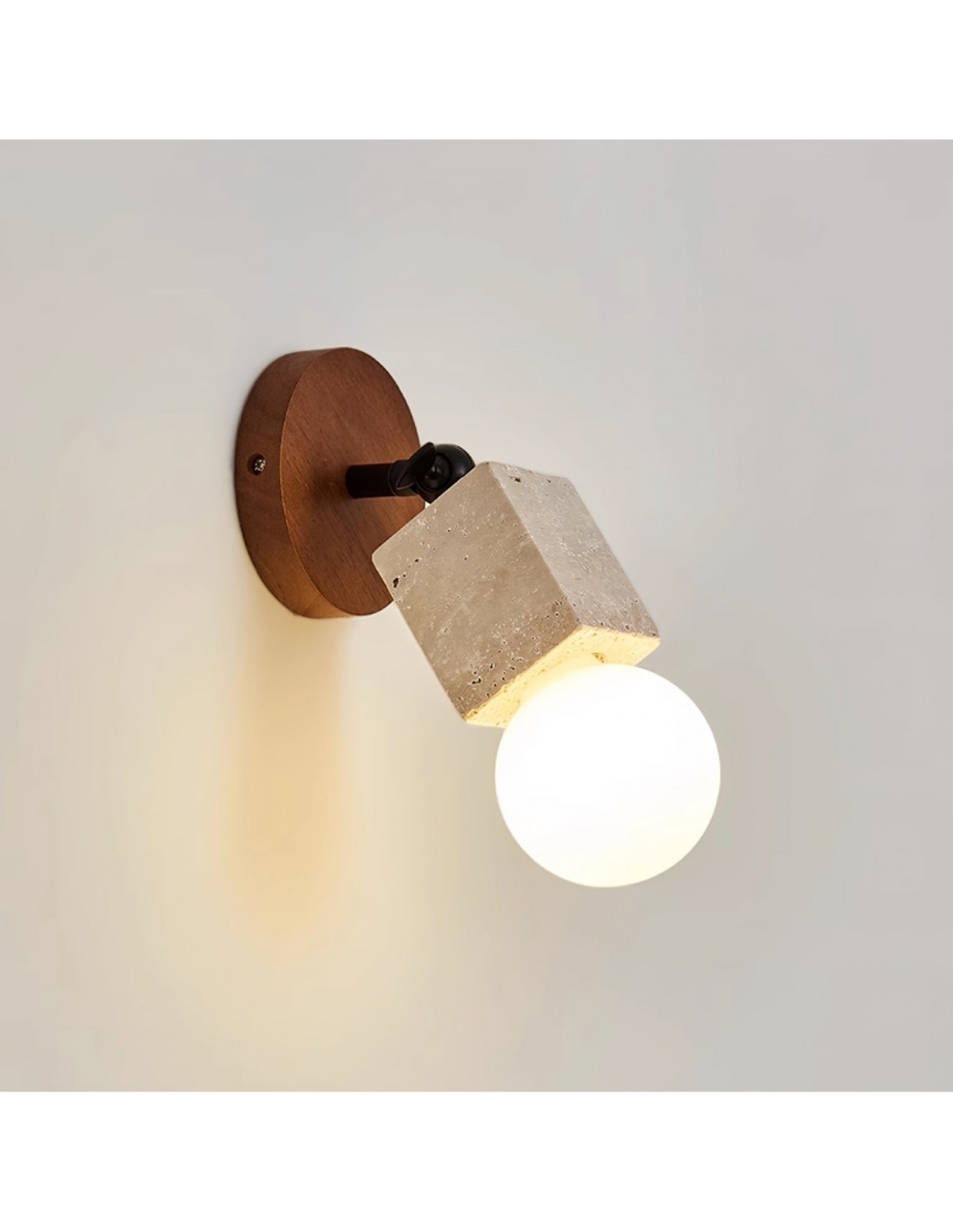 Dotée d'un mécanisme pivotant polyvalent, cette applique murale permet un réglage facile. L'abat-jour en pierre de travertin massif est associé à une base en bois, créant un contraste saisissant entre les textures organiques et le design épuré.