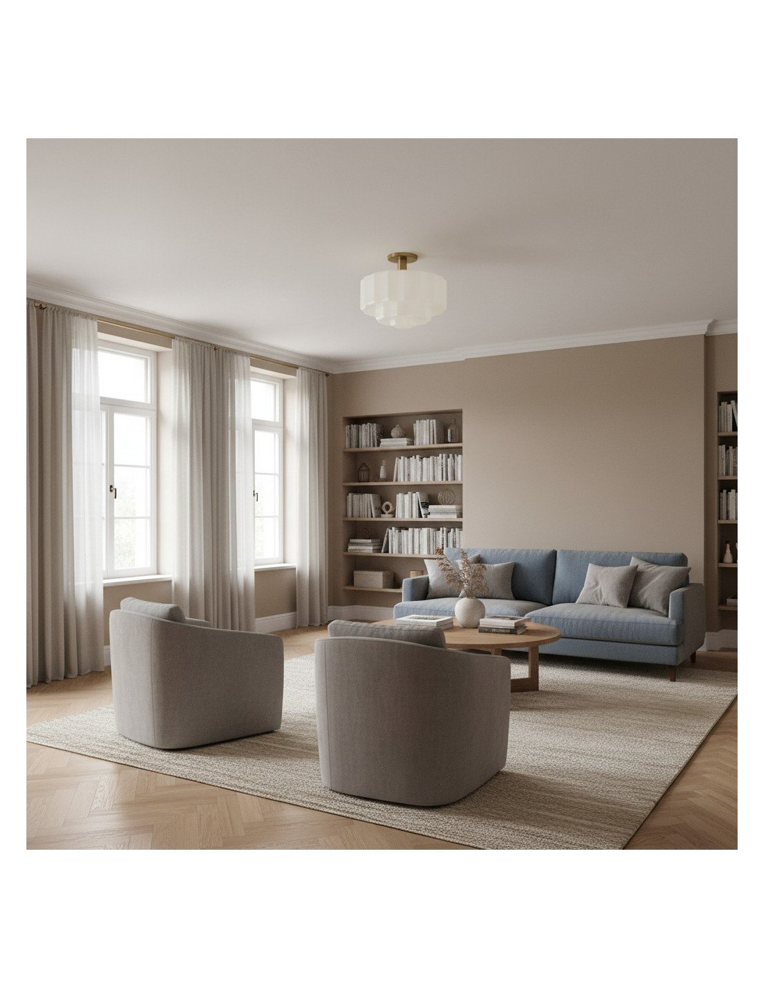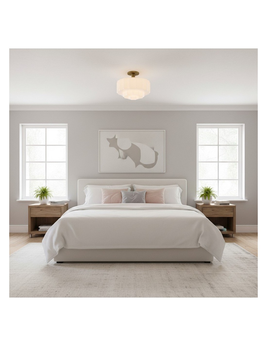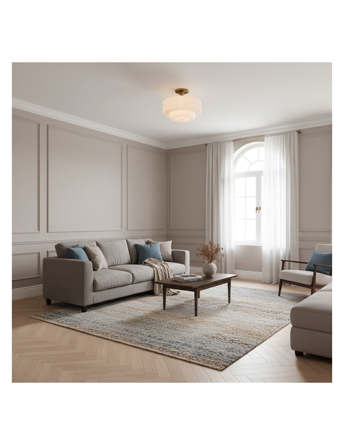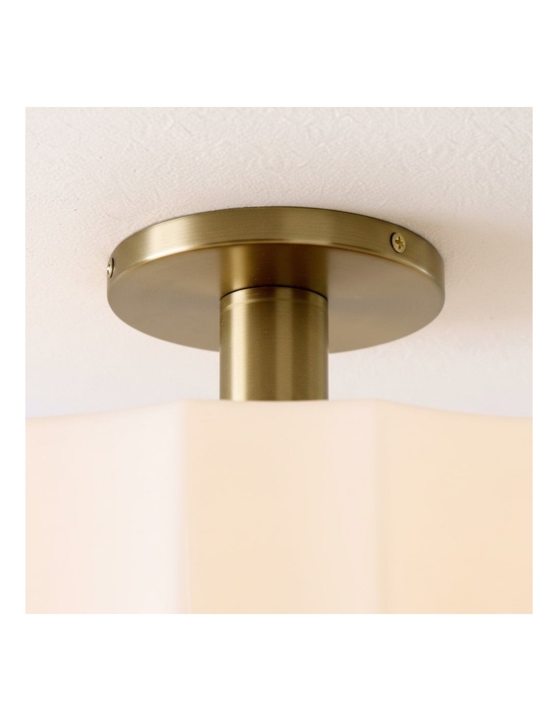 Ce plafonnier encastré est doté d'un abat-jour en verre d'inspiration Art déco, aux détails sculptés et facettés qui apportent profondeur et mouvement au plafond. Sa lumière chaude et diffuse sublime les chambres, les entrées et les pièces à vivre, tandis que sa structure métallique et ses lignes raffinées confèrent une élégance moderne et intemporelle à tout intérieur.