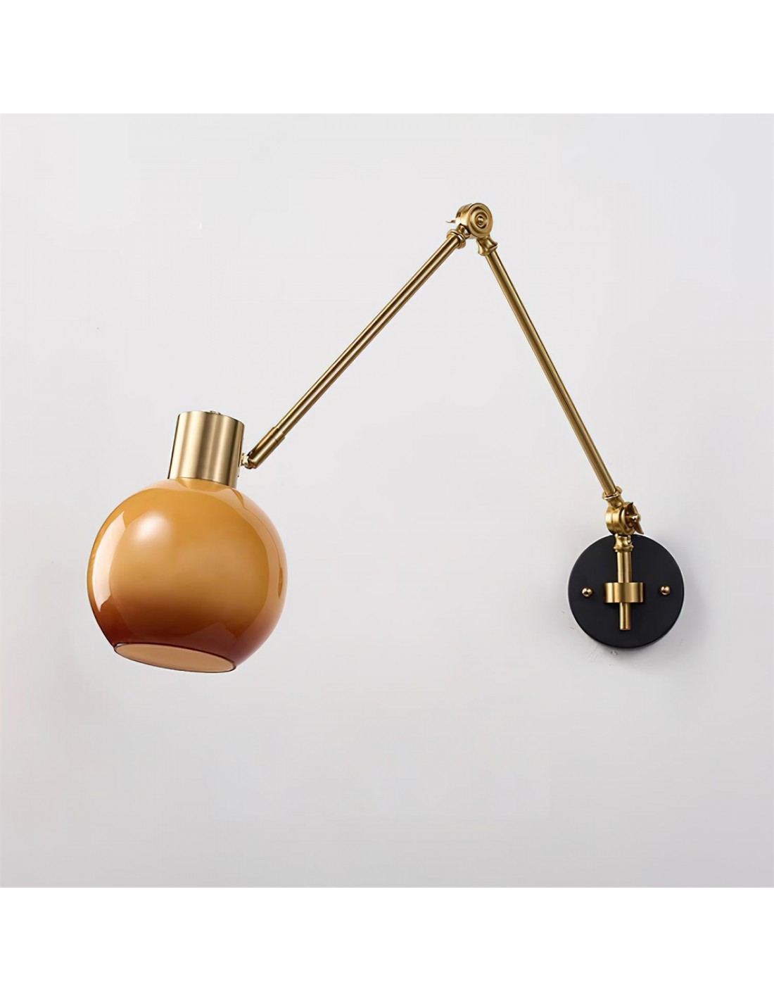 La lampe murale amovible de style rétro dégage un mélange de sophistication moderne et de style rétro. Dotée d'un bras doré élégant qui s'étend élégamment à partir d'un support noir chic, cette lampe est surmontée d'un globe ambré doucement brillant qui projette une lumière chaleureuse et accueillante. Parfaitement conçu pour la polyvalence, le bras articulé peut être ajusté pour diriger la lumière exactement là où elle est nécessaire, ce qui le rend idéal pour les coins de lecture, les espaces de travail ou comme accent élégant dans les espaces de vie.